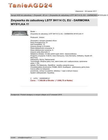 Utworzono : 02 marzec 2017 Sprzęt AGD do zabudowy > Zmywarki 45 cm > Zmywarka do zabudowy LSTF 9H114 CL EU - DARMOWA WYSYLKA !!! Zmywarka do zabudowy LSTF 9H114 CL EU - DARMOWA WYSYLKA !!! Model : Zmywarka do zabudowy LSTF 9H114 CL EU - DARMOWA WYSYLKA !!! Producent : Ariston Zmywarka z ukrytym panelem 45cm: Klasa Energetyczna: A+ Ilość kompletów: 10 Zużycie energii: 0,74 KW/h Klasa efektywności zmywania: A Klasa efektywności suszenia: A Zużycie wody (litry/cykl): 9 Natężenie dźwięku: 44 dbA (silnik super silent - bezszczotkowy) Programy zmywania: 9 (ECO, Auto Intensywny, Auto Normalny, Delikatny, Szybki 25', ShorTime, Intensywny, Nocny, Namaczanie) Technologie: Wnętrze pełny inox, alarm braku soli i nabłyszczacza, opóźnienie startu 1-12h, tabletki, Pół Załadunku, Start2End - świetlny wskaźnik pracy Charakterystyka strukturalna: PANEL INOX, DualSpace - podnoszony górny kosz, trzecia półka na nietypowe przedmioty, uchwyt na patelnie, składany 1 rząd w dolnym koszu) System zabezpieczeń: Aquastop 2 �LATA �GWARANCJI� Cena : 1.349,00 zł Brutto ( 1.096,75 zł Netto) Dostępność: Produkt dostępny w naszym sklepie od 27 wrzesień 2016 kontakt : - [email protected] Strona 1