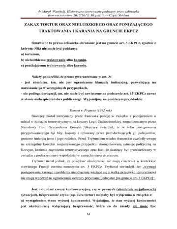 dr Marek Wasiński, Historyczno-teoretyczne podstawy praw człowieka (konwersatorium 2012/2013, 30 godzin) – Część Siódma ZAKAZ TORTUR ORAZ NIELUDZKIEGO ORAZ PONIŻAJĄCEGO TRAKTOWANIA I KARANIA NA GRUNCIE EKPCZ Omawiane tu prawo człowieka chronione jest na gruncie art. 3 EKPCz, zgodnie z którym: Nikt nie może być poddany: a) torturom, b) nieludzkiemu traktowaniu albo karaniu, c) poniżającemu traktowaniu albo karaniu. Należy podkreślić, że prawo gwarantowane w art. 3: - jest absolutne, tzn. nie jest ograniczone klauzulą imitacyjną, pozwalającą na naruszanie go w szczególnych przypadkach, - nie podlega derogacji, tzn. nie może być zawieszone na podstawie art. 15 EKPCz nawet w stanie niebezpieczeństwa publicznego. Wyjaśnijmy na poniższym przykładzie: Tomasi v. Francja (1992 rok) Skarżący został zatrzymany przez francuską policję w związku z podejrzeniem o udział w zamachu terrorystycznym na koszary Legii Cudzoziemskiej, zorganizowanym przez Narodowy Front Wyzwolenia Korsyki. Skarżący twierdził, że w toku postępowania przygotowawczego był bity, kopany i opluwany przez przesłuchujących go policjantów, grożono śmiercią jemu i jego rodzinie. Przed Trybunałem władze francuskie zwróciły uwagę na szczególny kontekst rozpatrywanego przypadku: skomplikowaną sytuację polityczną na Korsyce, istnienie zagrożenia terrorystycznego oraz fakt, że skarżący był przesłuchiwany w związku z podejrzeniem o współudział w zamachu terrorystycznym. Trybunał uznał jednak, że powyższe okoliczności nie mają znaczenia w kontekście stawianego Francji zarzutu naruszenia art. 3 EKPCz. Trybunał stwierdził, że: „wymogi postępowania karnego i problemy nieodłącznie wiążące się z walką przeciwko terroryzmowi nie mogą wpływać na ograniczanie ochrony przyznanej jednostce [na gruncie art. 3 EKPCz]”. Jest natomiast rzeczą kontrowersyjną, czy w pewnych (absolutnie wyjątkowych) sytuacjach, bezprawność czynu (np. aktu tortur) mogłaby być wyłączona w związku z: a) wystąpieniem stanu wyższej konieczności. Wyjaśnijmy, że stan wyższej konieczności jest okolicznością wyłączającą bezprawność, która co do zasady nie może być 52 dr Marek Wasiński, Historyczno-teoretyczne podstawy praw człowieka (konwersatorium 2012/2013, 30 godzin) – Część Siódma powoływana przez państwo jako okoliczność wyłączająca bezprawność jego aktu, chyba, że akt ten: (a) jest jedynym środkiem dla ochrony istotnego interesu państwa przed poważnym i bezpośrednim zagrożeniem, oraz (b) nie narusza w poważny sposób interesów państwa, państw bądź społeczności międzynarodowej, w stosunku do których naruszone zobowiązanie przysługuje. b) wystąpieniem sytuacji zagrożenia (distress). Wyjaśnijmy, że działanie w sytuacji zagrożenia to działanie, którego autor nie miał innej, racjonalnej możliwości dla ratowania życia swojego lub osób znajdujących się pod jego pieczą. Na tę okoliczność nie może powoływać się państwo, które przyczyniło się do powstania zagrożenia. Nie można powołać się na nią także wówczas, gdy dane działanie grozi sprowadzeniem porównywalnego lub większego zagrożenia. Najnowsze orzecznictwo Trybunału Strasburskiego zdaje się jednak wykluczać możliwość wyłączenia bezprawności tortur (ewentualnie: nieludzkiego lub poniżającego postępowania) nawet w takich skrajnych przypadkach: Gäfgen v Niemcy (2008 rok) Funkcjonariusze policji zagrozili zastosowaniem środków przymusu w celu wydobycia informacji od mężczyzny podejrzanego o uprowadzenie 11-letniego chłopca. W momencie przesłuchania istniało wysokie prawdopodobieństwo, że życie dziecka jest zagrożone. W orzeczeniu Trybunał stwierdził absolutny charakter zakazu wynikającego z art. 3, na którego obowiązywanie nie ma wpływu ani postępowanie jednostki, ani fakt, że zastosowanie tortur (lub innego działania zabronionego na gruncie komentowanego przepisu) może być konieczne w celu uzyskania informacji niezbędnych np. dla ratowania życia osób trzecich. Trybunał stwierdził naruszenie art. 3 Konwencji przez Niemcy. *** Zauważmy, że art. 3 Konwencji mówi o: - „torturach”, - „nieludzkim” traktowaniu i karaniu oraz o - „poniżającym” traktowaniu i karaniu. 53 dr Marek Wasiński, Historyczno-teoretyczne podstawy praw człowieka (konwersatorium 2012/2013, 30 godzin) – Część Siódma Różnica między tymi pojęciami wynika, w głównej mierze, ze skali intensywności zadanych cierpień. 1. Tortury są szczególną formą umyślnego, nieludzkiego traktowania, związaną z wyrządzaniem bardzo poważnego i dotkliwego cierpienia przez funkcjonariuszy państwowych. Ocena, czy próg „dotkliwości” został przekroczony, zależy od okoliczności sprawy (np. wiek i płeć ofiary, kondycja fizyczna oraz psychiczna, czas trwania stosowanego środka). Tortury zwykle podejmowane są w określonym celu, np. - uzyskania informacji, - zastraszenia (np. w celu zmuszenia jednostki, by powstrzymała się od prowadzenia określonej działalności), - ukarania, - wywarcia nacisku (np. w celu zmuszenia jednostki, by powstrzymała się od prowadzenia określonej działalności). Przyjrzyjmy się następującemu przypadkowi: Krastanov v. Bułgaria (2004 rok) W czasie policyjnej obławy przeprowadzonej w jednej z sofijskich restauracji skarżący został omyłkowo wzięty za groźnego przestępcę. Po obezwładnieniu został uderzony w głowę kolbą pistoletu oraz kilkukrotnie kopnięty w żebra. Trybunał był zdania, że skoro opisane środki nie zostały podjęte dla osiągnięcia jednego z opisanych wyżej celów, nie sposób przyjąć, by doszło do aktu tortur (Trybunał zakwalifikował natomiast działanie funkcjonariuszy jako „nieludzkie”). W orzecznictwie Trybunału za akty tortur uznawano natomiast np.: - zgwałcenie przez funkcjonariusza państwowego, - przymuszenie przez funkcjonariuszy