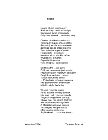 Studia Nasze studia przefrunęły Radość dały, młodość wzięły Beztroską świat przesłoniły Gdy czas stawał, …ten frant miły Chwilo, chwilko i chwileczko Teraz przycupnij choć deczko Rozjaśnij każde wspomnienie Zerknąć daj za przepierzenie Tam schowane potańcówki Pogawędki i pyskówki Kwaśne wino, słodkie tańce Wygibasy i łamańce Prywatki i imieniny Nasi chłopcy i dziewczyny Będzie jutro ... ale jutro Dziś, na pewno nie jest smutno Przyszłość jest mglistym obrazem Przytulmy się teraz, razem Twoje usta, bicie serca ... Pożądanie mózg przewierca Płci przeciwnych słodki czar Miłość, wielki boży dar W sesji rządziła nauka Po to student wiedzy szukał Nie spał i kuł …bez przesady Trzymał się głównej zasady, Chciał być, nie jakimś filistrem Ale skończonym Magistrem A Magister państwa proszę Też artystą jest po trosze Stąd i nasi absolwenci Są Markowi, …choć nie święci Wrzesień 2014 Tadeusz Antczak To były czasy To były czasy, to byli ludzie I MY tak słodcy, świeży, niewinni Spało się w biegu, żyło w ułudzie Sól życia, przyszłość pierwsi naiwni Młodość jest darem pięknym, okrutnym Z życia optymizm czerpie garściami Śmiechem wybucha wciąż bałamutnym Była, jest, będzie na zawsze z nami Żeński i męski się przyciągają Prawda to starsza chyba niż Świat I tak rok cały, nie tylko w maju, Kwitł był miłości czarowny kwiat Nasze wspomnienia, ważne wspomnienia Zawsze cudowne, przyjemność wielka, Dziś odżywają w odświętnych scenach Śmiechem radosnym budząc diabełka Kiedyś Pan Diabeł to firma była Zawsze gotowy, szeptał aż miło Z takiej porady krew się burzyła Miłość w porywach raziła siłą. Teraz Anioła szturchamy w skrzydło Zbudź się, popilnuj, ostatnia szansa Póki nadzieja wierze nie zbrzydła Ciągle nas życie prosi do tańca A gdzie ta prawda i jaka ona? Barwna, pachnąca przyjemnościami? A może skromna i zawstydzona? Czy to jest ważne? Jest tutaj z nami! Oto stęskniona Macierz Was wita Bukietem wspomnień że dech zapiera Drożynka życia mgiełką spowita, I my wciąż młodzi !a niech cholera. Łzy jak brylanty iskrzą się wkoło Darują uśmiech, szczęścia godzinę Tulą, czarują!, całują w czoło NAS ABSOLWENTÓW, WIELKĄ RODZINĘ! Wrzesień 2014 Tadeusz Antczak