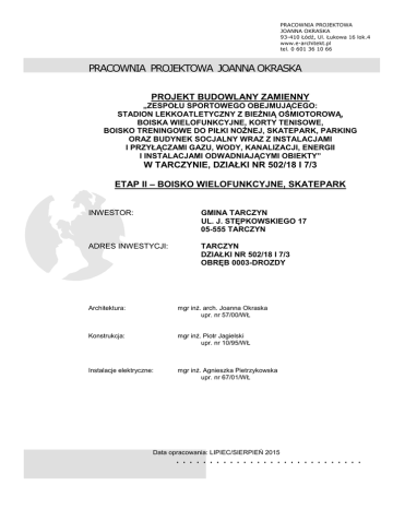 PRACOWNIA PROJEKTOWA JOANNA OKRASKA 93-410 Łódź, Ul. Łukowa 16 lok.4 www.e-architekt.pl tel. 0 601 36 10 66 PRACOWNIA PROJEKTOWA JOANNA OKRASKA PROJEKT BUDOWLANY ZAMIENNY „ZESPOŁU SPORTOWEGO OBEJMUJĄCEGO: STADION LEKKOATLETYCZNY Z BIEśNIĄ OŚMIOTOROWĄ, BOISKA WIELOFUNKCYJNE, KORTY TENISOWE, BOISKO TRENINGOWE DO PIŁKI NOśNEJ, SKATEPARK, PARKING ORAZ BUDYNEK SOCJALNY WRAZ Z INSTALACJAMI I PRZYŁĄCZAMI GAZU, WODY, KANALIZACJI, ENERGII I INSTALACJAMI ODWADNIAJĄCYMI OBIEKTY” W TARCZYNIE, DZIAŁKI NR 502/18 I 7/3 ETAP II – BOISKO WIELOFUNKCYJNE, SKATEPARK INWESTOR: GMINA TARCZYN UL. J. STĘPKOWSKIEGO 17 05-555 TARCZYN ADRES INWESTYCJI: TARCZYN DZIAŁKI NR 502/18 I 7/3 OBRĘB 0003-DROZDY Architektura: mgr inŜ. arch. Joanna Okraska upr. nr 57/00/WŁ Konstrukcja: mgr inŜ. Piotr Jagielski upr. nr 10/95/WŁ Instalacje elektryczne: mgr inŜ. Agnieszka Pietrzykowska upr. nr 67/01/WŁ Data opracowania: LIPIEC/SIERPIEŃ 2015 ............................ Strona 2 Spis zawartości: 1. 2. 3. 4. 5. 6. 7. 8. 9. 10. 11. 12. Strona tytułowa Spis zawartości Opis techniczny do projektu zagospodarowania działki Opis techniczny do projektu budowlanego boiska wielofunkcyjnego Opis techniczny do projektu budowlanego skateparku Opis techniczny do projektu budowlanego ciągów pieszo-jezdnych Plan BIOZ Oświadczenie projektanta architektury i konstrukcji Zaświadczenie z Izby Architektów projektanta Uprawnienia budowlane projektanta architektury Zaświadczenie z Izby InŜynierów konstruktora Uprawnienia budowlane projektanta konstrukcji str.1 str.2 str.3 str.6 str.9 str.23 str.25 str.28 str.29 str.30 str.31 str.32 Spis rysunków (od strony 34): 01/A 02/A 03/A 04/A 05/A 06/A 07/A 08/A 09/A 10/A 11/A 12/A Projekt zagospodarowania działki Rzut szczegółowy boiska wielofunkcyjnego Rzut szczegółowy skateparku Detal piłkochwytów Detal boiska do siatkówki Detal koszy do koszykówki Detal bramek do piłki ręcznej Detal nawierzchni ciągów pieszo-jezdnych Detal nawierzchni ciągów skateparku Detal nawierzchni ciągu pieszego Szczegóły nawierzchni boiska i ich łączenie Ławka skateparkowa Części instalacyjne: Rysunki i opis w projekcie elektrycznym. 1:500 1:100 1:100 1:100 1:100/10 1:100 1:100 1:10 1:10 1:10 1:10 Strona 3 OPIS TECHNICZNY DO PROJEKTU ZAMIENNEGO ZAGOSPODAROWANIA TERENU KOMPLEKSU SPORTOWEGO W TARCZYNIE, DZIAŁKI NR 502/18 I 7/3, OBRĘB 0003 - DROZDY 1. PRZEDMIOT OPRACOWANIA Przedmiotem niniejszego opracowania jest projekt budowlany boiska wielofunkcyjnego o nawierzchni poliuretanowej, skateparku betonowego, ciągów pieszych i pieszo-jezdnych z nawierzchnią z kostki betonowej i instalacja elektryczna z oświetleniem terenu. PROJEKT STANOWI FRAGMENT ZAMIENNEGO ZAGOSPODAROWANIA TERENU – ZMIANA USYTUOWANIA SKATEPARKU I BOISKA. 2. PODSTAWA OPRACOWANIA - Ustalenia z Inwestorem Zaświadczenie o przeznaczeniu terenu Aktualne normy i przepisy budowlane i sanitarne oraz BHP i ppoŜ Aktualne normy i przepisy branŜowe 3. STAN ISTNIEJĄCY ZAGOSPODAROWANIA DZIAŁKI Teren przeznaczony pod zabudowę stanowią działki nr 502/18 i 7/3, obręb 0003 - Drozdy. Ich powierzchnia wynosi ca 58 931,00m2. Działki są częściowo zadrzewione i stanowią wg „Zaświadczenia o przeznaczeniu terenu” wydanego przez Gminę Tarczyn w dniu 05.08.2009r. podstawowe tereny zieleni parkowej, sportu i rekreacji z dopuszczeniem usług kultury. Działka jest zagospodarowana wykonanymi w I etapie inwestycji placem zabaw, parkingiem i ciągiem pieszym i nieogrodzona. Wjazd na działkę 7/3 z ulicy wewnątrzosiedlowej publicznej oraz na działkę 502/18 z ciągu jezdnego od strony północnej – zaznaczono na planie zagospodarowania. Teren opada do rzeczki Tarczynki i poziom projektowanych boisk i skateparku zlokalizowano około 1,0m nad poziomem terenu, to jest 138,80m n.p.m. Na terenach projektowanych nie ma kanalizacji deszczowej. ZMIANY WYNIKAJĄ ZE ZMIENIAJĄCYCH SIĘ W CZASIE POTRZEB SPOŁECZNYCH. Warunki gruntowo-wodne (hydrogeologiczne). Badana działka, ze względu na płytkie połoŜenie zwierciadła wody gruntowej ma charakter podmokły. W zakresie głębokości dokonanego rozpoznania stwierdzono występowanie jednego poziomu wodonośnego w obrębie piasków oraz przypowierzchniowej warstwy gleby, na całym obszarze badanej działki. Poziom wody gruntowej posiada charakter swobodny Strona 4 i występuje bardzo płytko poniŜej powierzchni działki, w zakresie głębokości 0,15 do 0,57 m p.p.t., tj. w zakresie rzędnych około 136,4-137,9m n.p.m. Maksymalny, sezonowy zakres wahań poziomu wody gruntowej, moŜe wynosić około ±0,5m. 4. PROJEKTOWANA ZABUDOWA I ZAGOSPODAROWANIE DZIAŁKI Na terenie działki planuje się budowę w II etapie inwestycji boiska wielofunkcyjnego o nawierzchni poliuretanowej, skateparku, ciągów pieszych i pieszo-jezdnych z nawierzchnią z kostki betonowej i instalacji elektrycznej oświetlenia terenu. Zasilanie instalacji elektrycznej wg warunków gestora z dnia 03.11.2009r. wydanych przez PGE Dystrybucja Warszawa –Teren Sp. z o.o. Pozostałe zagospodarowanie bez zmian. 5. ZESTAWIENIE POWIERZCHNI - powierzchnia działki - powierzchnia ciągów pieszych - powierzchnia boiska wielofunkcyjnego - powierzchnia skateparku - 58 931,00m2 - ca 568,31 m2 - ca 1561,38 m2 - ca 1147,10 m2 6. OCHRONA ZABYTKÓW Projektowana zabudowa i działka nie podlega ochronie konserwatorskiej. 7. WPŁYW EKSPLOATACJI GÓRNICZEJ NA DZIAŁKĘ Działka nie znajduje się w obszarze eksploatacji górniczej i nie podlega szkodom górniczym. 8. INFORMACJA O CHARAKTERZE I CECHACH ISTNIEJĄCYCH I PRZEWIDZIANYCH ZAGROśEŃ DLA ŚRODOWISKA I HIGIENY ZDROWIA. Inwestycja nie spowoduje zanieczyszczeń gleby i wód gruntowych i nie pogorszy ich jakości, nie jest wymagana na ten rodzaj inwestycji decyzja o Środowiskowych uwarunkowaniach na realizację przedsięwzięcia. 9. OCENA GEOTECHNICZNA Warunki gruntowe wg rozporządzenia Min. Infrastruktury kategorii „I”, warunki gruntowe skomplikowane. Główny