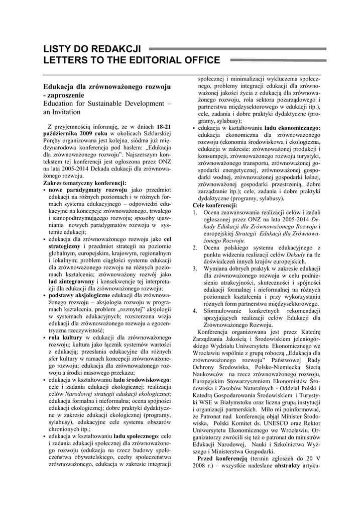 LISTY DO REDAKCJI LETTERS TO THE EDITORIAL OFFICE Edukacja dla zrównowaŜonego rozwoju - zaproszenie Education for Sustainable Development – an Invitation Z przyjemnością informuję, Ŝe w dniach 18-21 października 2009 roku w okolicach Szklarskiej Poręby organizowana jest kolejna, siódma juŜ międzynarodowa konferencja pod hasłem: „Edukacja dla zrównowaŜonego rozwoju”. Najszerszym kontekstem tej konferencji jest ogłoszona przez ONZ na lata 2005-2014 Dekada edukacji dla zrównowaŜonego rozwoju. Zakres tematyczny konferencji: nowe paradygmaty rozwoju jako przedmiot edukacji na róŜnych poziomach i w róŜnych formach systemu edukacyjnego – odpowiedzi edukacyjne na koncepcje zrównowaŜonego, trwałego i samopodtrzymującego rozwoju; sposoby ujawniania nowych paradygmatów rozwoju w systemie edukacji; edukacja dla zrównowaŜonego rozwoju jako cel strategiczny i przedmiot strategii na poziomie globalnym, europejskim, krajowym, regionalnym i lokalnym; problem ciągłości systemu edukacji dla zrównowaŜonego rozwoju na róŜnych poziomach kształcenia; zrównowaŜony rozwój jako ład zintegrowany i konsekwencje tej interpretacji dla edukacji dla zrównowaŜonego rozwoju; podstawy aksjologiczne edukacji dla zrównowaŜonego rozwoju – aksjologia rozwoju w programach kształcenia, problem „rozmytej” aksjologii w systemach edukacyjnych; rozszerzona wizja edukacji dla zrównowaŜonego rozwoju a egocentryczna rzeczywistość; rola kultury w edukacji dla zrównowaŜonego rozwoju; kultura jako łącznik systemów wartości z edukacją; przesłania edukacyjne dla róŜnych sfer kultury w ramach koncepcji zrównowaŜonego rozwoju; edukacja dla zrównowaŜonego rozwoju a środki masowego przekazu; edukacja w kształtowaniu ładu środowiskowego: cele i zadania edukacji ekologicznej; realizacja celów Narodowej strategii edukacji ekologicznej; edukacja formalna i nieformalna; ocena spójności edukacji ekologicznej; dobre praktyki dydaktyczne w zakresie edukacji ekologicznej (programy, sylabusy), edukacyjne cele systemu obszarów chronionych itp.; edukacja w kształtowaniu ładu społecznego: cele i zadania edukacji społecznej dla zrównowaŜonego rozwoju (edukacja na rzecz budowy społeczeństwa obywatelskiego, cechy społeczeństwa zrównowaŜonego, edukacja w zakresie integracji społecznej i minimalizacji wykluczenia społecznego, problemy integracji edukacji dla zrównowaŜonej jakości Ŝycia z edukacją dla zrównowaŜonego rozwoju, rola sektora pozarządowego i partnerstwa międzysektorowego w edukacji itp.), cele, zadania i dobre praktyki dydaktyczne (programy, sylabusy); edukacja w kształtowaniu ładu ekonomicznego: edukacja ekonomiczna dla zrównowaŜonego rozwoju (ekonomia środowiskowa i ekologiczna, edukacja w zakresie: zrównowaŜonej produkcji i konsumpcji, zrównowaŜonego rozwoju turystyki, zrównowaŜonego transportu, zrównowaŜonej gospodarki energetycznej, zrównowaŜonej gospodarki wodnej, zrównowaŜonej gospodarki leśnej, zrównowaŜonej gospodarki przestrzenią, dobre zarządzanie itp.); cele, zadania i dobre praktyki dydaktyczne (programy, sylabusy). Cele konferencji: 1. Ocena zaawansowania realizacji celów i zadań ogłoszonej przez ONZ na lata 2005-2014 Dekady Edukacji dla ZrównowaŜonego Rozwoju i europejskiej Strategii Edukacji dla ZrównowaŜonego Rozwoju. 2. Ocena polskiego systemu edukacyjnego z punktu widzenia realizacji celów Dekady na tle doświadczeń innych krajów europejskich. 3. Wymiana dobrych praktyk w zakresie edukacji dla zrównowaŜonego rozwoju w celu podniesienia atrakcyjności, skuteczności i spójności edukacji formalnej i nieformalnej na róŜnych poziomach kształcenia i przy wykorzystaniu róŜnych form partnerstwa międzysektorowego. 4. Sformułowanie konkretnych rekomendacji sprzyjających realizacji celów Edukacji dla ZrównowaŜonego Rozwoju. Konferencja organizowana jest przez Katedrę Zarządzania Jakością i Środowiskiem jeleniogórskiego Wydziału Uniwersytetu Ekonomicznego we Wrocławiu wspólnie z grupą roboczą „Edukacja dla zrównowaŜonego rozwoju” Państwowej Rady Ochrony Środowiska, Polsko-Niemiecką Siecią Naukowców na rzecz zrównowaŜonego rozwoju, Europejskim Stowarzyszeniem Ekonomistów Środowiska i Zasobów Naturalnych - Oddział Polski i Katedrą Gospodarowania Środowiskiem i Turystyki WSE w Białymstoku oraz liczna grupą instytucji i organizacji partnerskich. Miło mi poinformować, Ŝe Patronat nad konferencją objął Minister Środowiska, Polski Komitet ds. UNESCO oraz Rektor Uniwersytetu Ekonomicznego we Wrocławiu. Organizatorzy zwrócili się teŜ o patronat do ministrów Edukacji Narodowej, Nauki i Szkolnictwa WyŜszego i Ministerstwa Gospodarki. Przed konferencją (termin zgłoszeń do 20 V 2008 r.) – wszystkie nadesłane abstrakty artyku- 140 Problemy Ekorozwoju/Problems of Sustainable Development 2/2009 łów problemowych opublikowane będą w specjalnym numerze renomowanego czasopisma „Problemy Ekologii”. Po konferencji - wydane będą w formie recenzowanego wydawnictwa zwartego materiały, przedstawiające jej wyniki merytoryczne. W imieniu organizatorów gorąco zachęcam do wzięcia udziału w Konferencji, która na pewno dostarczy wiele okazji do wymiany myśli i doświadczeń. Odbędzie się ona w przepięknym miejscu Karkonoszy – w obiektach konferencyjnych Hotelu „Las”, który zaoferował nam swe usługi po bardzo przystępnych cenach i w sposób gwarantujący bardzo dobre warunki do pracy i wypoczynku. Szczegółowe informacje moŜna odnaleźć na stronie internetowej konferencji dostępnej pod adresem: http://wgrit.ae.jgora.pl/zj, skrzynka pocztowa konferencji: [email protected]. Przewodniczący Komitetu Organizacyjnego prof. dr hab. Tadeusz Borys e-mail: [email protected] PrzezwycięŜyć globalny kryzys Prezentacja wniosków Forum Informacyjnego Społeczeństwa ZrównowaŜonego Rozwoju1 To Overcome the Global Crisis (Towards Sustainable Develo