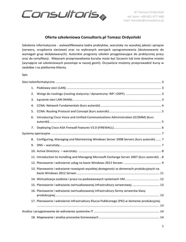 dr Tomasz Ordysiński tel. kom. +48 601 477 468 mail: [email protected] Oferta szkoleniowa Consultoris.pl Tomasz Ordysiński Szkolenia informatyczne - wykwalifikowana kadra praktyków, warsztaty na wysokiej jakości sprzęcie (serwery, urządzenia sieciowe) oraz na wybranych wersjach oprogramowania (dostosowanie do wymagań grup dedykowanych). Autorskie programy szkoleń przygotowujące do praktycznej pracy oraz do certyfikacji. Miejscem przeprowadzenia kursów może być Szczecin lub inne dowolne miasto (wynajęcie sal szkoleniowych pozostaje w naszej gestii). Oczywiście możemy przeprowadzić kursy w siedzibie i na platformie Klienta. Spis Sieci teleinformatyczne. .......................................................................................................................... 3 1. Podstawy sieci (LAN). ............................................................................................................. 3 2. Wstęp do routingu (routing statyczny i dynamiczny: RIP i OSPF). ......................................... 3 3. Łączenie sieci LAN (WAN). ...................................................................................................... 3 4. CCNA: Network Fundamentals (kurs autorski)....................................................................... 4 5. CCNA: Routing Protocol and Concept (kurs autorski) ............................................................ 5 6. Introducing Cisco Voice and Unified Communications Administration (ICOMM) (kurs autorski).................................................................................................................................. 5 7. Deploying Cisco ASA Firewall Features V2.0 (FIREWALL) ....................................................... 6 Systemy operacyjne. ............................................................................................................................... 7 8. Configuring, Managing and Maintaining Windows Server 2008 Servers (kurs autorski) ...... 7 9. DNS – warsztaty...................................................................................................................... 7 10. Active Directory – warsztaty. ................................................................................................ 8 11. Introduction to Installing and Managing Microsoft Exchange Server 2007 (kurs autorski) .. 8 12. Planowanie i wdrożenie usług na bazie Windows 2012 Serwer. ........................................... 9 13. Planowanie i wdrażanie rozwiązań wysokiej dostępności w domenach produkcyjnych na bazie Windows 2012 Serwer. ............................................................................................... 11 14. Wirtualizacja osobista i praca na podstawowych systemach VM. ....................................... 12 15. Planowanie i wdrażanie zwirtualizowanej infrastruktury serwerowej. ............................... 13 16. Planowanie i wdrażanie zwirtualizowanej infrastruktury farmy serwerów klasy produkcyjnej. ........................................................................................................................ 13 17. Planowanie i wdrożenie Infrastruktury Klucza Publicznego (PKI) w domenie produkcyjnej. .............................................................................................................................................. 13 Analiza i przygotowanie do wdrożenia systemów IT ............................................................................ 14 18. Mapowanie i analiza procesów biznesowych ...................................................................... 14 1 dr Tomasz Ordysiński tel. kom. +48 601 477 468 mail: [email protected] 19. Inżynieria wymagań.............................................................................................................. 14 20. Zarządzanie projektami ........................................................................................................ 15 Obsługa komputera ............................................................................................................................... 16 21. Przygotowanie do egzaminów ECDL - obsługa komputera .................................................. 16 22. Przygotowanie do egzaminów ECDL - edytor tekstu............................................................ 16 23. Przygotowanie do egzaminów ECDL - arkusz kalkulacyjny poziom podstawowy ................ 16 24. Przygotowanie do egzaminów ECDL - arkusz kalkulacyjny poziom zaawansowany ............ 16 25. Przygotowanie do egzaminów ECDL - bazy danych ............................................................. 17 26. Przygotowanie do egzaminów ECDL - prezentacje multimedialne ...................................... 17 27. Przygotowanie do egzaminów ECDL - przeglądanie stron internetowych i komunikacja w Internecie ............................................................................................................................. 17 Moduł medyczny ................................................................................................................................... 18 28. KS-SOMED moduł Rejestracja .............................................................................................. 18 29. KS-SOMED – moduł Gabinet ................................................................................................ 18 30. Prawne zagadnienia NFZ ...................................................................................................... 19 2 dr Tomasz Ordysiński tel. kom. +48 601 477 468 mail: [email protected] Sieci teleinformatyczne. Nasi trenerzy to eksperci zakresie urządzeń sieciowych Cisco (przełączniki i routery) prowadzący wiele edycji szkoleń ICND1, ICND2, IINS, QoS, VOICE, SWITCH, ROUTE i TSHOOT. Praktycy w zakresie projektowania i instalacji sieci komputerowych. Ich umiejętności potwierdzone są licznymi certyfikatami CISCO. Podstawy sieci (LAN). Rodzaj: szkolenie t