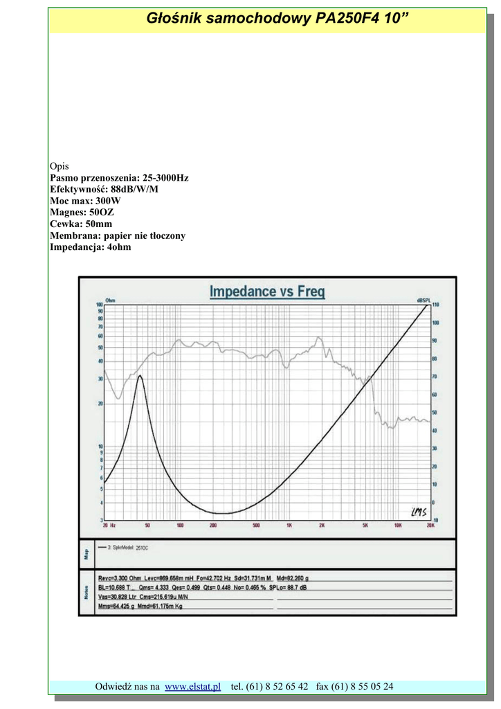 Głośnik samochodowy PA250F4 10” Opis Pasmo przenoszenia: 25-3000Hz Efektywność: 88dB/W/M Moc max: 300W Magnes: 50OZ Cewka: 50mm Membrana: papier nie tłoczony Impedancja: 4ohm Odwiedź nas na www.elstat.pl tel. (61) 8 52 65 42 fax (61) 8 55 05 24