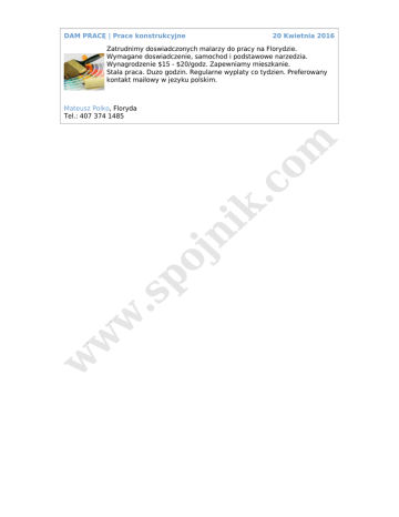 DAM PRACĘ | Prace konstrukcyjne 20 Kwietnia 2016 Zatrudnimy doswiadczonych malarzy do pracy na Florydzie. Wymagane doswiadczenie, samochod i podstawowe narzedzia. Wynagrodzenie $15 - $20/godz. Zapewniamy mieszkanie. Stala praca. Duzo godzin. Regularne wyplaty co tydzien. Preferowany kontakt mailowy w jezyku polskim. w w w .s po jn ik .c o m Mateusz Polko, Floryda Tel.: 407 374 1485