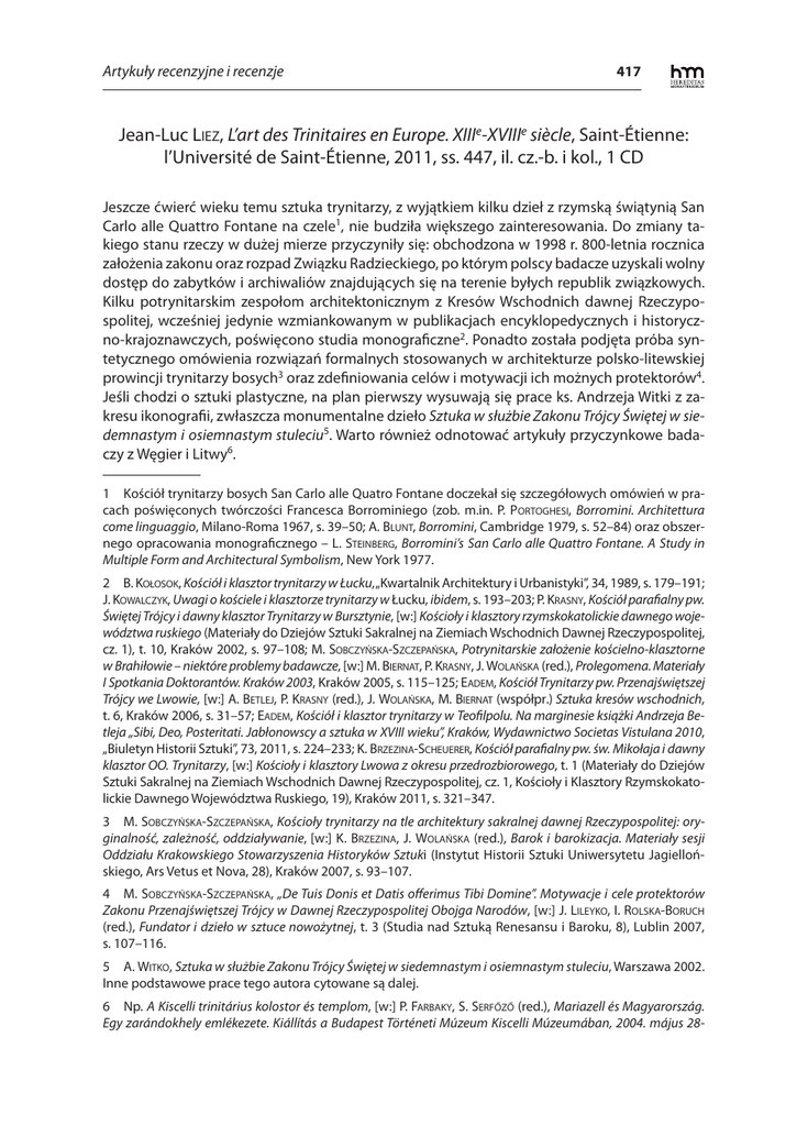Artykuły recenzyjne i recenzje 417 Jean-Luc LIEZ, L’art des Trinitaires en Europe. XIIIe-XVIIIe siècle, Saint-Étienne: l’Université de Saint-Étienne, 2011, ss. 447, il. cz.-b. i kol., 1 CD Jeszcze ćwierć wieku temu sztuka trynitarzy, z wyjątkiem kilku dzieł z rzymską świątynią San Carlo alle Quattro Fontane na czele1, nie budziła większego zainteresowania. Do zmiany takiego stanu rzeczy w dużej mierze przyczyniły się: obchodzona w 1998 r. 800-letnia rocznica założenia zakonu oraz rozpad Związku Radzieckiego, po którym polscy badacze uzyskali wolny dostęp do zabytków i archiwaliów znajdujących się na terenie byłych republik związkowych. Kilku potrynitarskim zespołom architektonicznym z Kresów Wschodnich dawnej Rzeczypospolitej, wcześniej jedynie wzmiankowanym w publikacjach encyklopedycznych i historyczno-krajoznawczych, poświęcono studia monograficzne2. Ponadto została podjęta próba syntetycznego omówienia rozwiązań formalnych stosowanych w architekturze polsko-litewskiej prowincji trynitarzy bosych3 oraz zdefiniowania celów i motywacji ich możnych protektorów4. Jeśli chodzi o sztuki plastyczne, na plan pierwszy wysuwają się prace ks. Andrzeja Witki z zakresu ikonografii, zwłaszcza monumentalne dzieło Sztuka w służbie Zakonu Trójcy Świętej w siedemnastym i osiemnastym stuleciu5. Warto również odnotować artykuły przyczynkowe badaczy z Węgier i Litwy6. 1 Kościół trynitarzy bosych San Carlo alle Quatro Fontane doczekał się szczegółowych omówień w pracach poświęconych twórczości Francesca Borrominiego (zob. m.in. P. PORTOGHESI, Borromini. Architettura come linguaggio, Milano-Roma 1967, s. 39–50; A. BLUNT, Borromini, Cambridge 1979, s. 52–84) oraz obszernego opracowania monograficznego – L. STEINBERG, Borromini’s San Carlo alle Quattro Fontane. A Study in Multiple Form and Architectural Symbolism, New York 1977. 2 B. KOŁOSOK, Kościół i klasztor trynitarzy w Łucku, „Kwartalnik Architektury i Urbanistyki”, 34, 1989, s. 179–191; J. KOWALCZYK, Uwagi o kościele i klasztorze trynitarzy w Łucku, ibidem, s. 193–203; P. KRASNY, Kościół parafialny pw. Świętej Trójcy i dawny klasztor Trynitarzy w Bursztynie, [w:] Kościoły i klasztory rzymskokatolickie dawnego województwa ruskiego (Materiały do Dziejów Sztuki Sakralnej na Ziemiach Wschodnich Dawnej Rzeczypospolitej, cz. 1), t. 10, Kraków 2002, s. 97–108; M. SOBCZYŃSKA-SZCZEPAŃSKA, Potrynitarskie założenie kościelno-klasztorne w Brahiłowie – niektóre problemy badawcze, [w:] M. BIERNAT, P. KRASNY, J. WOLAŃSKA (red.), Prolegomena. Materiały I Spotkania Doktorantów. Kraków 2003, Kraków 2005, s. 115–125; EADEM, Kościół Trynitarzy pw. Przenajświętszej Trójcy we Lwowie, [w:] A. BETLEJ, P. KRASNY (red.), J. WOLAŃSKA, M. BIERNAT (współpr.) Sztuka kresów wschodnich, t. 6, Kraków 2006, s. 31–57; EADEM, Kościół i klasztor trynitarzy w Teofilpolu. Na marginesie książki Andrzeja Betleja „Sibi, Deo, Posteritati. Jabłonowscy a sztuka w XVIII wieku”, Kraków, Wydawnictwo Societas Vistulana 2010, „Biuletyn Historii Sztuki”, 73, 2011, s. 224–233; K. BRZEZINA-SCHEUERER, Kościół parafialny pw. św. Mikołaja i dawny klasztor OO. Trynitarzy, [w:] Kościoły i klasztory Lwowa z okresu przedrozbiorowego, t. 1 (Materiały do Dziejów Sztuki Sakralnej na Ziemiach Wschodnich Dawnej Rzeczypospolitej, cz. 1, Kościoły i Klasztory Rzymskokatolickie Dawnego Województwa Ruskiego, 19), Kraków 2011, s. 321–347. 3 M. SOBCZYŃSKA-SZCZEPAŃSKA, Kościoły trynitarzy na tle architektury sakralnej dawnej Rzeczypospolitej: oryginalność, zależność, oddziaływanie, [w:] K. BRZEZINA, J. WOLAŃSKA (red.), Barok i barokizacja. Materiały sesji Oddziału Krakowskiego Stowarzyszenia Historyków Sztuki (Instytut Historii Sztuki Uniwersytetu Jagiellońskiego, Ars Vetus et Nova, 28), Kraków 2007, s. 93–107. 4 M. SOBCZYŃSKA-SZCZEPAŃSKA, „De Tuis Donis et Datis offerimus Tibi Domine”. Motywacje i cele protektorów Zakonu Przenajświętszej Trójcy w Dawnej Rzeczypospolitej Obojga Narodów, [w:] J. LILEYKO, I. ROLSKA-BORUCH (red.), Fundator i dzieło w sztuce nowożytnej, t. 3 (Studia nad Sztuką Renesansu i Baroku, 8), Lublin 2007, s. 107–116. 5 A. WITKO, Sztuka w służbie Zakonu Trójcy Świętej w siedemnastym i osiemnastym stuleciu, Warszawa 2002. Inne podstawowe prace tego autora cytowane są dalej. 6 Np. A Kiscelli trinitárius kolostor és templom, [w:] P. FARBAKY, S. SERFŐZŐ (red.), Mariazell és Magyarország. Egy zarándokhely emlékezete. Kiállítás a Budapest Történeti Múzeum Kiscelli Múzeumában, 2004. május 28- 418 Artykuły recenzyjne i recenzje W nurt prowadzonych współcześnie badań nad dziedzictwem artystycznym trynitarzy wpisują się także dokonania Jeana-Luca Lieza, francuskiego mediewisty i historyka sztuki, który poświęcił tej tematyce prezentowaną książkę, a wcześniej dwie niepublikowane prace dyplomowe (mémoire de maîtrise i memoire de D.E.A.)7 oraz kilka artykułów8. Recenzowana monografia stanowi poprawioną wersję dysertacji doktorskiej obronionej na Uniwersytecie Nancy 2 w 2000 r. Została uhonorowana w 2012 r. nagrodą le second prix Gobert, przyznawaną corocznie przez słynną l’Académie des Inscriptions et Belles Lettres. Z jej tytułu wynika, iż mamy do czynienia z syntezą historii sztuki trynitarzy w Europie od wieku XIII (tj. od zarania zakonu założonego w 1198 r.) do XVIII, jednak we wstępie autor informuje, że rozciągnął swoje rozważania także na pierwszą połowę XIX w. (s. 16), dodając, iż ze względu na brak czasu (sic!) nie przeprowadził kwerendy w archiwach krajów Europy Środkowo-Wschodniej (s. 17). Można zatem wnioskować, że skupił się przede wszystkim na pozostałych regionach Starego Kontynentu, w których działali trynitarze, a mianowicie na Półwyspie Pirenejskim, Italii, obszarze dzisiejszej Francji i Wyspach Brytyjskich. Ksią