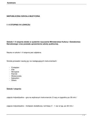 Dydaktyka NIEPUBLICZNA SZKOŁA MUZYCZNA I i II STOPNIA W ŁOWICZU Szkoła I i II stopnia działa w systemie nauczania Ministerstwa Kultury i Dziedzictwa Narodowego oraz posiada uprawnienia szkoły publicznej. Nauka w szkole I i II stopnia jest odpłatna. Szkoła prowadzi naukę gry na następujących instrumentach: - Fortepian Flet Skrzypce Klarnet Wiolonczela Saksofon Gitara Szkoła I stopnia: zajęcia indywidualne – gra na wybranym instrumencie /2 razy w tygodniu po 30 min./ zajęcia indywidualne – fortepian dodatkowy /od klasy V - 1 raz w tyg. po 30 min./ 1/4 Dydaktyka zajęcia zbiorowe – rytmika, kształcenie słuchu /3 razy 45 min./ W dalszym cyklu kształcenia dochodzą przedmioty praktyczne, takie jak: chór, zespoły instrumentalne Nauka kończy się uzyskaniem dyplomu ukończenia szkoły muzycznej I stopnia (podstawowej) Szkoła Muzyczna oprócz działalności dydaktycznej pełni również rolę kreatora życia artystycznego poprzez organizowanie koncertów, recitali, prelekcji, festiwali. Szkoła rozwija wiedzę wielu młodych pokoleń, kształtuje osobowość, rozbudza zainteresowania muzyczne, wzbogaca umysł i ducha, pozostawia trwałe umiejętności, które procentują w dorosłym życiu. Szkoła Muzyczna to także miejsce, w którym młodzi ludzie uczą się kochać i rozumieć sztukę. Szkoła II stopnia: zajęcia indywidualne nauki gry na instrumencie – przedmiot główny /2 razy w tyg. po 45 min./ zajęcia z fortepianu dodatkowego - / 1 raz w tyg. - 30 min./ 2/4 Dydaktyka zajęcia zespołowe – orkiestra, zespoły kameralne, chór /1 raz w tyg. - 90 min./ przedmioty teoretyczne- kształcenie słuchu, historia muzyki, harmonia, zasady muzyki, formy muzyczne. Absolwenci szkoły II stopnia uzyskują dyplom ukończenia Szkoły Muzycznej II stopnia i tytuł muzyka zawodowego potwierdzony egzaminem państwowym. Nauka w szkole I jak i II stopnia odbywa się w cyklu sześcioletnim. Zajęcia teoretyczne i plan zajęć indywidualnych jest organizowany zgodnie z planem nauczania obowiązującym w szkołach państwowych. Wszystkie zajęcia prowadzą wykładowcy o najwyższych kwalifikacjach kierunkowych i pedagogicznych, zgodnie z ustawą o systemie oświaty i rozporządzeniem MKiDN. Szkoła posiada nowoczesną bazę lokalową z multimedialną salą koncertową oraz wysokiej klasy instrumenty. Uczniowie biorą udział w cyklicznych koncertach i audycjach pokazując swoje osiągnięcia w nauce gry. Uczestniczą także w przesłuchaniach, konkursach i festiwalach w innych miastach. Wszystkie te czynniki powodują, iż edukacja muzyczna Państwa dzieci przebiega prawidłowo i w sposób optymalny. 3/4 Dydaktyka ZADBAJ O WSZECHSTRONNY ROZWÓJ SWOJEGO DZIECKA. PRZYJDŹ DO NAS I SPRAWDŹ JEGO MOŻLIWOŚCI. 4/4