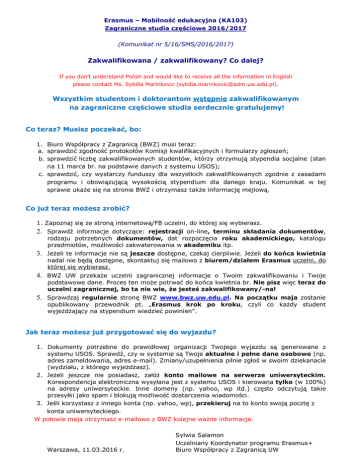 Erasmus – Mobilność edukacyjna (KA103) Zagraniczne studia częściowe 2016/2017 (Komunikat nr 5/16/SMS/2016/2017) Zakwalifikowana / zakwalifikowany? Co dalej? If you don’t understand Polish and would like to receive all the information in English please contact Ms. Sybilla Marinkovic ([email protected]). Wszystkim studentom i doktorantom wstępnie zakwalifikowanym na zagraniczne częściowe studia serdecznie gratulujemy! Co teraz? Musisz poczekać, bo: 1. Biuro Współpracy z Zagranicą (BWZ) musi teraz: a. sprawdzić zgodność protokołów Komisji kwalifikacyjnych i formularzy zgłoszeń; b. sprawdzić liczbę zakwalifikowanych studentów, którzy otrzymują stypendia socjalne (stan na 11 marca br. na podstawie danych z systemu USOS); c. sprawdzić, czy wystarczy funduszy dla wszystkich zakwalifikowanych zgodnie z zasadami programu i obowiązującą wysokością stypendium dla danego kraju. Komunikat w tej sprawie ukaże się na stronie BWZ i otrzymasz także informację mejlową. Co już teraz możesz zrobić? 1. Zapoznaj się ze stroną internetową/FB uczelni, do której się wybierasz. 2. Sprawdź informacje dotyczące: rejestracji on-line, terminu składania dokumentów, rodzaju potrzebnych dokumentów, dat rozpoczęcia roku akademickiego, katalogu przedmiotów, możliwości zakwaterowania w akademiku itp. 3. Jeżeli te informacje nie są jeszcze dostępne, czekaj cierpliwie. Jeżeli do końca kwietnia nadal nie będą dostępne, skontaktuj się mailowo z biurem/działem Erasmus uczelni, do której się wybierasz. 4. BWZ UW przekaże uczelni zagranicznej informacje o Twoim zakwalifikowaniu i Twoje podstawowe dane. Proces ten może potrwać do końca kwietnia br. Nie pisz więc teraz do uczelni zagranicznej, bo ta nie wie, że jesteś zakwalifikowany/-na! 5. Sprawdzaj regularnie stronę BWZ www.bwz.uw.edu.pl. Na początku maja zostanie opublikowany przewodnik pt. „Erasmus krok po kroku, czyli co każdy student wyjeżdżający na stypendium wiedzieć powinien”. Jak teraz możesz już przygotować się do wyjazdu? 1. Dokumenty potrzebne do prawidłowej organizacji Twojego wyjazdu są generowane z systemu USOS. Sprawdź, czy w systemie są Twoje aktualne i pełne dane osobowe (np. adres zameldowania, adres e-mail). Zmiany/uzupełnienia pilnie zgłoś w swoim dziekanacie (wydziału, z którego wyjeżdżasz). 2. Jeżeli jeszcze nie posiadasz, załóż konto mailowe na serwerze uniwersyteckim. Korespondencja elektroniczna wysyłana jest z systemu USOS i kierowana tylko (w 100%) na adresy uniwersyteckie. Inne domeny (np. yahoo, wp itd.) często odczytują takie przesyłki jako spam i blokują możliwość dostarczenia wiadomości. 3. Jeśli korzystasz z innego konta (np. yahoo, wp), przekieruj na to konto swoją pocztę z konta uniwersyteckiego. W połowie maja otrzymasz e-mailowo z BWZ kolejne ważne informacje. Warszawa, 11.03.2016 r. Sylwia Salamon Uczelniany Koordynator programu Erasmus+ Biuro Współpracy z Zagranicą UW