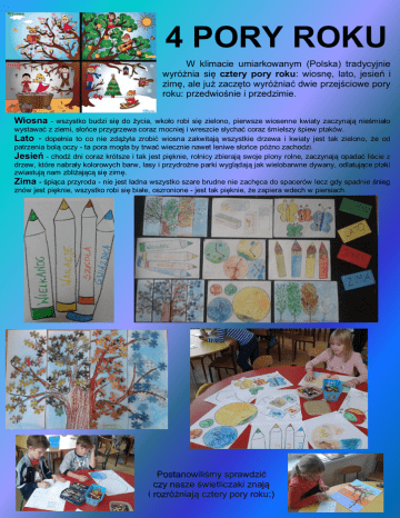 4 PORY ROKU W klimacie umiarkowanym (Polska) tradycyjnie wyróżnia się cztery pory roku: wiosnę, lato, jesień i zimę, ale już zaczęto wyróżniać dwie przejściowe pory roku: przedwiośnie i przedzimie. - wszystko budzi się do życia, wkoło robi się zielono, pierwsze wiosenne kwiaty zaczynają nieśmiało wystawać z ziemi, słońce przygrzewa coraz mocniej i wreszcie słychać coraz śmielszy śpiew ptaków. Lato - dopełnia to co nie zdążyła zrobić wiosna zakwitają wszystkie drzewa i kwiaty jest tak zielono, że od patrzenia bolą oczy - ta pora mogła by trwać wiecznie nawet leniwe słońce późno zachodzi. Jesień - chodź dni coraz krótsze i tak jest pięknie, rolnicy zbierają swoje plony rolne, zaczynają opadać liście z drzew, które nabrały kolorowych barw, lasy i przydrożne parki wyglądają jak wielobarwne dywany, odlatujące ptaki zwiastują nam zbliżającą się zimę. Zima - śpiąca przyroda - nie jest ładna wszystko szare brudne nie zachęca do spacerów lecz gdy spadnie śnieg znów jest pięknie, wszystko robi się białe, oszronione - jest tak pięknie, że zapiera wdech w piersiach. Wiosna Postanowiliśmy sprawdzić czy nasze świetliczaki znają i rozróżniają cztery pory roku;) Akcja okazała się skuteczna - dydaktycznie głównie dla świetliczków klas pierwszych – poprzez różnorodność technik plastycznych ugruntowały swoją wiedzę a pozostałe świetliczaki utrwaliły już posiadane informację na temat pór roku; ich kolejności i cech charakterystycznych dla każdej z nich. „Cztery pory roku” – to jedno z najpopularniejszych dzieł muzyki poważnej – autor Antonio Vivaldi – nasze świetliczaki mogły wysłuchać tego dzieła. nauczyciele świetlic