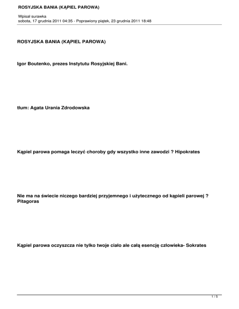 ROSYJSKA BANIA (KĄPIEL PAROWA) Wpisał surawka sobota, 17 grudnia 2011 04:35 - Poprawiony piątek, 23 grudnia 2011 18:48 ROSYJSKA BANIA (KĄPIEL PAROWA) Igor Boutenko, prezes Instytutu Rosyjskiej Bani. tłum: Agata Urania Zdrodowska Kąpiel parowa pomaga leczyć choroby gdy wszystko inne zawodzi ? Hipokrates Nie ma na świecie niczego bardziej przyjemnego i użytecznego od kąpieli parowej ? Pitagoras Kąpiel parowa oczyszcza nie tylko twoje ciało ale całą esencję człowieka- Sokrates 1/5 ROSYJSKA BANIA (KĄPIEL PAROWA) Wpisał surawka sobota, 17 grudnia 2011 04:35 - Poprawiony piątek, 23 grudnia 2011 18:48 Medycyna jest dobra, ale bania jest lepsza ? Piotr Wielki Ludzkość dawno temu odkryła kolosalne możliwości trzech naturalnych doktorów: słońca, powietrza i wody. Dają ci one zdrowie i siłę. Tak jak hartowana jest stal, tak nasze ciała hartowane są przez te trzy elementy. ?Gdzie jest ciepło, tam jest dobrze?. To stare powiedzenie ma głębokie i stare korzenie. Starożytna medycyna chińska oparta była na dwóch głównych zasadach: yin i jang. Jang reprezentuje jakość ciepła. Yin jakość zimna i wilgoci. Przewaga ciepła ponad zimnem w ciele człowieka jest podstawowym warunkiem zdrowia jednostki. Laureat nagrody Nobla August Crog, który odkrył mechanizm regulacji krążenia krwi, myślał i słusznie, że gdy wystawiamy nasze naczynia włosowate te ?:małe serca? na ciepło, zwiększamy równowagę energii w naszych organizmach. Galen, słynny uzdrowiciel starożytnego Rzymu, utrzymywał, że jednym z powodów dla których nasze ciało się starzeje jest kiepska perspiracja przez skórę (pocenie się), przez lata błony zaczynają się ściągać a pory skóry zwężać. Nieodmiennie polecał on kąpiele parowe, które pomagają poszerzać pory i zwiększać perspirację. Rosyjska bania. Ludzka mądrość i wiara w lecznicze właściwości Bani są potwierdzone przez prace badawcze naukowców w różnych częściach świata. Z ostrożnością i racjonalnym podejściem bania pomaga normalizować ciśnienie krwi. Pomaga także ludziom z cukrzycą i tym, którzy maja problemy z nerkami. Jest wyjątkowo dobra dla ludzi z reumatyzmem i dla tych, którzy maja problemy z przemianą materii. Jednym z magicznych sekretów bani jest jej zdolność do trenowania układu termoregulacji i zwiększanie wydzielania gruczołów potowych. 2/5 ROSYJSKA BANIA (KĄPIEL PAROWA) Wpisał surawka sobota, 17 grudnia 2011 04:35 - Poprawiony piątek, 23 grudnia 2011 18:48 Jakie są zalety z rosyjskiej bani? Jest to sposób w jaki para jest potęgowana. Jest to dokonane za pomocą kamenki (kamiennego piecyka). Jeśli chcesz gorętsza parę po prostu wylej trochę więcej wody na kamenkę. W swej książce Opisanie Moskwy niemiecki uczony Adam Olearium naucza nas, że w Rosji nie ma miasta lub wsi bez bani. ?Rosjanie potrafią dobrze znosić nadzwyczajnie gorącą parę. Kładą się oni na ławkach i proszą innych o biczowanie i pocieranie ciał rozgrzanymi miotełkami zrobionymi z gałęzi dębowych. W zimie skaczą oni wprost w śnieg, nacierają się nim i znowu idą do bani. Tak dramatyczne zmiany temperatury hartują ich ciała?. Jest jeszcze inna godna uwagi strona rosyjskiej bani. Nawet bardzo staranne analizy przeprowadzane przez fińskich, rosyjskich i niemieckich higienistów nie mogły znaleźć żadnych zarazków. Rozgrzana para sterylizuje. Kilka słów o skórze i wpływie temperatury na nią. ?Skóra jest organem, który pomaga nam powiedzieć o stanie zdrowia a nawet historii życia jednostki? napisał Wilhelm Winternits, profesor z Wiednia. Pięć stóp kwadratowych skóry pokrywa nasze ciało, waży ona jedną piątą całego ciężaru ciała. Jest największym organem naszego ciała! W skórze ludzkiej znajduje się sieć naczyń włosowatych i receptorów. Kiedy jest eksponowana na gorącą parę sygnał idzie do mózgu. Stamtąd, impulsy są wysyłane do środka nerwów, które regulują otwieranie się i zwężanie naczyń krwionośnych. Więcej krwi napływa do skóry. Metabolizm się zwiększa. Jest to moment intensywnej perspiracji. Wraz z potem uwalniane są toksyny. Jedna sesja bani produkuje od 500 do 1500 gramów potu. Nie jest więc zaskakujące, że skóra ludzka produkuje 3-4 gramów potu na godzinę, ale jeśli temperatura się zwiększa ponad 52 stopnie C i wilgotność do 95% to ilość wyrzutów potu wzrasta 20 do 30 razy. W swej książce Ukryta mądrość ludzkiego ciała wybitny rosyjski lekarz Alexander Zahlmanov pisze, ze życie to ciągły ruch płynów pomiędzy i w komórkach. Kiedy ruch ten jest nieprzerwany wszystko idzie dobrze. Ale jeśli następuje przerwa w płynięciu życiodajnych strumieni, pojawia się choroba. Dr. Zahlmanov wysoce wychwala rosyjską banię za jej zdolność do regulacji ruchów płynów w ciele. 3/5 ROSYJSKA BANIA (KĄPIEL PAROWA) Wpisał surawka sobota, 17 grudnia 2011 04:35 - Poprawiony piątek, 23 grudnia 2011 18:48 Wiemy, że skóra oddycha. Ułatwia to pracę płucom i nerkom. Wydala toksyny i uwalnia nadmiar wody. Gruczoły łojowe również mają również zewnętrzne otwarcia w formie porów, które nawilżają nasze ciało najcieńszym płaszczem cennej naturalnej emulsji. Zmiękcza ona i chroni skórę przed wysuszeniem, czyni ją miękką, elastyczną i błyszczącą. Przedwczesne zmarszczki... jak one martwią kobiety. Tymczasem ich pochodzenie jest całkiem prozaiczne ? kiepskie funkcjonowanie gruczołów łojowych. Rezultatem jest brak elastyczności skóry. Ale to wymaga treningu! Tak jak sportowiec robi to ze swoimi mięśniami. A gorąca bania jest cudownym trenerem dla skóry. To, co w bani jest najbardziej interesujące to, to, że angażuje ona zatrzymaną krew. Przeciętnie człowiek ma około 5 do 6 litrów krwi. Jeden litr jest w depozycie. I ta zatrzymana krew, bogata w cenne substancje odżywcze daje komórkom naszego ciała nowy ładunek. Po sesji bani, ludzie oddychają z łatwością.