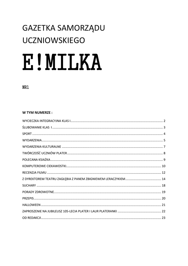 GAZETKA SAMORZĄDU UCZNIOWSKIEGO E!MILKA NR1 W TYM NUMERZE : WYCIECZKA INTEGRACYJNA KLAS I .......................................................................................................... 2 ŚLUBOWANIE KLAS I ............................................................................................................................... 3 SPORT ...................................................................................................................................................... 4 WYDARZENIA ........................................................................................................................................... 5 WYDARZENIA KULTURALNE .................................................................................................................... 7 TWÓRCZOŚĆ UCZNIÓW PLATER .............................................................................................................. 8 POLECANA KSIAŻKA ................................................................................................................................. 9 KOMPUTEROWE CIEKAWOSTKI............................................................................................................. 10 RECENZJA FILMU ................................................................................................................................... 12 Z DYREKTOREM TEATRU ZAGŁĘBIA Z PANEM ZBIGNIEWEM LERACZYKIEM ......................................... 14 SUCHARY ............................................................................................................................................... 18 PORADY ZDROWOTNE........................................................................................................................... 19 PRZEPIS .................................................................................................................................................. 20 HALLOWEEN .......................................................................................................................................... 21 ZAPROSZENIE NA JUBILEUSZ 105-LECIA PLATER I LAUR PLATERANKI .................................................. 22 OD REDAKCJI.......................................................................................................................................... 23 WYCIECZKA INTEGRACYJNA KLAS I Dnia 25.09.2013 roku, uczniowie klas pierwszych udali się na jednodniową wycieczkę w okolice Bielska-Białej, a dokładnie na Szyndzielnię. Była to dla nich wspaniała okazja, aby lepiej się poznać i mile spędzić czas. Uczniowie musieli zmierzyć się z wysokością 1026 m n. p .m, gdyż droga do schroniska trwała około dwóch godzin i była sporym wyzwaniem z powodu stromych odcinków, kamieni i błota. Pogoda dopisała, a po dotarciu na miejsce rozpalono ogniska, a śpiewom i rozmowom nie było końca. Niestety wycieczka musiała dobiec końca, ale pozostanie ona w pamięci uczniów i nauczycieli. Z opinii klas pierwszych wynika, że była ona bardzo udana i pozostanie na długo w pamięci. KAROLINA BUSZKA KL.I 2 ŚLUBOWANIE KLAS I Tradycją naszej szkoły jest ślubowanie uczniów klas pierwszych, podczas którego wstępują oni w szeregi Plateran. Dnia 23.09.2013 roku w naszym Liceum odbyło się uroczyste ślubowanie pierwszoklasistów. Po przemowie pani Dyrektor i złożeniu ślubowania uczniowie przystąpili w formie zabawnych pojedynków do prezentacji swoich klas. Jako pierwsza zaprezentowała się klasa IA o profilu lingwistyczno-kulturowym, której przedstawiciele zatańczyli taniec bollywood, ukazując barwna kulturę Indii. Reprezentanci klasy IB wkroczyli spontanicznie na scenę i przedstawili publiczności „modeli” z klasy biologiczno -chemicznej- farmerkę i szalonego naukowca. Klasa IB/C, czyli mix biolchemu z mat-fizem utwierdziła wszystkich w przekonaniu, ze dentystom trzeba ufać, a matematyka… to jednak królowa nauk. Przyszli prawnicy z klasy Id „zarapowali” natomiast, że skrót JP ma także inne, niż powszechnie się wydaje znaczenie, a mianowicie :”Jestem Prawnikiem”. Po prezentacji klas odbyły się konkurencje takie jak picie mleka, zwijanie włóczki i „wymiałczenie”„piosenki. Ostatecznie najlepszymi „kotami” okazała się klasa o profilu prawnopolitologicznym. Została ona nagrodzona przez panią Dyrektor workiem słodyczy. Na zakończenie ślubowania były klasowe rozmowy, zdjęcia, po czym wszyscy rozeszli się do swoich klas już jako pełnoprawni członkowie społeczności II Liceum Ogólnokształcącego im. Emilii Plater w Sosnowcu. Karolina Łuszcz kl. IA 3 SPORT Do naszej szkoły uczęszcza kilku sportowców i choć nie rzucają się w oczy, to każdy z nich z zaangażowaniem oddaje się zajęciom sportowym, wykazują się w różnych dziedzinach sportu. Jak co roku pod koniec września sosnowiecka młodzież brała udział w zawodach lekkoatletycznych, na które składają się : bieg na 100m, 400m, 800m, 1500m, skok w dal i pchniecie kulą. Zawody odbywały się na niezwykle wysokim poziomie , pomimo nie dopisującej aury. Wszyscy uzyskiwali podobne wyniki, a ułamki sekund decydowały o miejscu na podium. Nasze reprezentantki zdołały pokonać inne licealistki i zająć punktowane miejsca. Asia Chwał swym skokiem w dal na odległość 4,94m zajęła pierwsze miejsce, zaś Aleksandra Mitas w biegu na 1000m zajęła trzecie miejsce. Zwycięzcom gratulujemy i życzymy dalszych sukcesów nie tylko sportowych, a innych zachęcamy do brania udziału w zawodach, bo sport daje siłę i zdrowie. JULIA LATOSIK KL.IIA 4 WYDARZENIA Dnia 14 października w naszym kraju obchodzimy Dzień Edukacji Narodowej, czyli popularny Dzień Nauczyciela. To narodowe święto oświaty i wyższego szkolnictwa zostało ustanowione 27 kwietnia 1972 r. Upamiętnia ono rocznicę powstania w Polsce w 18. wieku, w dobie oświecenia, Komisji Edukacji Narodowej (KEN). Z okazji Dnia Nauczyciela w nasz