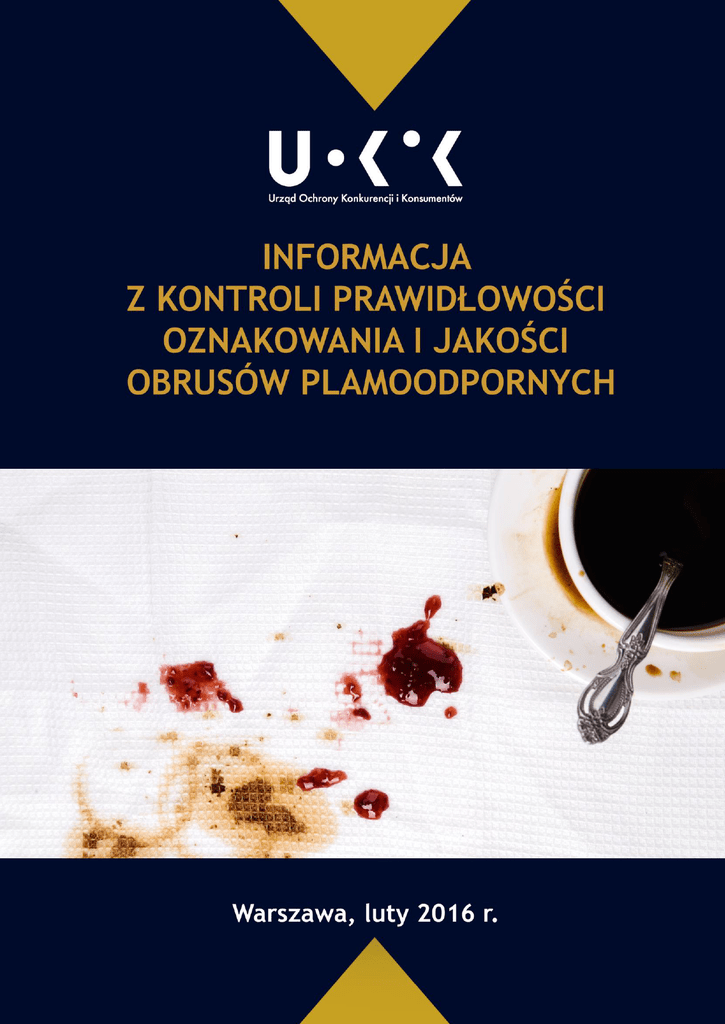 DIH-83- ( )/16/AB INFORMACJA Z KONTROLI PRAWIDŁOWOŚCI OZNAKOWANIA I JAKOŚCI PRODUKTÓW WŁÓKIENNICZYCH - OBRUSÓW PLAMOODPORNYCH Warszawa, luty 2016 r. Informacja z kontroli prawidłowości oznakowania i jakości produktów włókienniczych – obrusów plamoodpornych I. WSTĘP Inspekcja Handlowa przeprowadziła w III kwartale 2015 r. kontrole wyrobów włókienniczych, w tym obrusów plamoodpornych, które od kilku lat stają się coraz bardziej popularne z uwagi na ich właściwości, nie odbiegając przy tym wzornictwem od tradycyjnych obrusów dekoracyjnych. Celem kontroli była ocena prawidłowości oznakowania oraz jakości tego rodzaju produktów, m.in. w zakresie składu surowcowego czy deklarowanej przez producentów odporności na plamy. Ponadto sprawdzano prawidłowość wprowadzenia na rynek wyrobów oraz legalność i rzetelność działania kontrolowanych przedsiębiorców. Kontrole obrusów przeprowadzano w pierwszej kolejności u producentów, importerów oraz pierwszych dystrybutorów (w przypadku obrotu wewnątrzwspólnotowego). Inspekcja Handlowa w wyniku podjętych działań skontrolowała łącznie 63 przedsiębiorców, w tym: 38 placówek detalicznych, 17 producentów/pierwszych dystrybutorów, 8 hurtowni. Kontrolą objęto obrusy plamoodporne importowane, a także produkowane w kraju oraz na terenie Unii Europejskiej. II. USTALENIA KONTROLI Kontrole przeprowadzone przez Inspekcję Handlową objęły obrusy plamoodporne łącznie z 315 partii, z czego ze względu na różnego rodzaju nieprawidłowości zakwestionowano wyroby z 51 partii (co stanowi 16,2 proc.). 1. Jakość Inspekcja Handlowa badaniem jakości objęła wyroby z 300 partii poddanych ocenie obrusów plamoodpornych. Oceniając jakość wyrobów przeprowadzono badania organoleptyczne oraz laboratoryjne. W ramach ww. badań zakwestionowano jakość 46 partii (15,3 proc.). Badania organoleptyczne, którym poddano 252 partie wyrobów, polegały na sprawdzeniu ogólnego wyglądu wyrobu, staranności wykonania, a także ocenie zgodności deklarowanego wymiaru wyrobu z rzeczywistym. W toku kontroli stwierdzono, że obrusy były starannie 2 Informacja z kontroli prawidłowości oznakowania i jakości produktów włókienniczych – obrusów plamoodpornych wykończone. Nie stwierdzono obrusów z błędami tkanin obniżających ich wartość użytkową, tj.: zaciągnięcia, zgrubienia, nieprawidłowe szwy i ściegi, plamy, zabrudzenia, dziury, błędy wzoru czy też nieprawidłowy druk. Estetyka i sposób konfekcjonowania produktów również nie budziła zastrzeżeń. Tylko w 1 przypadku stwierdzono niezgodne z deklarowanymi wymiary wyrobu (deklarowane wymiary to 90x160, a rzeczywiste stwierdzone w wyniku badań organoleptycznych 70x160). Jakość kontrolowanych obrusów plamoodpornych oceniano również w zakresie zgodności z wymaganiami deklarowanymi przez przedsiębiorców przeprowadzając badania laboratoryjne. W ramach prowadzonej kontroli, Specjalistyczne Laboratorium Produktów Włókienniczych i Analizy Instrumentalnej UOKiK w Łodzi przeprowadziło badania laboratoryjne wyrobów z 48 partii, kwestionując jakość 45 partii (prawie 94 proc. wszystkich obrusów zbadanych laboratoryjnie). Badania, o których mowa powyżej były prowadzone w zakresie: składu surowcowego, plamoodporności, wymiarowania. Skład surowcowy jest podstawowym parametrem charakteryzującym produkty włókiennicze znajdujące się w obrocie handlowym. Zgodnie z przepisami rozporządzenia nr 1007/20111, produkty włókiennicze powinny być oznakowane informacją o składzie surowcowym, poprzez podanie, z jakich rodzajów włókien dany wyrób został wykonany. Badanie laboratoryjne polegało na sprawdzeniu rzeczywistego składu surowcowego i porównaniu go z zawartym na opakowaniu jednostkowym. W związku z tym, że obrus pełni funkcję zarówno dekoracyjną, jak i ochronną podczas spożywania posiłków, badania zostały przeprowadzone z wykorzystaniem produktów spożywczych, które przy użytkowaniu obrusa zgodnie z przeznaczeniem, mogłyby mieć bezpośredni kontakt z obrusem i spowodować jego poplamienie. Badania laboratoryjne zostały przeprowadzone z wykorzystaniem jedenastu czynników brudzących, którymi były: wino czerwone, sok porzeczkowy, sok pomidorowy, kawa, herbata, olej, barszcz czerwony, keczup, majonez, dżem porzeczkowy, czekolada. Badania te polegały na sprawdzeniu czy na badanym rozporządzenie Parlamentu Europejskiego i Rady (UE) nr 1007/2011 z dnia 27 września 2011 r. w sprawie nazewnictwa włókien tekstylnych oraz etykietowania i oznakowania składu surowcowego wyrobów włókienniczych, a także uchylenie dyrektywy Rady 73/44/EWG oraz dyrektyw Parlamentu Europejskiego i Rady 96/73/WE i 2008/121/WE (Dz. U. UE.L.2011 Nr 272, s.1 z późn. zm.) 1 3 Informacja z kontroli prawidłowości oznakowania i jakości produktów włókienniczych – obrusów plamoodpornych obrusie powstają plamy po nałożeniu czynnika brudzącego i usunięciu go po ok. 15 minutach, oraz czy po wypraniu obrusa (pranie i suszenie zostały przeprowadzone zgodnie z zaleceniami zawartymi na etykiecie jednostkowej), plamy te na nim pozostają. Badanie laboratoryjne pod kątem wymiarowania polegało na dokonywaniu pomiarów pobranych do badań próbek obrusów i sprawdzaniu czy deklarowana wielkość wyrobów jest zgodna z wielkością rzeczywistą. Do badań laboratoryjnych wybierane były obrusy, w oznakowaniu których przedsiębiorcy deklarowali, że wyroby te są odporne na plamy. Wszystkie przekazane do badań laboratoryjnych obrusy zostały również przebadane pod względem zgodności z deklarowanym składem surowcowym, z czego zakwestionowano 1 partię, w związku z niezgodnością z deklaracją przedsiębiorcy. Ponadto dokonano oceny wyrobów z 47 partii pod kątem zgodności rzeczywistych wymiarów z deklarowanymi. W tym zakresie zakwestionowano wyroby z 9 partii stwierdzając niezgodne z deklarowanymi rzeczywiste wymi