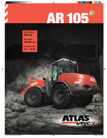 AR 105 Ciężar roboczy: 9450 kg Moc silnika: 105 kW (143 KM) Pojemność łyżki: 1,6 - 1,8 m3 ATL-140107-AR105e-PL_8s.indd 1 28.08.14 13:28 AR 105 ATL-140107-AR105e-PL_8s.indd 2 28.08.14 13:28 Ładowarki kołowe ATLAS Weyhausen są czymś więcej niż tylko sumą swych części. Są prawdziwą pasją. Do fascynacji technologią. Do jakości „Made in Germany“. Z ducha innowacji pracowników, z zamiłowania do precyzji oraz z entuzjastycznego podejścia do mocnej techniki silnikowej powstał właśnie nowy typ ładowarek kołowych generacji e. Mała litera e oznacza: • niską emisję: przebija wymagania ustaw w zakresie emisji spalin * • efektywność: większa moc przy mniejszym zużyciu • ewolucyjność: rozwiązania zoptymalizowane i dopracowane do najmniejszego szczegółu ATL-140107-AR105e-PL_8s.indd 3 * EU Stage IIIB & IV / US TIER 4 Interim & TIER 4 Małe e. Duża skuteczność. 28.08.14 13:29 ATLAS WEYCOR: Z ENERGIĄ. P Najnowocześniejsza kinematyka Bewährte ATLAS weycor Kinematik mit hohen Reißkräften und exzellenten Hubhöhen. Technologia silników Deutz TCD 4.1 L4 Chłodzony wodą 4-cylindrowy silnik jednorzędowy z turbodoładowaniem chłodzeniem powietrzem doładowującym i chłodzoną zewnętrzną recyrkulacją spalin. Silnik i system oczyszczania spalin (AGN) są dostosowane do optymalnej sprawności całego systemu i zapewniają tym samym minimalne koszty paliwa i ogólnej eksploatacji. Silniki posiadają modułowy system oczyszczania spalin (AGN). Wydajny system wtryskowy DEUTZ Common-Rail (DCR®) i elektroniczna regulacja silnika (EMR 4) z inteligentnym połączeniem z systemem zarządzania napędem gwarantuje najlepsze osiągi silnika przy niskim zużyciu paliwa. Najlepsza zdolność do rozruchu zimnego także w skrajnych warunkach. Długie cykle wymiany oleju i prostota wymiany płynów silnikowych obniżają koszty eksploatacji i podnoszą dyspozycyjność urządzeń. Silnikie spełniają wymagania EU Poziom IIIB i US EPA Tier 4 interim z filtrem cząstek DVERT® (DPF). Regeneracja podczas pracy odbywa się w trybie Heat bez pogorszenia wydajności. Niezbędna aktywna regeneracja w czasie postoju wyświetlana jest na wyświetlaczu i inicjowana przez kierowcę. Szybkozłącze hydrauliczne Pozwala na zmianę narzędzia w ciągu zaledwie kilku sekund i czyni z ładowarki wszechstronne urządzenie. Przegubowy układ kierowniczy Zapewnia znakomite zdolności do jazdy terenowej i zwrotność. Dzięki nisko położonemu punktowi ciężkości posiada wyjątkową stabilność nawet w terenie. ATL-140107-AR105e-PL_8s.indd 4 28.08.14 13:29 Ą. PRECYZJA. NIEZAWODNOŚĆ. Ułatwiony serwis Kabina komfortowa Szybka i łatwa konserwacja i pielęgnacja dzięki centralnie umieszczonym i dobrze dostępnym punktom serwisowym. Bezpieczna, nie męcząca praca dzięki znakomitej widoczności dookoła, przejrzyście rozmieszczonej armaturze i ergonomicznej konstrukcji. Mocny napęd Ładowarki kołowe ATLAS weycor wyposażone są w nowoczesne silniki łączące w sobie duże rezerwy siły dla sprostania trudnym warunkom użycia ze współczesnymi, niskimi wartościami emisji. Jedyny producent z oddzielnym hamulcem hydraulicznym (Inch Pedal) Mniejsza zużywalność i niższe zużycie paliwa, gdyż inaczej niż w przypadku połączonego pedału hamulca / Inch Pedal wykluczone jest tutaj niechciane użycie hamulca . ATL-140107-AR105e-PL_8s.indd 5 Hamulec negatywny Utrzymuje bezpiecznie ładowarkę na stromych zjazdach. Także przy wyłączonym silniku wszystkie cztery koła są zablokowane. 28.08.14 13:29 AR 105 80 DANE TECHNICZNE Silnik Osie Układ hydrauliczny Produkt: ___________ Deutz silnik wysokoprężny TCD 4.1 L4 Rodzaj konstrukcji: ___ chłodzony wod Moc***: ____________ 105 kW (143 KM) przy 2200 min-1 Maks. moment obrotowy: 550 Nm przy 1600 min-1 Pojemność skokowa: _ 4040 cm3 Liczba cylindrów: ____ 4 w szeregu Sztywne osie z planetarnymi przekładniami redukcyjnymi w pistach kół.Elektrycznie włączana blokada dyferencjału w przedniej i tylnej osi w 100 %. • Hydraulika robocza i układ kierowniczy zasilany pompą tłoczkową • Priorytet zasilania ma zawsze układ kierowniczy • 3. Obwód hydrauliczny w standarcie • Sterowanie hydrauliką roboczą poprzez joystick z pozycją pływającą • Ciśnienie robocze 250 bar, wydajność pompy 138,6 l/min Układ kierowniczy • W pełni hydrauliczny centralny przegubowy układ kierowniczy • Przednie i tylne koła pracują w jednym śladzie • Kąt wyboczenia obustronny 40°, ruch wahliwy ±12° z tyłu ładowarki • Ciśnienie robocze hydrauliki układu kierowniczego 175 bar • Funkcja awaryjnego kierowania Instalacja elektryczna Napięcie robocze ____ 12 V Akumulator _________ 12 V / 100 Ah Generator __________ 14 V / 95 A Rozrusznik _________ 12 V / 4 kW Urządzenie ładujące Ogumienie Napęd jezdny Standard: 17.5-25 EM – ogumienie do maszyn budowlanych do stosowania na względnie miękkim podłożu, o wysokiej trakcji i z dobrym samooczyszczaniem • Napęd hydrostatyczny działający na wszystkie 4 koła • Zakresy jazdy obowiązujące dla standardowego ogumienia: Bieg roboczy 0-6 km/h Bieg drogowy 0–20 km/h Szybki bieg opcjonalnie 40 km/h • 1-szy i 2-gi bieg hydrauliczny załączany pod obciążeniem, jazda do przodu/wstecz załączana pod obciążeniem • Wielofunkcyjny joystick umożliwia wygodne sterowanie osprzętem roboczym i zmianę kierunku jazdy • Sterowanie jazdą poprzez pedał gazu i oddzielny pedał ‘’Inch’’ do lepszej dystrybucji mocy z hydrauliki jazdy na hydraulikę roboczą Ogumienie specjalne: na żądanie • Mocna i solidna kinematyka „Z” z dużą siłą wyrywającą • Hydrauliczne szybkozłącze • Obsługa wszystkich funkcji za pomocą joysticka ATLAS • Prowadzenie równoległe przy pracy z widłami do palet • Funkcja automatycznego powrotu łyżki • Automatyczna pozycja środkowa • Blokada hydrauliki roboczej zgodna z kodeksem ruchu drogowego Unoszeni