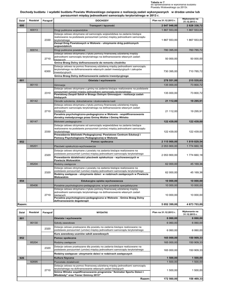 Tabela nr 7 do sprawozdania w wykonania budŜetu Powiatu Wołowskiego za 2013r. Dochody budŜetu i wydatki budŜetu Powiatu Wołowskiego związane z realizacją zadań wykonywanych w drodze umów lub porozumień między jednostkami samorządu terytorialnego w 2013 r. Dział Rozdział Plan na 31.12.2013 r. DOCHODY Paragraf 2 647 948,00 2 628 338,72 Drogi publiczne wojewódzkie 1 867 553,00 1 867 553,00 Dotacje celowe otrzymane od samorządu województwa na zadania bieŜące realizowane na podstawie porozumień (umów) między jednostkami samorządu terytorialnego Zarząd Dróg Powiatowych w Wołowie - utrzymanie dróg publicznych wojewódzkich 1 867 553,00 1 867 553,00 780 395,00 760 785,72 50 000,00 50 000,00 730 395,00 710 785,72 278 551,00 215 535,63 Gimnazja 135 000,00 73 800,72 Dotacje celowe otrzymane z gminy na zadania bieŜące realizowane na podstawie porozumień (umów) między jednostkami samorządu terytorialnego Powiatowy Zespół Szkół w Brzegu Dolnym Gimnazjum - realizacja zadań bieŜących 135 000,00 73 800,72 Ośrodki szkolenia, dokształcania i doskonalenia kadr 21 112,00 19 295,91 Dotacja celowa otrzymana z tytułu pomocy finansowej udzielanej między jednostkami samorządu terytorialnego na dofinansowanie własnych zadań bieŜących Poradnia psychologiczno-pedagogiczna w Wołowie - współfinansowanie doradcy metodycznego przez Gminę Wołów i Gminę Wińsko 21 112,00 19 295,91 Biblioteki pedagogiczne 122 439,00 122 439,00 Dotacje celowe otrzymane od samorządu województwa na zadania bieŜące realizowane na podstawie porozumień (umów) między jednostkami samorządu terytorialnego Prowadzenie Biblioteki Pedagogicznej- Powiatowe Centrum Edukacji i Pomocy Psychologiczno Pedagogicznej w Wołowie 122 439,00 122 439,00 2 115 900,00 1 819 829,54 2 053 900,00 1 774 660,18 2 053 900,00 1 774 660,18 Rodziny zastępcze 62 000,00 45 169,36 Dotacje celowe otrzymane z powiatu na zadania bieŜące realizowane na podstawie porozumień (umów) między jednostkami samorządu terytorialnego Rodziny zastępcze - utrzymanie dzieci w rodzinach zastępczych w Powiecie Wołowskim 62 000,00 45 169,36 600 Transport i łączność 60013 2330 60014 2710 6300 Wykonanie na 31.12.2013 r. Drogi publiczne powiatowe Dotacja celowa otrzymana z tytułu pomocy finansowej udzielanej między jednostkami samorządu terytorialnego na dofinansowanie własnych zadań bieŜących Gmina Brzeg Dolny dofinansowanie do remontu chodnika Dotacja celowa na pomoc finansową udzielaną między jednostkami samorządu terytorialnego na dofinansowanie własnych zadań inwestycyjnych i zakupów inwestycyjnych Gmina Brzeg Dolny dofinansowanie zadania inwestycyjnego 801 Oświata i wychowanie 80110 2310 80142 2710 80147 2330 852 Pomoc społeczna 85201 Placówki opiekuńczo-wychowawcze 2320 85204 2320 Dotacje celowe otrzymane z powiatu na zadania bieŜące realizowane na podstawie porozumień (umów) między jednostkami samorządu terytorialnego Prowadzenie działalności placówek opiekuńczo - wychowawczych w Powiecie Wołowskim 10 000,00 10 000,00 Poradnie psychologiczno-pedagogiczne, w tym poradnie specjalistyczne 10 000,00 10 000,00 Dotacja celowa otrzymana z tytułu pomocy finansowej udzielanej między jednostkami samorządu terytorialnego na dofinansowanie własnych zadań bieŜących Poradnia psychologiczno-pedagogiczna w Wołowie - Gmina Brzeg Dolny dofinansowanie dogoterapii 10 000,00 10 000,00 5 052 399,00 4 673 703,89 854 Edukacyjna opieka wychowawcza 85406 2710 Razem: Dział Rozdział Paragraf 801 80130 2320 Plan na 31.12.2013 r. WYDATKI Wykonanie na 31.12.2013 r. Oświata i wychowanie 6 060,00 6 060,00 Szkoły zawodowe 6 060,00 6 060,00 Dotacje celowe przekazane dla powiatu na zadania bieŜące realizowane na podstawie porozumień (umów) między jednostkami samorządu terytorialnego 6 060,00 6 060,00 Pomoc społeczna 165 000,00 150 909,33 Rodziny zastępcze 165 000,00 150 909,33 Dotacje celowe przekazane dla powiatu na zadania bieŜące realizowane na podstawie porozumień (umów) między jednostkami samorządu terytorialnego 165 000,00 150 909,33 Kultura fizyczna 1 500,00 1 500,00 Pozostała działalność 1 500,00 1 500,00 Dotacja celowa na pomoc finansową udzielaną między jednostkami samorządu terytorialnego na dofinansowanie własnych zadań bieŜących Gmina Wińsko współfinansowanie programów "Animator Sportu Dzieci i MłodzieŜy" oraz Trener Gminny 2013" 1 500,00 1 500,00 172 560,00 158 469,33 Kurs zawodowy uczniów szkół zawodowych 852 85204 2320 Rodziny zastępcze- utrzymanie dzieci w rodzinach zastępczych 926 92695 2710 Razem: