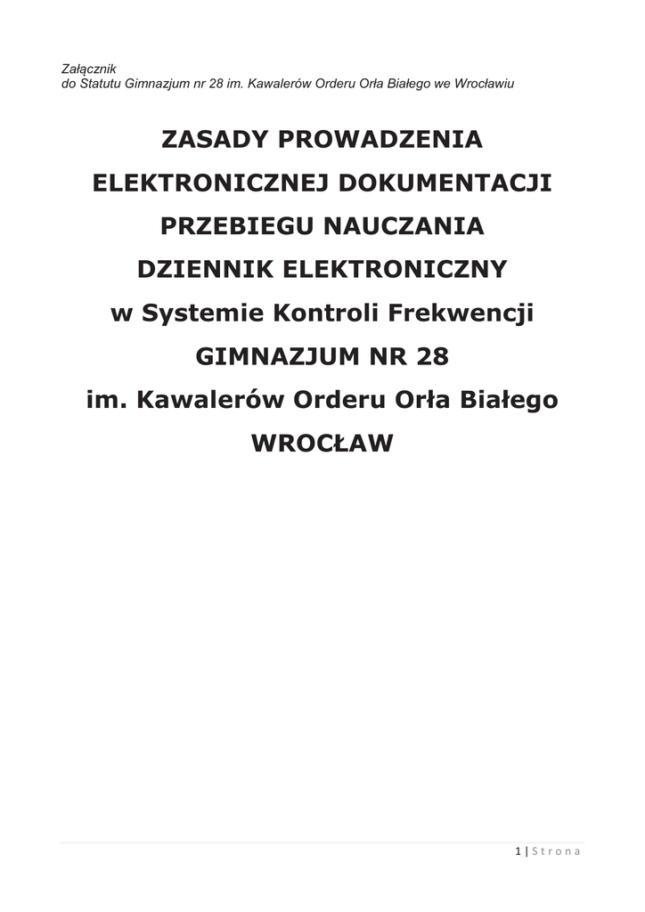 Załącznik do Statutu Gimnazjum nr 28 im. Kawalerów Orderu Orła Białego we Wrocławiu ZASADY PROWADZENIA ELEKTRONICZNEJ DOKUMENTACJI PRZEBIEGU NAUCZANIA DZIENNIK ELEKTRONICZNY w Systemie Kontroli Frekwencji GIMNAZJUM NR 28 im. Kawalerów Orderu Orła Białego WROCŁAW 1|Strona Spis treści str. ROZDZIAŁ I. POSTANOWIENIA OGÓLNE 3 ROZDZIAŁ II. POLITYKA BEZPIECZEŃSTWA I STOSOWANE KONTA § Superadministrator § Administrator (Szkolny administrator dziennika elektronicznego) § Dyrektor Szkoły § Wychowawca klasy § Nauczyciel § Pedagog/Psycholog § Sekretariat § Rodzice – prawni opiekunowie § Uczeń 4 4 4 5 5 5 5 6 6 6 ROZDZIAŁ III. PRZEKAZYWANIE INFORMACJI W DZIENNIKU ELEKTRONICZNYM 6 ROZDZIAŁ IV ZADANIA I OBOWIĄZKI UŻYTKOWNIKÓW DZIENNIKA ELEKTRONICZNEGO § Szkolny administrator dziennika elektronicznego) § Dyrektor Szkoły § Wychowawca klasy § Nauczyciel § Pedagog/Psycholog § Sekretariat § Rodzice – prawni opiekunowie § Uczeń 8 8 9 10 11 14 15 15 16 ROZDZIAŁ V. POSTĘPOWANIE W CZASIE AWARII ORAZ EWAKUACJI 16 ROZDZIAŁ VI. POSTANOWIENIA KOŃCOWE Załącznik 1. Procedura odbioru kodów dostępu do e-dziennika 17 18 2|Strona ROZDZIAŁ I. POSTANOWIENIA OGÓLNE 1. W szkole funkcjonuje elektroniczny dziennik (e-dziennik), obsługiwany za pośrednictwem strony www.dziennik.librus.pl . Oprogramowanie e-dziennika oraz usługi z nim związane udostępnione są przez firmę zewnętrzną, współpracującą ze szkołą na podstawie umowy podpisanej przez Dyrektora szkoły i uprawnionego przedstawiciela firmy dostarczającej i obsługującej system e-dziennika w Systemie Kontroli Frekwencji i Postępów w Nauce. 2. Za niezawodność działania systemu, ochronę danych osobowych umieszczonych na serwerach oraz tworzenie kopii bezpieczeństwa odpowiada firma nadzorująca pracę dziennika internetowego. Pracownicy szkoły którzy odpowiadają za edycję, udostępnianie danych oraz za ochronę danych osobowych mają bezpośredni dostęp do edycji i przeglądania danych. Rodzice mają możliwość przeglądania udostępnionych im danych. Dane ucznia prezentowane są rodzicom poprzez wykorzystanie modułu Kartoteka Uczniowska. Szczegółową odpowiedzialność reguluje zawarta pomiędzy stronami umowa oraz przepisy obowiązującego w Polsce prawa. 3. Podstawy prawne funkcjonowania dziennika elektronicznego, przechowywania i przetwarzania w nim danych uczniów, rodziców oraz dokumentowania przebiegu nauczania: - Rozporządzenie Ministra Edukacji Narodowej i Sportu z dnia 19 lutego 2002r. w sprawie sposobu prowadzenia przez publiczne przedszkola, szkoły i placówki dokumentacji przebiegu nauczania, działalności wychowawczej i opiekuńczej oraz rodzajów tej dokumentacji (Dz. U. Nr 23, poz. 225, z 2003 r. Nr 107, poz. 1003 z 2009 r. Nr 116, poz. 977 oraz z 2010 r. Nr 156, poz. 1047.) - Ustawa z dnia 29 sierpnia 1997 r. o ochronie danych osobowych (Dz. U. z 2002 r. Nr 101, poz. 926 i Nr 153, poz. 1271, z 2004 r. Nr 25, poz. 219 i Nr 33, poz. 285, z 2006 r. Nr 104, poz. 708 i Nr 104, poz. 711, z 2007r. Nr 165, poz. 1170 i Nr 176, poz. 1238 oraz z 2010 r. Nr 41, poz. 233) - Rozporządzenie Ministra Spraw Wewnętrznych i Administracji z dnia 29 kwietnia 2004r. w sprawie dokumentacji przetwarzania danych osobowych oraz warunków technicznych i organizacyjnych, jakim powinny odpowiadać urządzenia i systemy informatyczne służące do przetwarzania danych osobowych (Dz. U. Nr 100, poz. 1024) 4. Administratorem danych osobowych jest Gimnazjum nr 28 im. Kawalerów Orderu Orła Białego we Wrocławiu, ul. Zachodnia 2. 5. Pracownicy szkoły zobowiązani są do stosowania zasad zawartych w niniejszych procedurach. 6. Każdy użytkownik e-dziennika w razie stwierdzenia nieścisłości powinien osobiście o tym fakcie powiadomić Szkolnego Administratora Dziennika Elektronicznego (e-dziennika). 7. Rodzicom na pierwszym zebraniu w nowym roku szkolnym i uczniom na początkowych godzinach wychowawczych lub lekcji informatyki, zapewnia się możliwość zapoznania się ze sposobem działania i funkcjonowania e-dziennika. 8. Indywidualne loginy i hasła pierwszego logowania rodzice i uczniowie otrzymują od wychowawcy klasy bezpłatnie za pisemnym potwierdzeniem odbioru. 9. Hasło umożliwiające dostęp do zasobów sieci każdy użytkownik (Szkolny Administrator e-dziennika, Dyrektor szkoły, wychowawca klasy, nauczyciel, pracownik sekretariatu, rodzic, uczeń) utrzymuje w tajemnicy również po upływie ich ważności. 10. Zapisy w e-dzienniku zapewniają realizację postanowień Wewnątrzszkolnego Systemu Oceniania i Przedmiotowych Systemów Oceniania. 11. Dla sprawnego prowadzenia ewidencji elektronicznej szczególnie w sytuacji awarii Dyrektor szkoły zapewnia każdemu nauczycielowi terminarz do celów ewidencjonowania realizacji procesu nauczania. 12. Zasady korzystania z dziennika elektronicznego przez rodziców (prawnych opiekunów), uczniów oraz pracowników szkoły określone są w umowie zawartej pomiędzy firmą zewnętrzną obsługującą system dziennika elektronicznego a placówką szkolną,. Zasady te także są opisane w zakładce POMOC w e-dzienniku po zalogowaniu się na stronie http://www.dziennik.librus.pl/ 3|Strona 13. Każdy rodzic (prawny opiekun) po zalogowaniu się na swoim koncie z zakładce INFORMACJE ma, zgodnie z Ustawą o Ochronie Danych Osobowych, dostęp do raportu o zawartych w systemie danych. 14. Rodzic nie ma obowiązku korzystania z płatnego dostępu do e-dziennika i podejmuje dobrowolnie decyzję w tej sprawie. ROZDZIAŁ II. POLITYKA BEZPIECZEŃSTWA I STOSOWANE KONTA 1. Polityka bezpieczeństwa w zakresie ochrony danych osobowych w Gimnazjum nr 28 odnosi się do danych osobowych przetwarzanych w zbiorach danych tradycyjnych w szczególności w kartotekach, skorowidzach, księgach, wykazach i w innych zbiorach ewidencyjnych oraz w systemach informatycznych, także w przypadku przetwarzania danych poza zbiorem danych osobowych. 2. Naruszanie procedur w zak