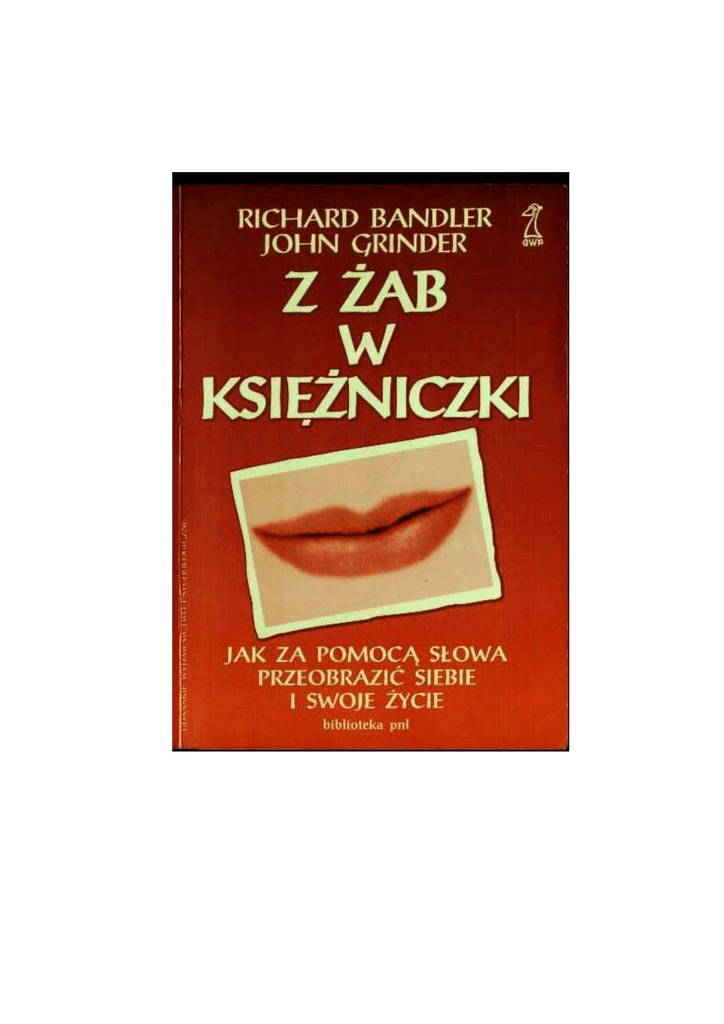 RICHARD BANDLER JOHN QRINDER Z ŻAB W KSIĘŻNICZKI JAK ZA POMOCĄ SŁOWA PRZEOBRAZIĆ SIEBIE l SWOJE ŻYCIE przełożyła: Danuta Golec GWP GDAŃSKIE WYDAWNICTWO PSYCHOLOGICZNE Gdańsk 1995 Tytuł oryginału: Frogs into Princes Copyright © by Real People Press Copyright © for the Polish edition by Gdańskie Wydawnictwo Psychologiczne, Gdańsk 1994 Wszystkie prawa zastrzeżone. Książka ani żadna jej część nie może być przedrukowywana, reprodukowana, ani odczytywana w środkach masowego przekazu bez pisemnej zgody Gdańskiego Wydawnictwa Psychologicznego Pierwsze wydanie w języku polskim Redakcja: Bożena Budzińska Korekta: Wioletta Jaworska, Janina Lorkowska Projekt okładki: Jarosław Czarnecki ISBN 83-85416-31-5 Druk: Prasowe Zakłady Graficzne, Bydgoszcz, ul. Wojska Polskiego l Gdańskie Wydawnictwo Psychologiczne 81-758 Sopot, ul. Piastów Ula, tel. lfax 51-61-04 Spis treści Wstęp......... Przedmowa Rozdział l Doświadczenie sensoryczne. Rozdział 2 Zmienianie osobistej historii i organizacji. Rozdział 3 Odkrywanie nowych dróg. Wyzwanie dla czytelnika Czytelnik powieści sensacyjnej czy szpiegowskiej może oczekiwać, że napotka w książce serię wskazówek - fragmentarycznych opisów wcześniejszych wydarzeń. Te fragmenty, po poskładaniu są dla uważnego czytelnika wystarczającym materiałem do odtworzenia biegu wypadków, a nawet do zrozumienia poszczególnych działań i motywacji bohaterów - lub chociażby dojścia do wyjaśnienia, jakie autor przedstawi na końcu książki. Mniej uważny czytelnik czerpiąc z czytania rozrywkę dochodzi do swego bardziej prywatnego pojmowania akcji, którego może nawet nie być świadomym. Autor powieści jest zobowiązany do umieszczenia w jej treści takiej liczby wskazówek, by rekonstrukcja akcji była możliwa, ale nie oczywista. Ta książka jest także zapisem historii w pewnym sensie sensacyjnej. Znacznie różni się jednak od tradycyjnej sensacji. Jest pisemną relacją z wydarzeń, które były opowiadane, a opowiadanie historii jest umiejętnością zupełnie inną niż spisywanie jej. Opowiadający wykorzystuje reakcje słuchacza czy widza i na ich podstawie określa, ile wskazówek powinien dostarczyć. Przekazywane przez słuchacza sygnały są dwojakiego rodzaju: (1) werbalne, celowe i świadome informacje zwrotne - te, z których przekazywania słuchacz czy też widz zdaje sobie sprawę i (2) pozawerbalne, spontaniczne, nieświadome reakcje, takie jak spojrzenia, wyraz zaskoczenia, widoczny na twarzy wysiłek kojarzenia faktów - te sygnały słuchacz przekazuje opowiadającemu nie zauważając tego. Ważną umiejętnością w sztuce opowiadania jest wykorzystanie tych nieświadomych przekazów od słuchacza czy widza i dostarczenie tylu wskazówek, że słuchacz dochodzi do rozwiązania, zanim świadomie to dostrzeże. Takiemu artyzmowi zawdzięczamy upragnione uczucia zaskoczenia i zachwytu - odkrycia, że wiemy wiele więcej niż nam się wydaje. Uwielbiamy dostarczać tego rodzaju doświadczeń na naszych seminariach. I podczas gdy relacja, jaką przekażemy na kolejnych stronach tej książki wydaje się zawierać wystarczającą ilość wskazówek dla uczestnika seminarium, tylko bardziej uważnemu czytelnikowi uda się w pełni zrekonstruować wcześniejsze wydarzenia. Jak jasno stwierdzamy w naszej książce, komponent werbalny jest najmniej interesującym i najmniej znaczącym składnikiem porozumiewania się. A przecież jest to jedyny sposób przekazu, jaki otrzymuje tu czytelnik. Podstawowym przedmiotem analizy w bezpośrednim porozumiewaniu się jest sprzężenie reakcji. Gdybyś, na przykład, otrzymał zadanie opisania interakcji pomiędzy kotem a psem, zacząłbyś pewnie mniej więcej tak: „Kot fuka, ^pies odsłania zęby, ...kot wygina grzbiet, ...pies szczeka, ...kot... tal.” Co najmniej tak samo ważna, jak każde z opisanych zachowań, jest ich sekwencja. I do pewnego stopnia, każda z po-szczególnych reakcji kota staje się zrozumiała tylko w kontekście zachowań psa. Jeśli z jakichś powodów twoje obserwacje zostałyby ograniczone tylko do tego, co robi kot, odtworzenie bodźców dla jego reakcji byłoby nie lada zadaniem. Zachowanie zwierzaka jest o wiele trudniejsze do zrozumienia, jeśli analizuje je się w oderwaniu od wywołujących je czynników. Chcemy zapewnić czytelnika, że niesekwencyjne, zaskakujące wątki, nie zapowiedziane zmiany treści, nastroju lub kierunku akcji, na które natrafi w książce, mają w oryginalnym kontekście swoją własną, nieodpartą logikę. Jeśli te w innym przypadku niezrozumiałe sekwencje porozumiewania się zostałyby sprowadzone do swego oryginalnego kontekstu, szybko ujawniłaby się ich rzeczywista logika. I stąd wyzwanie: Czy czytelnik jest na tyle bystry, by odtworzyć ów kontekst, czy też będzie po prostu czerpał przyjemność z opisu interakcji i dojdzie do użytecznego, nieświadomego zrozumienia, mającego charakter bardziej osobisty? John Grinder Richard Bandler Przedmowa Od kiedy dwadzieścia lat temu zdobyłem dyplom u Abe Masłowa, interesowałem się edukacją, poznawałem różne terapie, doświadczenia rozwoju i inne metody zmiany osobowości. Dziesięć lat później spotkałem Fritza Perlsa i zająłem się terapią gestalt, gdyż wydawała się efektywniejsza niż większość innych systemów. W zasadzie wszystkie metody okazują się skuteczne dla niektórych ludzi i w rozwiązywaniu niektórych problemów. Prawie wszystkie metody wymagają dużo więcej niż mogą zaoferować, a większość teorii ma niewiele wspólnego z metodami, jakie opisuje. Kiedy po raz pierwszy zetknąłem się z Programowaniem Neuro-lingwistycznym byłem jednocześnie zafascynowany i pełen sceptycyzmu. Skutecznie wbito mi do głowy, że zmiana następuje powoli i jest zazwyczaj bardzo trudna i bolesna. Wciąż mam pewien kłopot ze świadomym uznaniem faktu, że na ogół mogę uleczyć fobię lub podobny problem o długotr