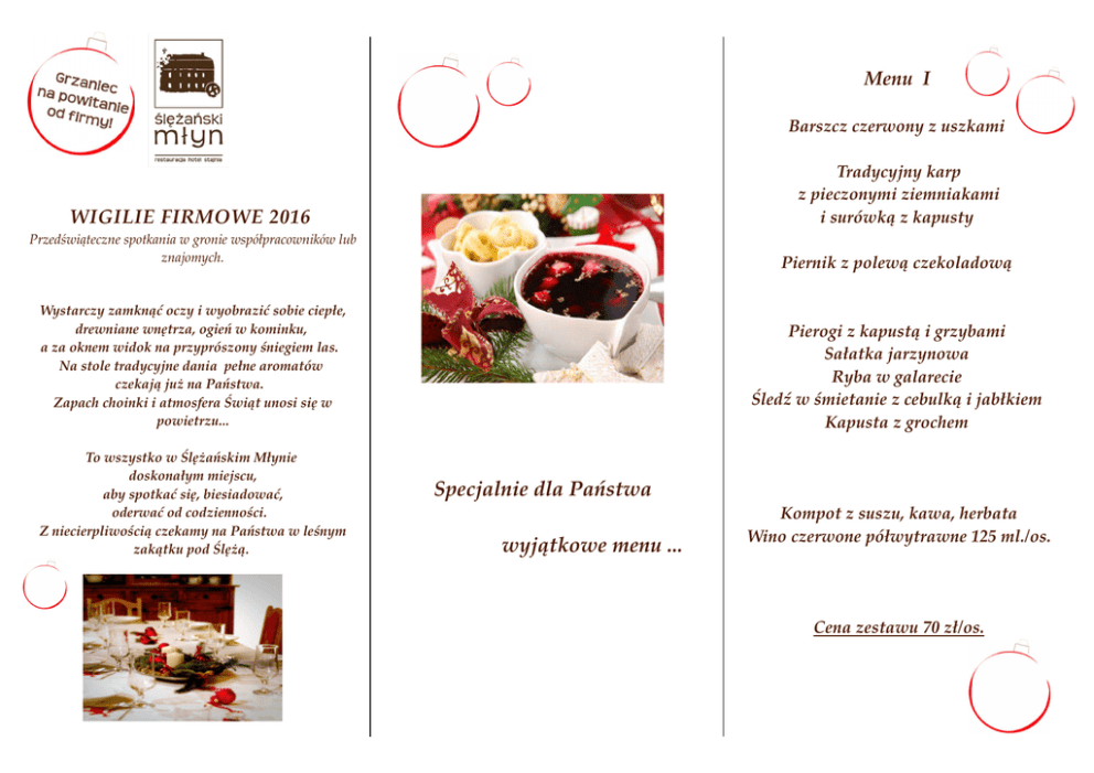 Menu I Barszcz czerwony z uszkami Tradycyjny karp z pieczonymi ziemniakami i surówką z kapusty WIGILIE FIRMOWE 2016 Przedświąteczne spotkania w gronie współpracowników lub znajomych. Piernik z polewą czekoladową Wystarczy zamknąć oczy i wyobrazić sobie ciepłe, drewniane wnętrza, ogień w kominku, a za oknem widok na przyprószony śniegiem las. Na stole tradycyjne dania pełne aromatów czekają już na Państwa. Zapach choinki i atmosfera Świąt unosi się w powietrzu... To wszystko w Ślężańskim Młynie doskonałym miejscu, aby spotkać się, biesiadować, oderwać od codzienności. Z niecierpliwością czekamy na Państwa w leśnym zakątku pod Ślężą. Pierogi z kapustą i grzybami Sałatka jarzynowa Ryba w galarecie Śledź w śmietanie z cebulką i jabłkiem Kapusta z grochem Specjalnie dla Państwa wyjątkowe menu ... Kompot z suszu, kawa, herbata Wino czerwone półwytrawne 125 ml./os. Cena zestawu 70 zł/os. Menu II Menu III Zupa grzybowa z łazankami Zupa rybna z grzankami Na życzenie możemy przygotować dla Państwa także inne dania! Grillowany pstrąg z ziołowymi ziemniakami z pieca i fasolką szparagową Zapiekany filet z dorsza z puree ziemniaczanym i buraczkami na ciepło Chętnie pomożemy w doborze menu. Makowiec z bakaliami Sernik z musem malinowym Sałatka śledziowa Ryba po grecku Kluski z makiem Jaja faszerowane musem wędzonej ryby Barszcz czerwony z pasztecikiem Karp w galarecie Tatar z łososia wędzonego na grzance Śledź z cebulką i ogórkiem Terrine z wędzonym pstrągiem z suszonymi pomidorami Pieczone pierogi z kapustą i grzybami Kompot z suszu, kawa, herbata Wino czerwone półwytrawne 125 ml./os. Kompot z suszu, kawa, herbata Wino czerwone półwytrawne 125 ml./os. W sprawie rezerwacji / pytań prosimy o kontakt: [email protected] lub 74 850 77 09. Zapraszamy na: www.facebook.com/slezanski.mlyn Cena zestawu 75 zł/os. Cena zestawu 80 zł/os. Do miłego zobaczenia!