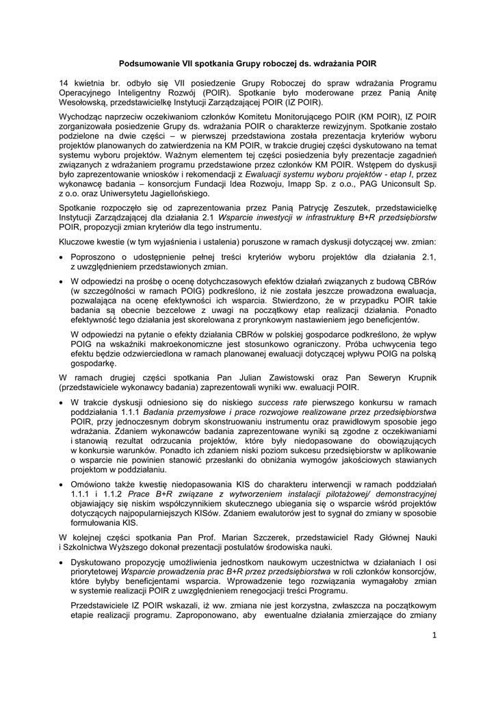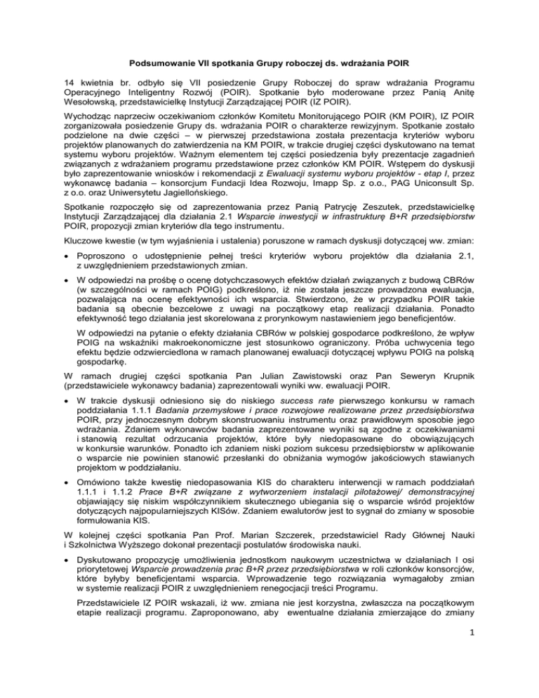 Podsumowanie VII spotkania Grupy roboczej ds. wdrażania POIR 14 kwietnia br. odbyło się VII posiedzenie Grupy Roboczej do spraw wdrażania Programu Operacyjnego Inteligentny Rozwój (POIR). Spotkanie było moderowane przez Panią Anitę Wesołowską, przedstawicielkę Instytucji Zarządzającej POIR (IZ POIR). Wychodząc naprzeciw oczekiwaniom członków Komitetu Monitorującego POIR (KM POIR), IZ POIR zorganizowała posiedzenie Grupy ds. wdrażania POIR o charakterze rewizyjnym. Spotkanie zostało podzielone na dwie części – w pierwszej przedstawiona została prezentacja kryteriów wyboru projektów planowanych do zatwierdzenia na KM POIR, w trakcie drugiej części dyskutowano na temat systemu wyboru projektów. Ważnym elementem tej części posiedzenia były prezentacje zagadnień związanych z wdrażaniem programu przedstawione przez członków KM POIR. Wstępem do dyskusji było zaprezentowanie wniosków i rekomendacji z Ewaluacji systemu wyboru projektów - etap I, przez wykonawcę badania – konsorcjum Fundacji Idea Rozwoju, Imapp Sp. z o.o., PAG Uniconsult Sp. z o.o. oraz Uniwersytetu Jagiellońskiego. Spotkanie rozpoczęło się od zaprezentowania przez Panią Patrycję Zeszutek, przedstawicielkę Instytucji Zarządzającej dla działania 2.1 Wsparcie inwestycji w infrastrukturę B+R przedsiębiorstw POIR, propozycji zmian kryteriów dla tego instrumentu. Kluczowe kwestie (w tym wyjaśnienia i ustalenia) poruszone w ramach dyskusji dotyczącej ww. zmian: Poproszono o udostępnienie pełnej treści kryteriów wyboru projektów dla działania 2.1, z uwzględnieniem przedstawionych zmian. W odpowiedzi na prośbę o ocenę dotychczasowych efektów działań związanych z budową CBRów (w szczególności w ramach POIG) podkreślono, iż nie została jeszcze prowadzona ewaluacja, pozwalająca na ocenę efektywności ich wsparcia. Stwierdzono, że w przypadku POIR takie badania są obecnie bezcelowe z uwagi na początkowy etap realizacji działania. Ponadto efektywność tego działania jest skorelowana z prorynkowym nastawieniem jego beneficjentów. W odpowiedzi na pytanie o efekty działania CBRów w polskiej gospodarce podkreślono, że wpływ POIG na wskaźniki makroekonomiczne jest stosunkowo ograniczony. Próba uchwycenia tego efektu będzie odzwierciedlona w ramach planowanej ewaluacji dotyczącej wpływu POIG na polską gospodarkę. W ramach drugiej części spotkania Pan Julian Zawistowski oraz Pan Seweryn Krupnik (przedstawiciele wykonawcy badania) zaprezentowali wyniki ww. ewaluacji POIR. W trakcie dyskusji odniesiono się do niskiego success rate pierwszego konkursu w ramach poddziałania 1.1.1 Badania przemysłowe i prace rozwojowe realizowane przez przedsiębiorstwa POIR, przy jednoczesnym dobrym skonstruowaniu instrumentu oraz prawidłowym sposobie jego wdrażania. Zdaniem wykonawców badania zaprezentowane wyniki są zgodne z oczekiwaniami i stanowią rezultat odrzucania projektów, które były niedopasowane do obowiązujących w konkursie warunków. Ponadto ich zdaniem niski poziom sukcesu przedsiębiorstw w aplikowanie o wsparcie nie powinien stanowić przesłanki do obniżania wymogów jakościowych stawianych projektom w poddziałaniu. Omówiono także kwestię niedopasowania KIS do charakteru interwencji w ramach poddziałań 1.1.1 i 1.1.2 Prace B+R związane z wytworzeniem instalacji pilotażowej/ demonstracyjnej objawiający się niskim współczynnikiem skutecznego ubiegania się o wsparcie wśród projektów dotyczących najpopularniejszych KISów. Zdaniem ewalutorów jest to sygnał do zmiany w sposobie formułowania KIS. W kolejnej części spotkania Pan Prof. Marian Szczerek, przedstawiciel Rady Głównej Nauki i Szkolnictwa Wyższego dokonał prezentacji postulatów środowiska nauki. Dyskutowano propozycję umożliwienia jednostkom naukowym uczestnictwa w działaniach I osi priorytetowej Wsparcie prowadzenia prac B+R przez przedsiębiorstwa w roli członków konsorcjów, które byłyby beneficjentami wsparcia. Wprowadzenie tego rozwiązania wymagałoby zmian w systemie realizacji POIR z uwzględnieniem renegocjacji treści Programu. Przedstawiciele IZ POIR wskazali, iż ww. zmiana nie jest korzystna, zwłaszcza na początkowym etapie realizacji programu. Zaproponowano, aby ewentualne działania zmierzające do zmiany 1 POIR zostały przeanalizowane dopiero po uzyskaniu rekomendacji płynących z oceny pierwszych konkursów. Stanowisko to zostało poparte przez przedstawicieli NCBR, którzy ponadto wyrazili zastrzeżenie co do stopnia profesjonalizacji dużych ośrodków badawczych do sprawnego prowadzenia projektów w partnerstwie z przedsiębiorcami. Podkreślono ponadto, iż NCBR stosuje podejście na wzór amerykańskiego, zgodnie z którym większość prac B+R jest realizowana przez wewnętrzne działy badawcze tych firm (in-house R&D). Jednocześnie członkowie Grupy roboczej wyrazili aprobatę dla zastosowania wyłączeń spod stosowania zasady konkurencyjności w przypadku spełnienia warunków opisanych w art. 4 pkt 3 lit. e ustawy PZP, zgodnie z pismem Pani Minister Jadwigi Emilewicz, z dnia 23 lutego br. Ponadto w odniesieniu do uwagi, aby nie ograniczać możliwości aplikowania do działania 4.2 Rozwój nowoczesnej infrastruktury badawczej sektora nauki POIR tylko do projektów znajdujących się na PMDIB, przedstawiciel MNiSW podkreślił, iż wynik I konkursu w ww. działaniu można uznać za sukces – z kilkunastu projektów nad którymi pracowano, złożono 7 najlepszych. Jednocześnie poinformował o przygotowaniach do aktualizacji Mapy. Przedstawiciel NCBR zaakcentował zaś możliwość weryfikacji warunków realizacji II konkursu w ramach działania 4.2. Kolejna część spotkania była poświęcona uwagom Stowarzyszenia Ośrodków Organizatorów Innowacji i Przedsiębiorczości w Polsce zaprezentowanym przez Panią Marzenę Mażewską do systemu akredytacji ośrodków innowacji prowadzonej przez Ministerstwo Rozwoju oraz d