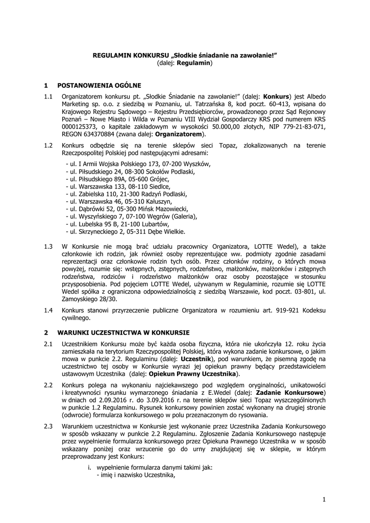 REGULAMIN KONKURSU „Słodkie śniadanie na zawołanie!” (dalej: Regulamin) 1 POSTANOWIENIA OGÓLNE 1.1 Organizatorem konkursu pt. „Słodkie Śniadanie na zawołanie!” (dalej: Konkurs) jest Albedo Marketing sp. o.o. z siedzibą w Poznaniu, ul. Tatrzańska 8, kod poczt. 60-413, wpisana do Krajowego Rejestru Sądowego – Rejestru Przedsiębiorców, prowadzonego przez Sąd Rejonowy Poznań – Nowe Miasto i Wilda w Poznaniu VIII Wydział Gospodarczy KRS pod numerem KRS 0000125373, o kapitale zakładowym w wysokości 50.000,00 złotych, NIP 779-21-83-071, REGON 634370884 (zwana dalej: Organizatorem). 1.2 Konkurs odbędzie się na terenie sklepów sieci Rzeczpospolitej Polskiej pod następującymi adresami: - ul. ul. ul. ul. ul. ul. ul. ul. ul. ul. Topaz, zlokalizowanych na terenie I Armii Wojska Polskiego 173, 07-200 Wyszków, Piłsudskiego 24, 08-300 Sokołów Podlaski, Piłsudskiego 89A, 05-600 Grójec, Warszawska 133, 08-110 Siedlce, Zabielska 110, 21-300 Radzyń Podlaski, Warszawska 46, 05-310 Kałuszyn, Dąbrówki 52, 05-300 Mińsk Mazowiecki, Wyszyńskiego 7, 07-100 Węgrów (Galeria), Lubelska 95 B, 21-100 Lubartów, Skrzyneckiego 2, 05-311 Dębe Wielkie. 1.3 W Konkursie nie mogą brać udziału pracownicy Organizatora, LOTTE Wedel), a także członkowie ich rodzin, jak również osoby reprezentujące ww. podmioty zgodnie zasadami reprezentacji oraz członkowie rodzin tych osób. Przez członków rodziny, o których mowa powyżej, rozumie się: wstępnych, zstępnych, rodzeństwo, małżonków, małżonków i zstępnych rodzeństwa, rodziców i rodzeństwo małżonków oraz osoby pozostające w stosunku przysposobienia. Pod pojęciem LOTTE Wedel, używanym w Regulaminie, rozumie się LOTTE Wedel spółka z ograniczona odpowiedzialnością z siedzibą Warszawie, kod poczt. 03-801, ul. Zamoyskiego 28/30. 1.4 Konkurs stanowi przyrzeczenie publiczne Organizatora w rozumieniu art. 919-921 Kodeksu cywilnego. 2 WARUNKI UCZESTNICTWA W KONKURSIE 2.1 Uczestnikiem Konkursu może być każda osoba fizyczna, która nie ukończyła 12. roku życia zamieszkała na terytorium Rzeczypospolitej Polskiej, która wykona zadanie konkursowe, o jakim mowa w punkcie 2.2. Regulaminu (dalej: Uczestnik), pod warunkiem, że pisemną zgodę na uczestnictwo tej osoby w Konkursie wyrazi jej opiekun prawny będący przedstawicielem ustawowym Uczestnika (dalej: Opiekun Prawny Uczestnika). 2.2 Konkurs polega na wykonaniu najciekawszego pod względem oryginalności, unikatowości i kreatywności rysunku wymarzonego śniadania z E.Wedel (dalej: Zadanie Konkursowe) w dniach od 2.09.2016 r. do 3.09.2016 r. na terenie sklepów sieci Topaz wyszczególnionych w punkcie 1.2 Regulaminu. Rysunek konkursowy powinien zostać wykonany na drugiej stronie (odwrocie) formularza konkursowego w polu przeznaczonym do rysowania. 2.3 Warunkiem uczestnictwa w Konkursie jest wykonanie przez Uczestnika Zadania Konkursowego w sposób wskazany w punkcie 2.2 Regulaminu. Zgłoszenie Zadania Konkursowego następuje przez wypełnienie formularza konkursowego przez Opiekuna Prawnego Uczestnika w w sposób wskazany poniżej oraz wrzucenie go do urny znajdującej się w sklepie, w którym przeprowadzany jest Konkurs: i. wypełnienie formularza danymi takimi jak: - imię i nazwisko Uczestnika, 1 - wiek uczestnika, - adres zamieszkania Uczestnika - imię i nazwisko Opiekuna Prawnego Uczestnika, - adres do wysyłki nagrody, - numer telefonu Opiekuna Prawnego do kontaktu; ii. wyrażenie przez Opiekuna Prawnego Uczestnika zgody na udział Uczestnika w Konkursie poprzez złożenie własnoręcznego, czytelnego podpisu pod treścią znajdującego się na formularzu oświadczenia, w tym potwierdzenie zapoznania się z Regulaminem Konkursu i akceptacja jego postanowień, iii. wyrażenie zgody na przetwarzanie danych osobowych Uczestnika oraz Opiekuna Prawnego przez LOTTE Wedel oraz Organizatora w celu przeprowadzenia Konkursu, iv. umieszczenie prawidłowo wypełnionego formularza w urnie znajdującej się na terenie sklepu Topaz. 2.4 Wykonanie Zadania Konkursowego, o którym mowa w pkt 2.2. Regulaminu: 2.4.1 powinno być wynikiem osobistej, samodzielnej twórczości Uczestnika, 2.4.2 nie może zawierać wulgaryzmów, treści obraźliwych lub treści sprzecznych z prawem, 2.4.3 nie może zawierać treści reklamowych dotyczących jakichkolwiek podmiotów, z wyłączeniem treści reklamowych dotyczących produktów LOTTE Wedel, 2.4.4 nie może naruszać praw osób trzecich, w tym w szczególności: dóbr osobistych i praw autorskich. 2.5 Wykonanie Zadania Konkursowego w sposób sprzeczny z treścią punktu 2.4 Regulaminu skutkuje wykluczeniem Uczestnika z Konkursu z jednoczesnym wygaśnięciem prawa do nagród wymienionych w punkcie 3 Regulaminu. 2.6 Organizator zastrzega sobie prawo weryfikacji, czy Uczestnik oraz Opiekun Prawny Uczestnika spełniają warunki określone w niniejszym Regulaminie. W tym celu może żądać od Opiekuna Prawnego Uczestnika złożenia określonych oświadczeń na piśmie, podania określonych danych bądź przedłożenia określonych dokumentów niezbędnych do prawidłowego uczestnictwa Uczestnika w Konkursie, w tym podania adresu zamieszkania. Niespełnienie warunków wynikających z niniejszego Regulaminu lub nieuzasadniona odmowa spełnienia powyższych żądań po przeprowadzeniu postępowania wyjaśniającego może spowodować wykluczenie danego Uczestnika z Konkursu z jednoczesnym wygaśnięciem prawa do nagród wymienionych w pkt 3 poniżej. 3 NAGRODY W KONKURSIE 3.1 Nagrodami w Konkursie są: 3.1.1 Nagroda I stopnia: aparat Fujifilm Instax o wartości rynkowej 289,00 zł (słownie: dwieście osiemdziesiąt dziewięć złotych 00/100) brutto, wraz z dodatkową nagrodą pieniężną w wysokości 32,00 zł (słownie: trzydzieści dwa złote 00/100) przeznaczoną na pokrycie należnego podatku dochodowego od osób fizycznych od wygranej w Konkursie, 3.1.2 Nagrody II stopnia: piórniki o wartości rynkowej: 44,50 zł (s