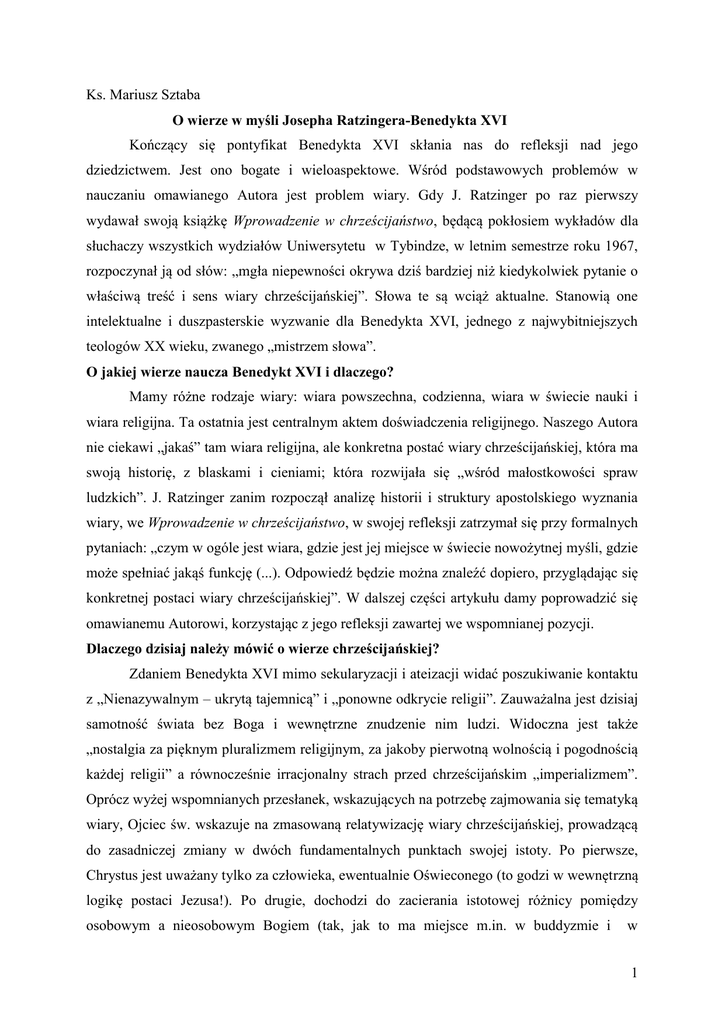 Ks. Mariusz Sztaba O wierze w myśli Josepha Ratzingera-Benedykta XVI Kończący się pontyfikat Benedykta XVI skłania nas do refleksji nad jego dziedzictwem. Jest ono bogate i wieloaspektowe. Wśród podstawowych problemów w nauczaniu omawianego Autora jest problem wiary. Gdy J. Ratzinger po raz pierwszy wydawał swoją książkę Wprowadzenie w chrześcijaństwo, będącą pokłosiem wykładów dla słuchaczy wszystkich wydziałów Uniwersytetu w Tybindze, w letnim semestrze roku 1967, rozpoczynał ją od słów: „mgła niepewności okrywa dziś bardziej niż kiedykolwiek pytanie o właściwą treść i sens wiary chrześcijańskiej”. Słowa te są wciąż aktualne. Stanowią one intelektualne i duszpasterskie wyzwanie dla Benedykta XVI, jednego z najwybitniejszych teologów XX wieku, zwanego „mistrzem słowa”. O jakiej wierze naucza Benedykt XVI i dlaczego? Mamy różne rodzaje wiary: wiara powszechna, codzienna, wiara w świecie nauki i wiara religijna. Ta ostatnia jest centralnym aktem doświadczenia religijnego. Naszego Autora nie ciekawi „jakaś” tam wiara religijna, ale konkretna postać wiary chrześcijańskiej, która ma swoją historię, z blaskami i cieniami; która rozwijała się „wśród małostkowości spraw ludzkich”. J. Ratzinger zanim rozpoczął analizę historii i struktury apostolskiego wyznania wiary, we Wprowadzenie w chrześcijaństwo, w swojej refleksji zatrzymał się przy formalnych pytaniach: „czym w ogóle jest wiara, gdzie jest jej miejsce w świecie nowożytnej myśli, gdzie może spełniać jakąś funkcję (...). Odpowiedź będzie można znaleźć dopiero, przyglądając się konkretnej postaci wiary chrześcijańskiej”. W dalszej części artykułu damy poprowadzić się omawianemu Autorowi, korzystając z jego refleksji zawartej we wspomnianej pozycji. Dlaczego dzisiaj należy mówić o wierze chrześcijańskiej? Zdaniem Benedykta XVI mimo sekularyzacji i ateizacji widać poszukiwanie kontaktu z „Nienazywalnym – ukrytą tajemnicą” i „ponowne odkrycie religii”. Zauważalna jest dzisiaj samotność świata bez Boga i wewnętrzne znudzenie nim ludzi. Widoczna jest także „nostalgia za pięknym pluralizmem religijnym, za jakoby pierwotną wolnością i pogodnością każdej religii” a równocześnie irracjonalny strach przed chrześcijańskim „imperializmem”. Oprócz wyżej wspomnianych przesłanek, wskazujących na potrzebę zajmowania się tematyką wiary, Ojciec św. wskazuje na zmasowaną relatywizację wiary chrześcijańskiej, prowadzącą do zasadniczej zmiany w dwóch fundamentalnych punktach swojej istoty. Po pierwsze, Chrystus jest uważany tylko za człowieka, ewentualnie Oświeconego (to godzi w wewnętrzną logikę postaci Jezusa!). Po drugie, dochodzi do zacierania istotowej różnicy pomiędzy osobowym a nieosobowym Bogiem (tak, jak to ma miejsce m.in. w buddyzmie i w 1 hinduizmie). Poza tym wielkim niebezpieczeństwem dla współczesnej wiary jest próba zsekularyzowania chrześcijaństwa po to, aby ubrało się po „cywilnemu w język świecki” i stało się „bezreligijnym chrześcijaństwem”. Egzystencjalna ważność i „praktyczność” wiary chrześcijańskiej W nauczaniu Benedykta XVI Bóg prezentowany w chrześcijaństwie jest „istnością «praktyczną», a nie tylko zwieńczeniem teoretycznym obrazu świata, które dostarcza pociechy – które można przyjąć lub po prostu obejść i ominąć. W dzisiejszych czasach widzimy to wszędzie tam, gdzie świadome negowanie Jego istnienia stało się konsekwentną postawą i gdzie nic już nie łagodzi Jego nieobecności. Gdy bowiem odchodzi się od Boga, z początku wszystko zdaje się toczyć tak jak dotychczas. Fundamentalne decyzje, podstawowe formy życia nadal trwają, choć utraciły już swe uzasadnienie. Ale jak pokazał Nietzsche, wszystko się zmienia, gdy, koniec końców, rzeczywiście pojawia się wieść, ze Bóg jest martwy – wieść. Która godzi nas w samo serce. Współcześnie tak stan można dostrzec przede wszystkim w podejściu nauki do ludzkiego życia: dla nauki czlowieka jako czlowieka coraz bardziej znika, niejako automatycznie stając się obiektem technicznym (...). Jak człowiek będzie postrzegał człowieka, jeśli nie będzie już mógł w drugim dostrzec śladów Bożej tajemnicy, a jedynie własną zdolność wytwarzania (...). Powinniśmy się zastanowić, czy Bóg nie jest prawdziwą i właściwą rzeczywistością, fundamentalnym założeniem wszelkiego «realizmu», tak iż bez Niego nic nie może być zdrowe”? Benedykt XVI wciąż przypomina, że wiara chrześcijańska nie dotyczy tylko tego, co wieczne, ale „ma do czynienia z Bogiem w historii, z Bogiem jako człowiekiem” dlatego przerzuca „most ponad przepaścią miedzy wiecznością a doczesnością, między tym, co widzialne, i tym, co niewidzialne (...). Wiara chrześcijańska obejmuje wszystkie dziedziny życia, tkwi w nurcie historii i czasu, ma znaczenie także poza sferą naszych subiektywnych wyobrażeń” dlatego chrześcijańskie przesłanie ma moc stania się wspólnym drogowskazem. Wiara i niewiara problemem ludzi wierzących i niewierzących Benedykt XVI analizując życie świętych, chociażby św. Teresy z Lisieux, czy też bł. Teresa z Kalkuty zauważa, że przeżywały one „dręczącą moc niewiary w głębi własnej wiary”. Dlatego też pisał we Wprowadzenie w chrześcijaństwo, że „wierzącemu zagraża przede wszystkim to, że ogarniająca go w chwilach trudność, że niepewność stawi mu nagle twardo przed oczami kruchość całości wiary, całości, która zwykle wydaje się sama przez się zrozumiała”. Wątpienie i wiara zdaniem naszego Autora to normalna sytuacja człowieka wobec zagadnienia Boga. Wierzący wyznaje swa wiarę „na oceanie nicości, wśród ciągłych niebezpieczeństw i powątpiewań”. Dlatego dopowie J. Ratzinger, że „zasadniczą sprawą losu 2 człowieka jest móc odnal