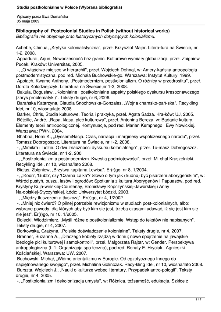 Studia postkolonialne w Polsce (Wybrana bibliografia) Wpisany przez Ewa Domańska 05 maja 2009 Bibliography of Postcolonial Studies in Polish (without historical works) Bibliografia nie obejmuje prac historycznych dotyczących kolonializmu. Achebe, Chinua, „Krytyka kolonialistyczna", przeł. Krzysztof Majer. Literatura na Świecie, nr 1-2, 2008. Appadurai, Arjun, Nowoczesność bez granic. Kulturowe wymiary globalizacji, przeł. Zbigniew Pucek. Kraków: Universitas, 2005. -, „O właściwe miejsce w hierarchii", przeł. Wojciech Dohnal, w: Amerykańska antropologia postmodernistyczna, pod red. Michała Buchowskiego. Warszawa: Instytut Kultury, 1999. Appiach, Kwame Anthony, „Postmodernizm, postkolonializm. O różnicy w przedrostku", przeł. Dorota Kołodziejczyk. Literatura na Świecie,nr 1-2, 2008. Bakuła, Bogusław, „Kolonialne i postkolonialne aspekty polskiego dyskursu kresoznawczego (zarys problematyki)". Teksty drugie, nr 6, 2006. Barańska Katarzyna, Claudia Snochowska-Gonzales, „Wojna chamsko-pańska". Recykling Idei, nr 10, wiosna/lato 2008. Barker, Chris, Studia kulturowe. Teoria i praktyka, przeł. Agata Sadza. Kraków: UJ, 2005. Béteille, André, „Rasa, klasa, płeć kulturowa", przeł. Antonina Bereza, w: Badanie kultury. Elementy teorii antropologicznej. Kontynuacje, pod red. Marian Kempnego i Ewy Nowickiej. Warszawa: PWN, 2004. Bhabha, Homi K., „DyssemiNacja. Czas, narracja i marginesy współczesnego narodu", przeł. Tomasz Dobrogoszcz. Literatura na Świecie, nr 1-2, 2008. -, „Mimikra i ludzie. O dwuznaczności dyskursu kolonialnego", przeł. Tomasz Dobrogoszcz. Literatura na Świecie, nr 1-2, 200 -, „Postkolonializm a postmodernizm. Kwestia podmiotowości", przeł. Michał Kruszelnicki. Recykling Idei, nr 10, wiosna/lato 2008. Białas, Zbigniew, „Brzytwa kapitana Lewisa". Er(r)go, nr 8, 1/2004. -, „'Koori', 'Gubb', czy 'Czarna Lalka'? Słowo o tym jak (trudno) być pisarzem aborygeńskim", w: Wśród pustyń, buszu, lasów i ogrodów: Spotkania z kulturą Aborygenów i Papuasów, pod red. Krystyny Kujawińskiej-Courtenay, Bronisławy Kopczyńskiej-Jaworskiej i Anny Nadolskiej-Styczyńskiej. Łódź: Uniwersytet Łódzki, 2003. -, „Między tłuszczem a tłuszczą". Er(r)go, nr 4, 1/2002. -, „Mniej niż ćwierć? O pilnej potrzebie rewizjonizmu w studiach postkolonialnych, albo: wybrane powody, dla których aby być kim się jest, trzeba czasami udawać, iż się jest kim się nie jest". Er(r)go, nr 10, 1/2005. Bolecki, Włodzimierz, „Myśli różne o postkolonializmie. Wstęp do tekstów nie napisanych". Teksty drugie, nr 4, 2007. Borkowska, Grażyna, „Polskie doświadczenie kolonialne". Teksty drugie, nr 4, 2007. Brenner, Suzanne A., „Dlaczego kobiety rządzą w domu; nowe spojrzenie na jawajskie ideologie płci kulturowej i samokontroli", przeł. Małgorzata Rajtar, w: Gender. Perspektywa antropologiczna (t. 1: Organizacja społeczna), pod red. Renaty E. Hryciuk i Agnieszki Kościańskiej. Warszawa: UW, 2007. Buchowski, Michał, „Widmo orientalizmu w Europie. Od egzotycznego Innego do napiętnowanego swojego", przeł. Michalina Golinczak. Recykling Idei, nr 10, wiosna/lato 2008. Burszta, Wojciech J., „Nauki o kulturze wobec literatury. Przypadek antropologii". Teksty drugie, nr 4, 2005. -, „Postkolonializm i dekolonizacja umysłu", w: Różnica, tożsamość, edukacja. Szkice z 1/7 Studia postkolonialne w Polsce (Wybrana bibliografia) Wpisany przez Ewa Domańska 05 maja 2009 pogranicza, pod red. Tomasza Szkudlarka. Kraków: Impuls, 1995. Buruma, Ian, Avishai Margalit, Okcydentalizm. Zachód w oczach wrogów, przeł. Adam Lipszyc. Kraków: Universitas, 2005. Cavanagh, Clare, „Postkolonialna Polska. Biała plama na mapie współczesnej teorii", przeł. Tomasz Kunz. Teksty drugie, nr 2-3, 2003. Chakrabarty, Dipesh, „Historie mniejszości, przeszłości podrzędne", przeł. Ewa Domańska. Literatura na Świecie, nr 1-2, 2008. -, „Postkolonialność a podstęp historii: kto wypowiada się w imieniu przeszłości Indii?", przeł. Daniel Vogel. Konteksty. Polska Sztuka Ludowa, nr 3-4, 2003. Channa, Subhadra Mitra, „Hinduska kobieta: konstrukt i prawda w dobie globalizacji", przeł. Marta Bierca, w: Gender. Perspektywa antropologiczna (t. 1: Organizacja społeczna), pod red. Renaty E. Hryciuk i Agnieszki Kościańskiej. Warszawa: UW, 2007. Chatterjee, Partha, „Nacjonalizm jako problem w historii myśli politycznej, przeł. Dorota Kołodziejczyk. Literatura na Świecie, nr 1-2, 2008. Chomiuk, Aleksandra, „'Nowy Markiz de Custine' albo o pewnej manipulacji". Teksty drugie, nr 1/2, 2006. Cichoń, Anna, „W kręgu zagadnień literatury kolonialnej - W Pustyni i w puszczy Henryka Sienkiewicza". Er(r)go, nr 8, 2004 Coetze, J.M., „Powieść afrykańska", przeł. Katarzyna Nowak. Er(r)go, nr 8, 1/2004 [fragment książki Elizabeth Castello, przeł. Zbigniew Batko. Kraków: Znak, 2006.] Domańska, Ewa, „Problem kryzysu historii akademickiej", w tejże, Historie niekonwencjonalne. Refleksja o przeszłości w nowej humanistyce. Poznań: Wydawnictwo Poznańskie, 2006 -, „Historiografia insurekcyjna". Literatura na Świecie, nr 1-2, 2008. -, „Obrazy PRL-u w perspektywie postkolonialnej", w: Obrazy PRL-u, pod red. Krzysztofa Brzechczyna. Poznań: IPN, 2008. Drong, Leszek, „Maciora czy macocha: postkolonialne dylematy Flanna O'Briena". Er(r)go, nr 8, 2004. Duć-Fajfer, Helena, „Etniczność a literatura", w: Kulturowa teoria literatury. Główne pojęcia i problemy, pod red. Michała Pawła Markowskiego i Ryszarda Nycza. Kraków: Universitas, 2006. Dumont, Louis, „Homo hierarchicus" kasta, rasizm i 'stratyfikacja'. Przemyślenia antropologa społecznego", przeł. Wojciech Połeć, w: Badanie kultury. Elementy teorii antropologicznej. Kontynuacje, pod red. Marian Kempnego i Ewy Nowickiej. Warszawa: PWN, 2004. Fanon, Frantz, Wyklęty lud ziemi, przeł. Hanna Tygielska. Warszawa: PIW, 1985. Ferens, Dominika, „Zwiedzanie cudzych