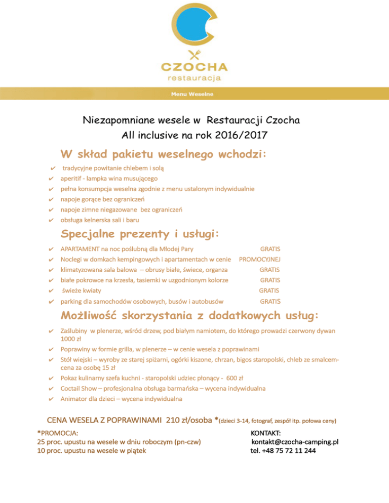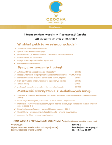 Niezapomniane wesele w Restauracji Czocha All inclusive na rok 2016/2017 W skład pakietu weselnego wchodzi: ✔ tradycyjne powitanie chlebem i solą ✔ aperitif - lampka wina musującego ✔ pełna konsumpcja weselna zgodnie z menu ustalonym indywidualnie ✔ napoje gorące bez ograniczeń ✔ napoje zimne niegazowane bez ograniczeń ✔ obsługa kelnerska sali i baru Specjalne prezenty i usługi: ✔ APARTAMENT na noc poślubną dla Młodej Pary ✔ Noclegi w domkach kempingowych i apartamentach w cenie GRATIS PROMOCYJNEJ ✔ klimatyzowana sala balowa – obrusy białe, świece, organza GRATIS ✔ białe pokrowce na krzesła, tasiemki w uzgodnionym kolorze GRATIS ✔ świeże kwiaty GRATIS GRATIS ✔ parking dla samochodów osobowych, busów i autobusów Możliwość skorzystania z dodatkowych usług: ✔ Zaślubiny w plenerze, wśród drzew, pod białym namiotem, do którego prowadzi czerwony dywan 1000 zł ✔ Poprawiny w formie grilla, w plenerze – w cenie wesela z poprawinami ✔ Stół wiejski – wyroby ze starej spiżarni, ogórki kiszone, chrzan, bigos staropolski, chleb ze smalcemcena za osobę 15 zł ✔ Pokaz kulinarny szefa kuchni - staropolski udziec płonący - 600 zł ✔ Coctail Show – profesjonalna obsługa barmańska – wycena indywidualna ✔ Animator dla dzieci – wycena indywidualna CENA WESELA Z POPRAWINAMI 210 zł/osoba *(dzieci 3-14, fotograf, zespół itp. połowa ceny) *PROMOCJA: 25 proc. upustu na wesele w dniu roboczym (pn-czw) 10 proc. upustu na wesele w piątek KONTAKT: [email protected] tel. +48 75 72 11 244 DANIA OBIADOWE DANIA I (Do wyboru 1 rodzaj + 1 rodzaj dodatkowo na poprawiny) - Rosół z makaronem domowym - Krem serowy z kluskami z szynki, pomidorem i szczypiorem - Krem z borowików z groszkiem ptysiowym - Krem pomidorowy ziołowy - Krem z kurczaka - Żurek z jajkiem i białą kiełbasą - inne I danie zaproponowane przez gości DANIA II (3 lub 4 do wyboru + 1 na poprawiny) • Kotlet schabowy panierowany • Kotlet drobiowy panierowany • Filet drobiowy scaloppini pod serem zapieczony •Tiftele drobiowe owinięte boczkiem • Nuggetsy drobiowe • Kotlet duet ze schabu przepleciony boczkiem • Schab ze śliwką i morelą • Bitki wieprzowe duszone w cebuli • Polędwiczki dijon • Sztucerki wieprzowe z polędwiczki • Pieczeń z karku • Roladki „Radziwiłł” z farszem z grzybów Roladki wieprzowe z farszem z boczku, ogórka i cebuli Kotlet „Belwederski” panierowany Sztuka mięsa wołowa Bitki wołowe SOSY (do wyboru 2 rodzaje) szary, ciemny, pieczeniowy, dijon, chrzanowy, pomidorowy, potrawkowy, koperkowy, ogórkowy, musztardowy, pieczeniowy DODATKI DO II DAŃ (do wyboru 2 rodzaje + 1 na poprawiny) • Ziemniaki (z wody, duszone, purre) z koperkiem • Frytki • Kluski śląskie • Kasze • Ryż • Cząstki obsmażane ziołowe ZESTAW SURÓWEK (do wyboru 2 rodzaje+ 1 na poprawiny) • Z kapusty białej • Z kapusty czerwonej • Z pora • Z kapusty pekińskiej • Z marchwi ( z ananasem, z chrzanem) • Z selera • Sałatka z buraczków • Sałatka szwedzka • Mizeria ze śmietaną WARZYWA NA CIEPŁO (do wyboru 1 rodzaj) • Bukiet warzyw na parze ( z masłem i migdałami) • Kapusta w śmietanie • Kapusta zasmażana • Kapusta modra • Buraczki zasmażane DANIA GORĄCE NOCNE (do wyboru 3 rodzaje) • Forszmak drogomirski (kęsy mięsa z warzywami w sosie) • Ryba w warzywach • Gołąbki z ryżem i mięsem • Zupa gulaszowa • Barszcz z krokietem (kapusta z pieczarkami) • Wybór pierogów obsmażanych • Flaki • Bogracz • Strogonof • Udziec płonący (za dopłatą) • Indyk fromage (za dopłatą) DANIA ZAKĄSKOWE SAŁATKI (do wyboru 2 szt.) • Sałatka węgierska pikantna (mięsna) • Sałatka jarzynowa tradycyjna • Sałatka z kurcząt z rodzynkami (mięsna) • Sałatka z serem feta (el^greco) • Sałatka szopska z chipsami z boczku • Sałatka cesarska z polędwiczkami z drobiu • Sałatka z kukurydzy firmowa • Sałatka z kukurydzy i tuńczyka • Sałatka kolorowa wielowarzywna • Sałatka meksykańska PRZEKĄSKI RYBNE (do wyboru 2 propozycje) • Śledź po kaszubsku • Śledź po wiejsku (ziołowy) • Śledź w oleju • Śledź w śmietanie • Rolada z łososia ze szpinakiem • Tatar z łososia ( za dopłatą) • Jajko z łososiem • Jajko z kawiorem • Filet z ryby w warzywach • Ryba w galarecie PRZEKĄSKI (do wyboru 4 rodzaje) • Jajko w sosie wiosennym • Jajko w szynce na sałatce • Tymbaliki w galarecie (galareta z drobiu) Patera mięs pieczonych, rolad, pasztetów pomidory faszerowane sałatką pomidorki faszerowane pastami smakowymi rożki z szynki z pastami melon z szynką dojrzewającą • szynka ze szparagami • befsztyk tatarski (za dopłatą) • brzoskwinia z serem niebieskim owinięta boczkiem DODATKI ( w ofercie) • Dodatki świeże (pomidor, ogórek) • Dodatki konserwowe (patisony, pieczarki, ogórki, papryka) • Pieczywo mieszane i chlebek weselny • Kawa, herbata, soki, woda mineralna – przez cały czas trwania imprezy Kontakt: Restauracja Czocha / ul. Baworowo 100A / 59-820 Leśna / tel. 75 72 11 244 / [email protected] www.czocha-hotel.pl