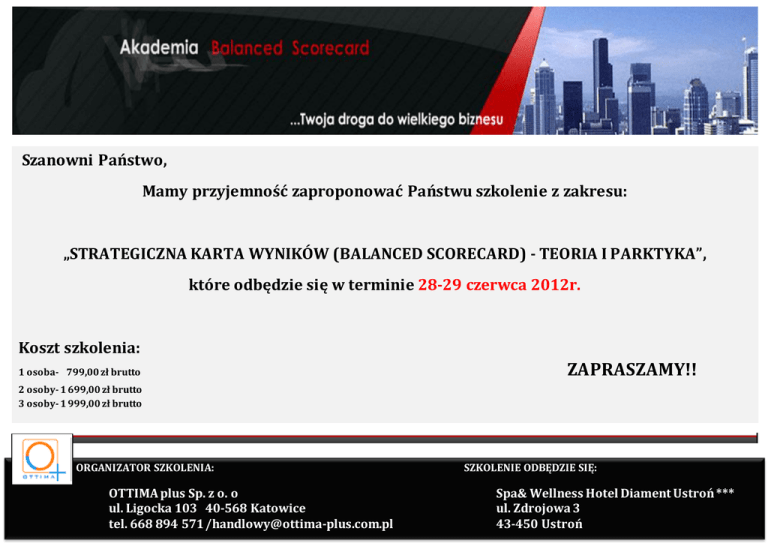 Szanowni Państwo, Mamy przyjemność zaproponować Państwu szkolenie z zakresu: „STRATEGICZNA KARTA WYNIKÓW (BALANCED SCORECARD) - TEORIA I PARKTYKA”, które odbędzie się w terminie 28-29 czerwca 2012r. Koszt szkolenia: 1 osoba- 799,00 zł brutto ZAPRASZAMY!! 2 osoby- 1 699,00 zł brutto 3 osoby- 1 999,00 zł brutto ORGANIZATOR SZKOLENIA: OTTIMA plus Sp. z o. o ul. Ligocka 103 40-568 Katowice tel. 668 894 571 /[email protected] SZKOLENIE ODBĘDZIE SIĘ: Spa& Wellness Hotel Diament Ustroń *** ul. Zdrojowa 3 43-450 Ustroń HARMONOGRAM SZKOLENIA: 09.00 11.00 11.00 13.00 13.00 13.15 13.15 15.00 15.00 15.40 15.40 17.00 17.00 18.00 18.00 20.00 I DZIEŃ ZAKWATEROWANIE 1.WPROWADZENIE 1.1 Przedstawienie prowadzących oraz grupy uczestników szkolenia 1.2 Omówienie przebiegu szkolenia i warsztatów 1.3 Przedstawienie programu szkolenia PRZERWA KAWOWA 2. ZARZĄDZANIE A EFEKTYWNOŚĆ ORGANIZACJI 2.1 Wprowadzenie pojęcia zarządzania wartością firmy (Value Based Management) oraz jej geneza związana ze strategiczną rachunkowością zarządczą 2.2 Identyfikacja kluczowych nośników wartości firmy- Value Drives 2.3 Wskaźnik EVA i MVA jako miary wartości firmy-zarządzanie poprzez EVA 2.4 Zarządzanie przez cele i wyniki PRZERWA OBIADOWA 3. BALANCED SCORECARD JAKO NARZĘDZIE WZROSTU WARTOŚCI FIRMY 3.1 Ocena możliwości wdrożenia BSC w firmie- potrzeba i zdolność do zmian 3.2 Wybór strategii wdrażania BSC 3.3 Przedstawianie poszczególnych etapy implementacji Karty Wyników 3.4 Najczęściej pojawiające się problemy podczas wdrażania BSC 3.5 Korzyści z wdrożenia BSC wg sprawdzonej metodyki 3.6 Przyczyny niepowodzeń we wdrażaniu strategii 4. KASKADOWANIE BSC NA NIŻSZE SZCZEBLE ZARZĄDZANIA 4.1 Poziom kaskadowania BSC 4.2 Odpowiedzialność za kolekcjonowanie i przetwarzanie danych 4.3 Kaskadowanie celów w organizacji 5. 21 KROKÓW WDROŻENIA BSC- PRAKTYCZNY PRZYKŁAD 6. WSPOMAGANIE KOMPUTEROWE BSC- ROZWIĄZANIA KLASY BUSINESS INTELIGENCE CZAS WOLNY NA SKORZYSTANIE Z ATRAKCJI HOTELOWYCH (BASEN, JACUZZI ORAZ SAUNA) 10.00 12.00 12.00 12.15 12.15 14.00 14.00 15.00 II DZIEŃ 1. Case study- studium przypadku, omówienie przykładów wdrożeniowych 2. Przykłady wizji różnych przedsiębiorstw 3. Przykłady misji różnych przedsiębiorstw 4. Przykłady wdrożenia BSC PRZERWA KAWOWA 5. ĆWICZENIA PRAKTYCZNE 5.1 Formułowanie kluczowych czynników sukcesu 5.2 Opracowywanie mapy strategii 5.3 Formułowanie celów w czterech perspektywach 5.4 PROJEKTOWANIE WSKAŹNIKÓW: 5.4.1 KPI' s- Kluczowe wskaźniki wydajności ( Key Performance Indicators) 5.4.2 KRI' s- Kluczowe wskaźniki czynników ryzyka (Key Risk Indicators) 5.4.3 KSF' s- Kluczowe wskaźniki sukcesu (Key Sukcces Factors) 6. Dyskusja na wybrany temat dotyczący problematyki BSC 7. Podsumowanie i prezentacja wypracowanej wiedzy podczas szkolenia i warsztatów 8. Ocena szkolenia 9. PRZERWA OBIADOWA/ ZAKOŃCZENIE SZKOLENIA Szkolenia prowadzone są przez dwóch trenerów w formie wykładu interaktywnego z dużym naciskiem na komunikację bezpośrednią. Każde szkolenie jest złożone z części teoretycznej i praktycznej, podczas której przedstawiane są studia przypadku. Niewątpliwym walorem pozytywnym szkoleń są tworzone specjalnie dla potrzeb uczestników przerwy regresingowe mające pobudzić do kreatywnego myślenia i innowacyjnych pomysłów. Każdy z uczestników szkolenia otrzymuje komplet materiałów szkoleniowych w postaci zwartej: . Segregator Agenda szkolenia Materiały właściwe Materiały praktyczne Ankiety wstępne Narzędzie piśmiennicze oraz cały materiał nagrany na CD. TRENERZY SZKOLENIA: Adam Jabłoński- doktor nauk ekonomicznych w zakresie nauki o zarządzaniu. Prorektor ds. rozwoju Wyższej Szkoły Biznesu w Dąbrowie Górniczej. Wiceprezes Zarządu renomowanej firmy doradztwa biznesowego OTTIMA plus Sp. z o. o w Katowicach. Prezes Zarządu jednostki certyfikującej Europejskiego Forum Odpowiedzialności Ekologicznej CERT Sp. z o. o. Doświadczony ekspert, prowadzący doradztwo biznesowe od 1997 roku dla wielu wiodących spółek w Polsce i za granicą. Autor wielu ekspertyz i analiz biznesowych w zakresie zarządzania wartością, zarządzania ryzykiem, Balanced Scorecard i odpowiedzialnego biznesu. Autor książki „Strategiczna Karta Wyników (Balnced Scorecard)- teoria i praktyka”, współautor kilku monografii, a także ponad 100 artykułów naukowych z dziedziny zarządzania. Zainteresowania naukowe autora skoncentrowane są na zagadnieniach projektowania nowoczesnych, efektywnych modeli biznesu, w tym Sustainability Business Models oraz założeń strategii budowy wartości firmy z uwzględnieniem zasad Corporate Social Responsibility. Marek Jabłoński- doktor nauk ekonomicznych w zakresie nauki o zarządzaniu. Dyrektor Centrum badań i Innowacji Biznesu Wyższej Szkoły Biznesu w Dąbrowie Górniczej. Prezes Zarządu uznanej na rynku firmy doradczej OTTIMA plus Sp. z o. o z siedzib ą w Katowicach. Wiceprezes Zarządu jednostki certyfikującej Europejskie Forum Odpowiedzialności Ekologicznej CERT Sp. z o. o. Wieloletni doradca polskich i zagranicznych przedsiębiorstw w zakresie nowoczesnych metod i technik zarządzania strategicznego i zarządz ania finansami w tym Strategicznej Karty Wyników (Balanced Scorecard) oraz zarządzania wartością przedsiębiorstw (Value Based Management). Zainteresowania naukowe skoncentrowane są na zagadnieniach projektowania nowoczesnych systemów zarządzania wynikami (Strategic Performance Management) zorientowanych na wzrost wartości przedsiębiorstw służących doskonaleniu skuteczności i efektywności stosowanych modeli biznesowych. Autor książki „Strategiczna Karta Wyników (Balanced Scorecard)- teoria ipraktyka”. FORMULARZ ZGŁOSZENIOWY Temat szkolenia: a Nazwa firmy: Adres do faktury: NIP: fax: tel: Imię i nazwisko: Data urodzenia: e-mail: Koszt udziału w szkoleniu: 1 osoba – 799,00 zł brutto 2 osoby – 1 699,00 zł brutto 