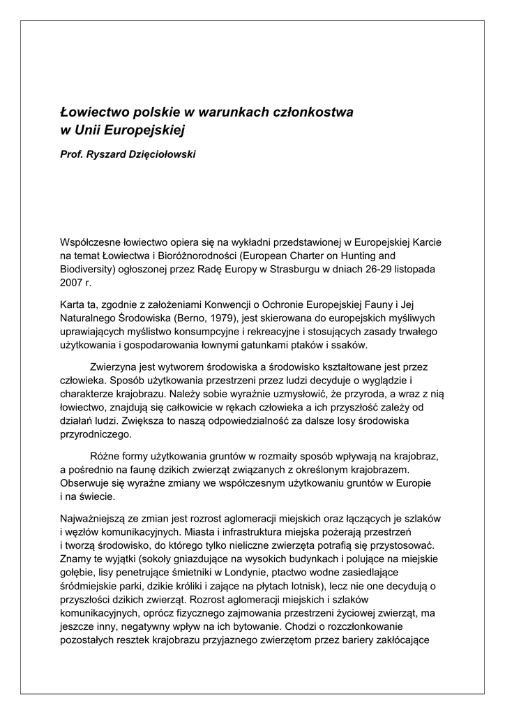 Łowiectwo polskie w warunkach członkostwa w Unii Europejskiej Prof. Ryszard Dzięciołowski Współczesne łowiectwo opiera się na wykładni przedstawionej w Europejskiej Karcie na temat Łowiectwa i Bioróżnorodności (European Charter on Hunting and Biodiversity) ogłoszonej przez Radę Europy w Strasburgu w dniach 26-29 listopada 2007 r. Karta ta, zgodnie z założeniami Konwencji o Ochronie Europejskiej Fauny i Jej Naturalnego Środowiska (Berno, 1979), jest skierowana do europejskich myśliwych uprawiających myślistwo konsumpcyjne i rekreacyjne i stosujących zasady trwałego użytkowania i gospodarowania łownymi gatunkami ptaków i ssaków. Zwierzyna jest wytworem środowiska a środowisko kształtowane jest przez człowieka. Sposób użytkowania przestrzeni przez ludzi decyduje o wyglądzie i charakterze krajobrazu. Należy sobie wyraźnie uzmysłowić, że przyroda, a wraz z nią łowiectwo, znajdują się całkowicie w rękach człowieka a ich przyszłość zależy od działań ludzi. Zwiększa to naszą odpowiedzialność za dalsze losy środowiska przyrodniczego. Różne formy użytkowania gruntów w rozmaity sposób wpływają na krajobraz, a pośrednio na faunę dzikich zwierząt związanych z określonym krajobrazem. Obserwuje się wyraźne zmiany we współczesnym użytkowaniu gruntów w Europie i na świecie. Najważniejszą ze zmian jest rozrost aglomeracji miejskich oraz łączących je szlaków i węzłów komunikacyjnych. Miasta i infrastruktura miejska pożerają przestrzeń i tworzą środowisko, do którego tylko nieliczne zwierzęta potrafią się przystosować. Znamy te wyjątki (sokoły gniazdujące na wysokich budynkach i polujące na miejskie gołębie, lisy penetrujące śmietniki w Londynie, ptactwo wodne zasiedlające śródmiejskie parki, dzikie króliki i zające na płytach lotnisk), lecz nie one decydują o przyszłości dzikich zwierząt. Rozrost aglomeracji miejskich i szlaków komunikacyjnych, oprócz fizycznego zajmowania przestrzeni życiowej zwierząt, ma jeszcze inny, negatywny wpływ na ich bytowanie. Chodzi o rozczłonkowanie pozostałych resztek krajobrazu przyjaznego zwierzętom przez bariery zakłócające lub uniemożliwiające ich przemieszczenia. Te fragmenty środowiska utrzymują szczątkowe, izolowane populacje zwierząt, narażone na niebezpieczeństwo wyginięcia ze względu na swą małą liczebność i brak możliwości dopływu osobników z innych populacji. Jest to poważne zagrożenie. Przeciwdziałać mu można tworząc korytarze ekologiczne łączące poszczególne „wyspy” środowiskowe lub organizując kosztowne przesiedlenia wzmacniające wymierające populacje. Obszary aglomeracji i szlaków transportowych rosną równolegle do wyludniania się terenów peryferyjnych i zwiększania się udziału ludności miejskiej w społeczeństwie. Rozrost powierzchniowy miast następuje również z powodu ucieczki mieszkańców z centrów i przenoszenia się do osiedli satelitarnych otaczających duże aglomeracje. Kolejnym źródłem niekorzystnych zmian w środowisku dzikich zwierząt jest intensyfikacja gospodarki rolnej. Stwarza ona pustynię ekologiczną, w której zwierzyna nie może bytować. Pozostawianie nietraktowanych pestycydami obrzeży upraw, ugorowanie 10% powierzchni gospodarstw i podobne zabiegi wprowadzane w krajach Unii Europejskiej to tylko półśrodki przedłużające agonię mieszkańców łowisk polnych. Jedynie w leśnictwie można się dopatrzyć korzystnych dla zwierzyny zmian środowiskowych. Gospodarstwo zrębowe stwarza korzystne środowisko dla zwierząt związanych z wczesnymi stadiami sukcesji roślinności leśnej. Należy do nich większość roślinożerców. Zasób ich pokarmu (igliwie, kora i pędy drzew) zostały przeniesione ze strefy niedostępnej (korony drzew) w strefę ich żerowania (uprawy i młodniki). Spowodowało to eksplozję liczebności jeleniowatych. Ta nowa sytuacja zrodziła wiele konfliktów związku z nasilaniem się szkód wyrządzanych przez jeleniowate w gospodarstwie leśnym i rolnym. Obecnie rodzi się nowy kierunek leśnictwa ekologicznego charakteryzujący się odejściem od lub poważnym ograniczeniem rębni zupełnej. Jego skutki dadzą się odczuć dopiero za kilkadziesiąt lat. Kierunek ten, nazywany „leśnictwem ekosystemowym”, oznacza częściowy powrót do lasu naturalnego. Jest to zła wiadomość dla jeleniowatych. Ich zagęszczenie spadnie. Wzrosnąć natomiast powinno pogłowie innych gatunków zwierząt związanych ze środowiskiem lasu pierwotnego, jak kuraki leśne i kuny. Zmiany te jednak następować będą powoli i stopniowo. 1. Sytuacja prawna Wraz z przystąpieniem Polski do Unii Europejskiej w 2004 r. łowiectwo nasze znalazło się w nowej sytuacji prawnej. Przede wszystkim zaczęły obowiązywać dyrektywy unijne. Chodzi tu o: Dyrektywę Ptasią (1979), Siedliskową (1992), dyrektywę o broni oraz dyrektywę o dziczyźnie. Są to dyrektywy bezpośrednio dotyczące łowiectwa. Dyrektywa Ptasia ustanowiła tereny specjalnej ochrony (SPA) dla zagrożonych gatunków ptaków. Wskazała na znaczenie terenów podmokłych dla ptactwa wędrownego. Zabroniła polowań na ptactwo podejmujące wiosenną migrację do miejsc gniazdowania. Dyrektywa Siedliskowa ustaliła wspólne ramy dla ochrony zagrożonych gatunków i siedlisk w Unii Europejskiej. Zobowiązała państwa członkowskie do wyznaczenia i prowadzenia specjalnych terenów ochrony (SAC). Bardzo ważnym aktem prawnym jest także Konwencja o Różnorodności Biologicznej ratyfikowana przez Unię Europejską w 1993 r. W 5 lat później unia opublikowała swą strategię ochrony bioróżnorodności oraz jej trwałego wykorzystywania. Strategia ta jest realizowana od 2001 r. i zawiera wiele odniesień do łowiectwa. W 2001 r. prezydenci państw członkowskich przyjęli w Gothenburgu (Szwecja) Strategię Trwałego Rozwoju. Wyznaczyła ona cel, jakim jest zatrzymanie spadku bioróżnorodności w 