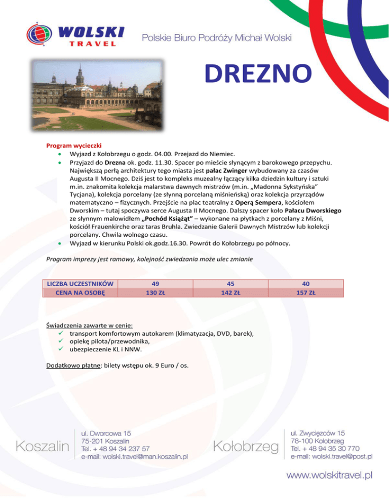 DREZNO Program wycieczki Wyjazd z Kołobrzegu o godz. 04.00. Przejazd do Niemiec. Przyjazd do Drezna ok. godz. 11.30. Spacer po mieście słynącym z barokowego przepychu. Największą perłą architektury tego miasta jest pałac Zwinger wybudowany za czasów Augusta II Mocnego. Dziś jest to kompleks muzealny łączący kilka dziedzin kultury i sztuki m.in. znakomita kolekcja malarstwa dawnych mistrzów (m.in. „Madonna Sykstyńska” Tycjana), kolekcja porcelany (ze słynną porcelaną miśnieńską) oraz kolekcja przyrządów matematyczno – fizycznych. Przejście na plac teatralny z Operą Sempera, kościołem Dworskim – tutaj spoczywa serce Augusta II Mocnego. Dalszy spacer koło Pałacu Dworskiego ze słynnym malowidłem „Pochód Książąt” – wykonane na płytkach z porcelany z Miśni, kościół Frauenkirche oraz taras Bruhla. Zwiedzanie Galerii Dawnych Mistrzów lub kolekcji porcelany. Chwila wolnego czasu. Wyjazd w kierunku Polski ok.godz.16.30. Powrót do Kołobrzegu po północy. Program imprezy jest ramowy, kolejność zwiedzania może ulec zmianie LICZBA UCZESTNIKÓW CENA NA OSOBĘ 49 130 ZŁ 45 142 ZŁ Świadczenia zawarte w cenie: transport komfortowym autokarem (klimatyzacja, DVD, barek), opiekę pilota/przewodnika, ubezpieczenie KL i NNW. Dodatkowo płatne: bilety wstępu ok. 9 Euro / os. 40 157 ZŁ