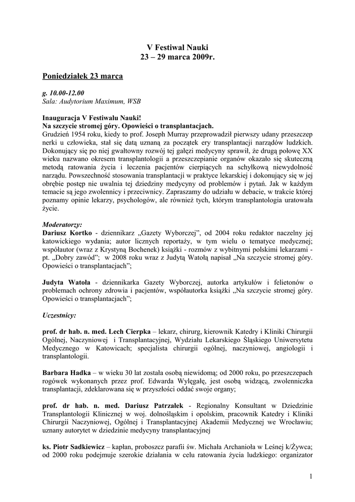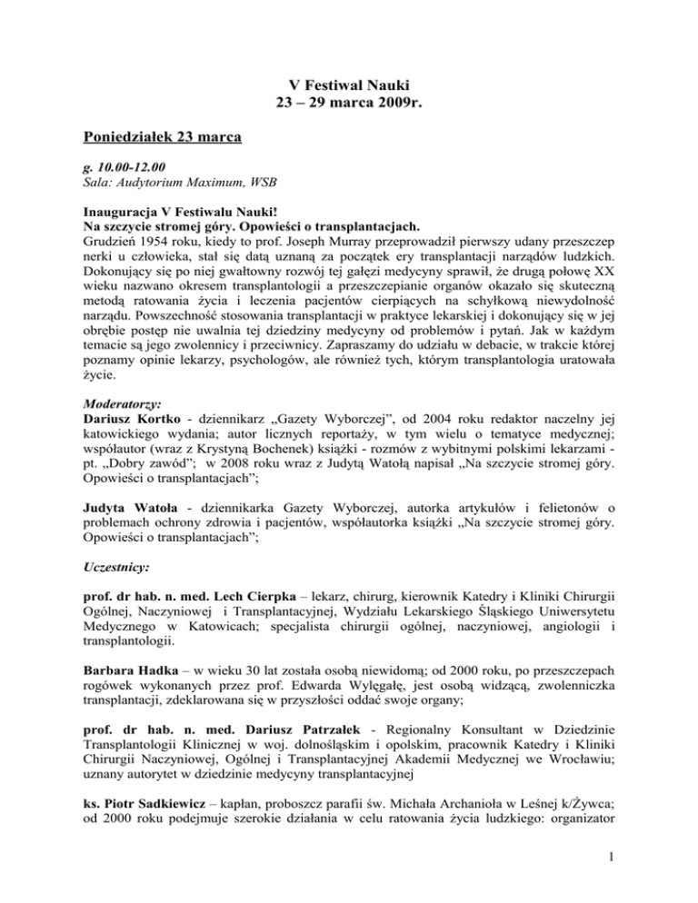 V Festiwal Nauki 23 – 29 marca 2009r. Poniedziałek 23 marca g. 10.00-12.00 Sala: Audytorium Maximum, WSB Inauguracja V Festiwalu Nauki! Na szczycie stromej góry. Opowieści o transplantacjach. Grudzień 1954 roku, kiedy to prof. Joseph Murray przeprowadził pierwszy udany przeszczep nerki u człowieka, stał się datą uznaną za początek ery transplantacji narządów ludzkich. Dokonujący się po niej gwałtowny rozwój tej gałęzi medycyny sprawił, że drugą połowę XX wieku nazwano okresem transplantologii a przeszczepianie organów okazało się skuteczną metodą ratowania życia i leczenia pacjentów cierpiących na schyłkową niewydolność narządu. Powszechność stosowania transplantacji w praktyce lekarskiej i dokonujący się w jej obrębie postęp nie uwalnia tej dziedziny medycyny od problemów i pytań. Jak w każdym temacie są jego zwolennicy i przeciwnicy. Zapraszamy do udziału w debacie, w trakcie której poznamy opinie lekarzy, psychologów, ale również tych, którym transplantologia uratowała życie. Moderatorzy: Dariusz Kortko - dziennikarz „Gazety Wyborczej”, od 2004 roku redaktor naczelny jej katowickiego wydania; autor licznych reportaży, w tym wielu o tematyce medycznej; współautor (wraz z Krystyną Bochenek) książki - rozmów z wybitnymi polskimi lekarzami pt. „Dobry zawód”; w 2008 roku wraz z Judytą Watołą napisał „Na szczycie stromej góry. Opowieści o transplantacjach”; Judyta Watoła - dziennikarka Gazety Wyborczej, autorka artykułów i felietonów o problemach ochrony zdrowia i pacjentów, współautorka książki „Na szczycie stromej góry. Opowieści o transplantacjach”; Uczestnicy: prof. dr hab. n. med. Lech Cierpka – lekarz, chirurg, kierownik Katedry i Kliniki Chirurgii Ogólnej, Naczyniowej i Transplantacyjnej, Wydziału Lekarskiego Śląskiego Uniwersytetu Medycznego w Katowicach; specjalista chirurgii ogólnej, naczyniowej, angiologii i transplantologii. Barbara Hadka – w wieku 30 lat została osobą niewidomą; od 2000 roku, po przeszczepach rogówek wykonanych przez prof. Edwarda Wylęgałę, jest osobą widzącą, zwolenniczka transplantacji, zdeklarowana się w przyszłości oddać swoje organy; prof. dr hab. n. med. Dariusz Patrzałek - Regionalny Konsultant w Dziedzinie Transplantologii Klinicznej w woj. dolnośląskim i opolskim, pracownik Katedry i Kliniki Chirurgii Naczyniowej, Ogólnej i Transplantacyjnej Akademii Medycznej we Wrocławiu; uznany autorytet w dziedzinie medycyny transplantacyjnej ks. Piotr Sadkiewicz – kapłan, proboszcz parafii św. Michała Archanioła w Leśnej k/Żywca; od 2000 roku podejmuje szerokie działania w celu ratowania życia ludzkiego: organizator 1 jednych z największych w Polsce akcji krwiodawstwa, parafialnego banku szpiku kostnego (331 potencjalnych dawców, w tym 3 oddało szpik), propagator idei transplantacji, szkoleń parafian w ratownictwie medycznym; laureat wielu nagród i wyróżnień: tytuł „Proboszcz Roku 2005”, Oskar Dziecięcych Serc, Miody 2005, Człowiek Dużego Formatu 2006, Nagroda im. Brajana Chlebowskiego, Miłosierny Samarytanin 2007; prof. zw. dr hab. Marek S. Szczepański – socjolog; wieloletni Dyrektor Instytutu Socjologii Uniwersytetu Śląskiego (1993-2008), współzałożyciel i Rektor Wyższej Szkoły Zarządzania i Nauk Społecznych w Tychach (2001-2007); specjalista w zakresie socjologii miasta, regionu, edukacji i zmiany społecznej; autor 300 publikacji z tego zakresu, w tym tekstów wydanych w USA, Kanadzie, Francji, Niemczech, Wielkiej Brytanii, Czechach; dr Jarosław Wilk – lekarz. adiunkt w Śląskim Uniwersytecie Medycznym, koordynator ds. transplantacji w Wojewódzkim Szpitalu Specjalistycznym nr 5 im. Św. Barbary w Sosnowcu, wiceprezes Stowarzyszenia Donum Vitae, mającego na celu promowanie idei transplantacji, dawstwa narządów i tkanek; prof. dr hab. n. med. Edward Wylęgała - Ordynator Oddziału Okulistyki Szpitala Kolejowego w Katowicach oraz Kierownik Zakładu Pielęgniarstwa i Społecznych Problemów Medycznych Śląskiego Uniwersytetu Medycznego w Katowicach; mikrochirurg okulistyczny ze specjalizacją w zakresie chorób oczu; autor i współautor 98 prac pełnotekstowych oraz ponad 200 komunikatów zjazdowych; publikował w takich czasopismach jak Ophthalmology, Journal of Cataract and Refractive Surgery, Ophthalmic Surgery Lasers and Imaging, The Eye, European Journal of Ophthalmology; członek licznych towarzystw naukowych między innymi: Polskie Towarzystwo Okulistyczne, American Academy of Ophthalmology, Societa Ophthalmologica Italiana; przewodniczący Sekcji Rogówkowej Polskiego Towarzystwa Okulistycznego; samodzielnie wykonał ponad 1500 przeszczepów rogówek; wprowadził w Polsce techniki przeszczepiania warstwowego i komórek macierzystych nabłonka rogówki; g. 13.00 – 14.30 Sala: Audytorium Maximum, WSB Wędrujący świat Kto powiedział, że ekonomia musi być nudna? Z pewnością nie profesor Grzegorz W. Kołodko, jeden z największych światowych autorytetów w tej dziedzinie, a zarazem doświadczony polityk, zapalony podróżnik i znakomity popularyzator wiedzy. Przemiany w globalnej gospodarce dotyczą nas wszystkich, również dlatego, że wiążą się z przemianami w kulturze, rozwojem nauki, wahaniami sytuacji politycznej. By jednak zrozumieć obecną kondycję ludzkości i stan gospodarki światowej oraz długofalowe procesy kształtujące przyszłość, trzeba sięgnąć poza granice własnej codzienności i rodzinnego kraju. Poza ograniczenia jednej dziedziny naukowej i jednego paradygmatu. A nawet poza teraźniejszość, sięgając daleko w przeszłość – oraz w dekady i epoki, które dopiero nadejdą. prof. dr hab. Grzegorz Kołodko – jeden z głównych architektów polskich reform gospodarczych; autor sukcesów w rozwoju gospodarki Polski - jest uznanym w świecie autorytetem w zakresie ekonomii rozwoju i polityki gospodarczej; parając się aktywną polityką gospo
