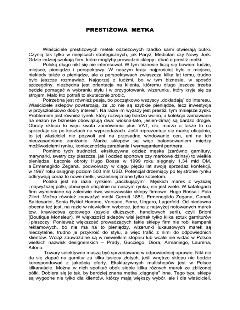 PRESTIŻOWA METKA Właściciele prestiżowych metek odzieżowych rzadko sami otwierają butiki. Czynią tak tylko w miejscach strategicznych, jak Paryż, Mediolan czy Nowy Jork. Gdzie indziej szukają firm, które mogłyby prowadzić sklepy i dbać o prestiż metki. Polską długo nikt się nie interesował. W tym biznesie liczą się bowiem ludzie, miejsce, pieniądze i perspektywy. W naszym kraju najprościej było o miejsce, niekiedy także o pieniądze, ale o perspektywach zwłaszcza kilka lat temu, trudno było jeszcze rozmawiać. Najgorzej z ludźmi, bo w tym biznesie, w sposób szczególny, niezbędna jest orientacja na klienta, któremu długo jeszcze trzeba będzie pomagać w wybraniu stylu i w przygotowaniu wizerunku, który kryje się za strojem. Mało kto potrafi to skutecznie zrobić. Potrzebna jest również pasja, bo początkowo wszyscy „dokładają” do interesu. Właściciele sklepów powtarzają, że „to nie są szybkie pieniądze, lecz inwestycja w przyszłościowo dobry interes”. Na razie im wyższy jest prestiż, tym mniejsze zyski. Problemem jest również rynek, który rozwija się bardzo wolno, a kolekcje zamawiane na sezon (w biznesie obowiązują dwa: wiosna-lato, jesień-zima) są bardzo drogie. Obroty sklepu to więc kwota zamówienia plus VAT, cło, marża a także to co sprzedaje się po kosztach na wyprzedażach. Jeśli reprezentuje się markę oficjalnie, to jej właściciel nie pozwoli ani na przesadne windowanie cen, ani na ich nieuzasadnione zaniżanie. Marże sklepów są więc balansowaniem między możliwościami rynku, koniecznością zarabiania i wymaganiami partnera. Pomimo tych trudności, ekskluzywna odzież męska (zarówno garnitury, marynarki, swetry czy płaszcze, jak i odzież sportowa czy markowe dżinsy) to wielkie pieniądze. Łącznie obroty Hugo Bossa w 1999 roku sięgnęły 1,34 mld DM, a Ermenegildo Zegana, podwoiwszy w ciągu pięciu lat swoją sprzedaż konfekcji, w 1997 roku osiągnął poziom 500 mln USD. Potencjał drzemiący po tej stronie rynku odkrywają coraz to nowe metki, wcześniej znane tylko kobietom. Polska jest na razie rynkiem „raczkującym”. Męskich marek z wyższej i najwyższej półki, obecnych oficjalnie na naszym rynku, nie jest wiele. W katalogach firm wymieniane są zaledwie dwa warszawskie sklepy firmowe: Hugo Bossa i Pala Zileri. Można również zauważyć metki Cerruti 1881, Ermenegildo Zegana, Canali, Baldesarini, Sonia Rykiel Homme, Versace, Ferre, Ungaro, Lagerfeld. Od niedawna obecna też jest, na razie w niewielkim wyborze, jedna z najwyżej notowanych marek tzw. krawiectwa gotowego (szycie dłuższych, handlowych serii), czyli Brioni (Boutique Monsieur). W większości sklepów wisi jednak tylko kilka sztuk garniturów i płaszczy. Ponieważ większość prowadzących takie sklepy firm nie robi kampanii reklamowych, bo nie ma na to pieniędzy, wizerunki luksusowych marek są nieczytelne, trudno je przykroić do stylu, a więc trafić z nimi do odpowiednich klientów. Wciąż zauważalne są w niewielkim stopniu lub wcale nie widać w Polsce wielkich nazwisk designerskich – Prady, Gucciego, Diora, Armaniego, Laurena, Kitona. Towary selektywne muszą być sprzedawane w odpowiedniej oprawie. Nikt nie da się złapać na garnitur za kilka tysięcy złotych, jeśli wnętrze sklepu nie będzie korespondować z jakością oferty. Ekskluzywnych multishopów jest w Polsce kilkanaście. Można w nich spotkać obok siebie kilka różnych marek ze zbliżonej półki. Dobiera się je tak, by bardziej znana metka „ciągnęła” inne. Tego typu sklepy są wygodne nie tylko dla klientów, którzy mają większy wybór, ale i dla właścicieli. Wielu kreatorów nie prowadzi samodzielnie ani działalności produkcyjnej, ani handlowej, bądź robi to na niewielką skalę. Zleca szycie wedle własnych projektów podwykonawcom, a dystrybucję – niezależnym spółkom. Niektóre z nich podpisują umowy z kilkoma markami, więc wchodząc w interes z taką firmą, zyskuje się od razu dostęp do kilku mniej lub bardziej ekskluzywnych metek. Najtrudniejszym zadaniem dla właścicieli sklepów jest przewidzenie tego, co się sprzeda na rynku. Konieczne jest wyczucie estetyczne i kiperski nos, jak twierdzą zainteresowani. Generalnie w Polsce można znaleźć chętnych tylko na część modeli z przygotowanych kolekcji, niestety trzeba wiedzieć których, a wszystko należy przewidzieć na pół roku wcześniej, bo wtedy się zamawia. Podstawowa reguła mówi, że trzeba śledzić to, jak w Polsce ubierają się ludzie. Wybór kolekcji, w sumie kilkaset sztuk, determinuje jedna z grup docelowych – biznesmeni. Później trzeba dotrzeć do odbiorcy. Nieskuteczne w tym przypadku stają się ogromne kampanie reklamowe, niezbędne są działania subtelniejsze – mailingi, telefony do stałych klientów, zawiadamianie o cichych wyprzedażach, wysyłanie katalogów. Poza tym firmy sponsorują np. operę oraz inne wydarzenia towarzyskie, dzięki którym mogą podkreślać, że ich klienci należą do wąskiej grupy ludzi sukcesu. Są też karty uprawniające do zniżek. Wiadomo bowiem, że zadowoleni klienci przyciągną następnych. Sklepów z markami z najwyższej półki nie może być wiele, gdyż są to ubrania skierowane do takich klientów, którzy w jakiś sposób chcą być niepowtarzalni i w niepowtarzalny sposób traktowani, a coś co można kupić wszędzie, nie cieszy. PYTANIA : 1. Jaki rodzaj dystrybucji przedstawia powyższy opis? – uzasadnij odpowiedź. 2. Jakie można wskazać zalety, a jakie wady tej formy dystrybucji? 3. Jakie inne działania mogą podjąć sklepy oferujące towary markowe, aby zachęcić klientów do ich zakupu?