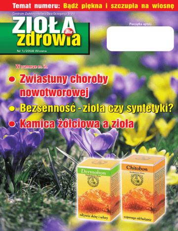 Bądź piękna i szczupła na wiosnę „ Nerki lubią ciepło“ „Nerki lubią ciepło“ - to zdanie często powtarzał Ojciec Grzegorz chorym, którzy do niego przyjeżdżali. Dotyczyło to zwłaszcza Pań, które dużo łatwiej ze względów anatomicznych zapadają na infekcje dróg moczowych, głównie pęcherza moczowego. Nerki lubią ciepło w sensie ubioru, ale też „lubią” rozgrzewające potrawy i napoje. Potrawy rozgrzewające to te, które zawierają dużo przypraw, takich jak papryka, imbir, cynamon, goździk, lub które ze swojej istoty są rozgrzewające np. ulubiona potrawa O. Grzegorza kasza gryczana. Mądrość ludowa mówi, że na nerki dobre jest piwo. Jest to zarówno prawda i nieprawda. Piwo z jednej strony prowokuje nerki do pracy, a nic tak dobrze nie czyści nerek i dróg moczowych z bakterii i piasku, jak przepływający przez nie mocz. Z drugiej strony piwo bardzo wychładza organizm (stąd też jego dobroczynne skutki w upalne lato). Aby piwo nie wychładzało naszego organizmu należy je spożywać w specjalny sposób. O. Grzegorz, który całe życie chorował na nerki pił piwo grzane, wymieszane pół na pół z wodą np. Jana i z miodem oraz goździkami, imbirem lub cynamonem. Dodanie silnie rozgrzewających przypraw do piwa sprawia, że jego natura wychładzająca zmienia się w naturę neutralną, a nawet nieco ogrzewającą. Poza moczopędnie działającym piwem O. Grzegorz zalecał swoim pacjentom zawsze zioła nerkowe Nefrobonisan lub krople moczopędne odtruwające Nefrobonisol. Oba te preparaty stymulują nerki do wydzielania moczu, działają także odtruwająco, przeciwbakteryjnie i przeciwzapalnie. Aby eliminować skutecznie bakterie z dróg moczowych, należy do w/w preparatów dodać Urobon, który zawiera ekstrakty z ziela pokrzywy, skrzypu i owoców żurawiny. Żurawina utrudnia bakteriom przyleganie do ścian dróg moczowych, a przez to ułatwia ich wydalanie z moczem – działa jak płyn do mycia naczyń na tłuszcz przylepiony do talerza. Wypadanie włosów Dermobon Zmarszczki Likobon Trądzik Boniderm + Dermobon krem Przy zmianach ropnych Apibon krem Opryszczka, zajady Apibon krem Przy zmianach nawracających dodatkowo Immunobon + Apibon doustnie aby wzmocnić odporność. Wyprysk alergiczny Dorośli: Boniderm + Dermobon krem – zewnętrznie + Gastrobonisol doustnie. Dzieci: Bobonisan doustnie i Boniderm zewnętrznie. Łuszczyca Zewnętrznie: Boniderm + Dermobon krem Doustnie: Gastrobonisol – stymulacja pracy wątroby Nefrobonisol – stymulacja pracy nerek Nadwaga Chitobon Adipobon mono Cellulit Adipobon mono (CLA – sprzężony kwas linolowy) Odklejanie bakterii od ścian dróg moczowych 2 Wypłukiwanie bakterii z dróg moczowych Pajączki naczyniowe lub żylaki Venobon krem + Venobon doustnie Grzybica Apibon krem – zewnętrznie , Immunobon + Apibon – doustnie. 3 Czy zioła to eliksir młodości? Jak trwale stracić zbędne kilogramy? W postawionym powyżej pytaniu nie bez kozery użyto słowa „trwale“. Zrobiono to dlatego, że trwały spadek masy ciała jest niezwykle rzadko spotykany u osób stosujących diety (czasami drakońskie) ograniczające ilość spożywanych kalorii. Redukują one wagę czasem o kilkanaście kilogramów. Jednakże po zaprzestaniu diety powrót do wagi wyjściowej jest bardzo szybki, a często po kilku miesiącach stwierdzamy, że ważymy więcej, niż przed kuracją, a co gorsza mamy coraz więcej tkanki tłuszczowej, a coraz mniej mięśni. wolno podnoszące poziom glukozy, natomiast wysoki – te które podnoszą jej poziom szybko. Szybki wzrost glukozy we krwi powoduje wrzut do krwi insuliny (hormon obniżający poziom glukozy we krwi). Taki wrzut insuliny skutkuje radykalnym spadkiem poziomu glukozy - hypoglikemią, która z kolei powoduje „wilczy głód” na słodycze, ponieważ właśnie one najszybciej podnoszą poziom glukozy we krwi – jest to mechanizm błędnego koła. Aby nie napędzić błędnego koła, należy unikać produktów z wysokim poziomem IG, Co więc należy zrobić? Zabrać się do tego z głową, a ściślej: skorzystać z osiągnięć nauki. Naukowcy zaszeregowali produkty żywnościowe według współczynnika określającego jak ich spożycie wpływa na szybkość wzrostu stężenia glukozy w surowicy krwi. Nazwano ten współczynnik Indeksem Glikemicznym (IG). Niski indeks mają produkty takich jak: biały chleb IG (97), chipsy (90), Fanta (68), marchewka gotowana (85), ryż biały (70), puree ziemniaczane (85), banan (70), frytki (95), a spożywać produkty o niskim IG: gorzka czekolada (22), czereśnie (22), fasola (33), grejpfrut (26), jogurt bez cukru (15), marchewka świeża (30), morele świeże (15), orzeszki ziemne (13), soja (14). Pewnym rozwiązaniem jest zażywanie przed jedzeniem substancji zwalniających szybkość wchłaniania pokarmów. Taką substancją jest Chitosan, który w żołądku tworzy żel wiążący tłuszcz z pokarmu a ponadto zwalnia wchłanianie cukrów w dalszych odcinkach przewodu pokarmowego. W Centrum Ziołolecznictwa Ojca Grzegorza stosujemy Chitobon który zawiera w swym składzie również bon, oprócz Chitosanu, Chrom organiczny. Zalecamy także stosowanie Adipobonu mono który przyspiesza „spalanie“ tłuszczu, mono, zwłaszcza u osób aktywnych fizycznie. Usuń cellulit Zredukuj wagę 4 Z problemem osiągnięcia długowieczności ludzkość zmaga się od początku istnienia. Od czego zależy długowieczność? Przede wszystkim od genów i jakości życia. Na geny mamy na razie niewielki wpływ i zbyt mało na ten temat wiemy. Jeszcze przed 10 laty pisaliśmy, że na geny nie mamy żadnego wpływu. Obecnie takie stwierdzenie byłoby nieprawdą. Z doniesień naukowych ostatnich lat wynika, że żywność, ksenobiotyki („trucizny” z żywności i środowiska), zioła i niektóre leki mogą pobudzać, lub hamować aktywność genów. Niestety, nie bardzo udaje się nam sterować tymi wpływami. Co zatem zrobić, aby
