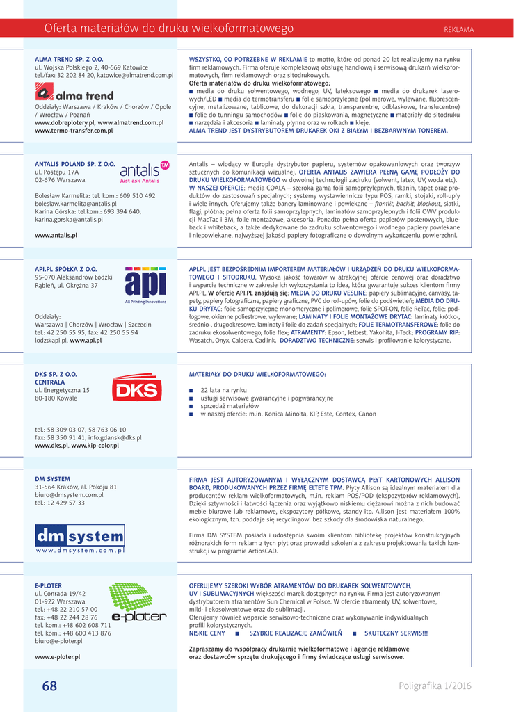 Oferta materiałów do druku wielkoformatowego alma trend sp. z o.o. ul. Wojska Polskiego 2, 40-669 Katowice tel./fax: 32 202 84 20, [email protected] Oddziały: Warszawa / Kraków / Chorzów / Opole / Wrocław / Poznań www.dobreplotery.pl, www.almatrend.com.pl www.termo-transfer.com.pl antalis poland sp. z o.o. ul. Postępu 17A 02-676 Warszawa Bolesław Karmelita: tel. kom.: 609 510 492 [email protected] Karina Górska: tel.kom.: 693 394 640, [email protected] www.antalis.pl api.pl spółka z o.o. 95-070 Aleksandrów Łódzki Rąbień, ul. Okrężna 37 Oddziały: Warszawa | Chorzów | Wrocław | Szczecin tel.: 42 250 55 95, fax: 42 250 55 94 [email protected], www.api.pl dks sp. z o.o. centrala ul. Energetyczna 15 80-180 Kowale REKLAMA WSzYSTKO, CO POTRzEBNE W REKLAMIE to motto, które od ponad 20 lat realizujemy na rynku firm reklamowych. Firma oferuje kompleksową obsługę handlową i serwisową drukarń wielkoformatowych, firm reklamowych oraz sitodrukowych. Oferta materiałów do druku wielkoformatowego: media do druku solwentowego, wodnego, UV, lateksowego media do drukarek laserowych/LED media do termotransferu folie samoprzylepne (polimerowe, wylewane, fluorescencyjne, metalizowane, tablicowe, do dekoracji szkła, transparentne, odblaskowe, translucentne) folie do tunningu samochodów folie do piaskowania, magnetyczne materiały do sitodruku narzędzia i akcesoria laminaty płynne oraz w rolkach kleje. ALMA TREND JEST DYSTRYBUTOREM DRUKAREK OKI z BIAŁYM I BEzBARWNYM TONEREM. Antalis – wiodący w Europie dystrybutor papieru, systemów opakowaniowych oraz tworzyw sztucznych do komunikacji wizualnej. OFERTA ANTALIS zAWIERA PEŁNĄ GAMę PODŁOżY DO DRUKU WIELKOFORMATOWEGO w dowolnej technologii zadruku (solwent, latex, UV, woda etc). W NASzEJ OFERCIE: media COALA – szeroka gama folii samoprzylepnych, tkanin, tapet oraz produktów do zastosowań specjalnych; systemy wystawiennicze typu POS, ramki, stojaki, roll-up’y i wiele innych. Oferujemy także banery laminowane i powlekane – frontlit, backlit, blockout, siatki, flagi, płótna; pełna oferta folii samoprzylepnych, laminatów samoprzylepnych i folii OWV produkcji MacTac i 3M, folie montażowe, akcesoria. Ponadto pełna oferta papierów posterowych, blueback i whiteback, a także dedykowane do zadruku solwentowego i wodnego papiery powlekane i niepowlekane, najwyższej jakości papiery fotograficzne o dowolnym wykończeniu powierzchni. API.PL JEST BEzPOŚREDNIM IMPORTEREM MATERIAŁÓW I URzĄDzEŃ DO DRUKU WIELKOFORMATOWEGO I SITODRUKU. Wysoka jakość towarów w atrakcyjnej ofercie cenowej oraz doradztwo i wsparcie techniczne w zakresie ich wykorzystania to idea, która gwarantuje sukces klientom firmy API.PL. W ofercie API.PL znajdują się: MEDIA DO DRUKU VESLINE: papiery sublimacyjne, canvasy, tapety, papiery fotograficzne, papiery graficzne, PVC do roll-upów, folie do podświetleń; MEDIA DO DRUKU DRYTAC: folie samoprzylepne monomeryczne i polimerowe, folie SPOT-ON, folie ReTac, folie: podłogowe, okienne poliestrowe, wylewane; LAMINATY I FOLIE MONTAżOWE DRYTAC: laminaty krótko-, średnio-, długookresowe, laminaty i folie do zadań specjalnych; FOLIE TERMOTRANSFEROWE: folie do zadruku ekosolwentowego, folie flex; ATRAMENTY: Epson, Jetbest, Yakohita, J-Teck; PROGRAMY RIP: Wasatch, Onyx, Caldera, Cadlink. DORADzTWO TECHNICzNE: serwis i profilowanie kolorystyczne. MATERIAŁY DO DRUKU WIELKOFORMATOWEGO: 22 lata na rynku usługi serwisowe gwarancyjne i pogwarancyjne sprzedaż materiałów w naszej ofercie: m.in. Konica Minolta, KIP, Este, Contex, Canon tel.: 58 309 03 07, 58 763 06 10 fax: 58 350 91 41, [email protected] www.dks.pl, www.kip-color.pl dm system 31-564 Kraków, al. Pokoju 81 [email protected] tel.: 12 429 57 33 FIRMA JEST AUTORYzOWANYM I WYŁĄCzNYM DOSTAWCĄ PŁYT KARTONOWYCH ALLISON BOARD, PRODUKOWANYCH PRzEz FIRMę ELTETE TPM. Płyty Allison są idealnym materiałem dla producentów reklam wielkoformatowych, m.in. reklam POS/POD (ekspozytorów reklamowych). Dzięki sztywności i łatwości łączenia oraz wyjątkowo niskiemu ciężarowi można z nich budować meble biurowe lub reklamowe, ekspozytory półkowe, standy itp. Allison jest materiałem 100% ekologicznym, tzn. poddaje się recyclingowi bez szkody dla środowiska naturalnego. Firma DM SYSTEM posiada i udostępnia swoim klientom bibliotekę projektów konstrukcyjnych różnorakich form reklam z tych płyt oraz prowadzi szkolenia z zakresu projektowania takich konstrukcji w programie ArtiosCAD. e-ploter ul. Conrada 19/42 01-922 Warszawa tel.: +48 22 210 57 00 fax: +48 22 244 28 76 tel. kom.: +48 602 608 711 tel. kom.: +48 600 413 876 [email protected] www.e-ploter.pl 68 OFERUJEMY SzEROKI WYBÓR ATRAMENTÓW DO DRUKAREK SOLWENTOWYCH, UV I SUBLIMACYJNYCH większości marek dostępnych na rynku. Firma jest autoryzowanym dystrybutorem atramentów Sun Chemical w Polsce. W ofercie atramenty UV, solwentowe, mild- i ekosolwentowe oraz do sublimacji. Oferujemy również wsparcie serwisowo-techniczne oraz wykonywanie indywidualnych profili kolorystycznych. SzYBKIE REALIzACJE zAMÓWIEŃ SKUTECzNY SERWIS!!! NISKIE CENY zapraszamy do współpracy drukarnie wielkoformatowe i agencje reklamowe oraz dostawców sprzętu drukującego i firmy świadczące usługi serwisowe. Poligrafika 1/2016 REKLAMA Oferta materiałów do druku wielkoformatowego JESTEŚMY DYSTRYBUTOREM RENOMOWANYCH PRODUCENTÓW: ORAFOL I DGCAL – folie, laminaty i inne IDEMPAPERS, LENzING, SIHL – papiery do zadruku offsetowego i solwentowego MADREPERLA – płyty akrylowe STADUR, PROFINE – płyty PVC; ASORTYMENT FOLIE: ploterowe, solwentowe, okienne, odblaskowe, laminaty PAPIERY: blueback, whiteback, citylight, fotograficzne, tapety TKANINY BANEROWE: frontlit, backlit, blockout, siatka, canvas TWORzYWA SzTUCzNE: PVC spienione, płyty piankowe, plaster miodu, aluminiowe płyty kompozytowe SYSTEMY EKSPOzYCJI: media do kaset roll-up oraz na ścianki, wystawiennicze pop-up, kasety do roll-up