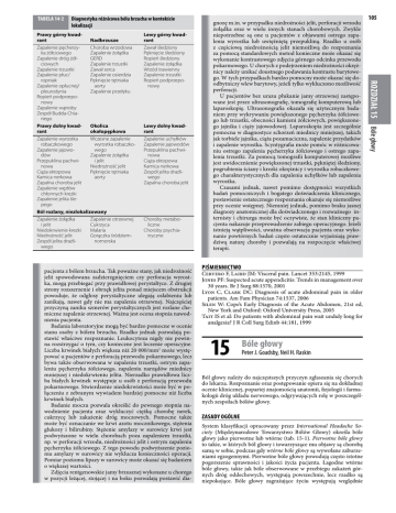 TABELA 14-2 Diagnostyka różnicowa bólu brzucha w kontekście lokalizacji Lewy górny kwadrant Zawał śledziony Pęknięcie śledziony Ropień śledziony Zapalenie żołądka Wrzód trawienny Zapalenie trzustki Ropień podprzeponowy Lewy dolny kwadrant Zapalenie uchyłków Zapalenie jajowodów Przepuklina pachwinowa Ciąża ektopowa Kamica nerkowa Zespół jelita drażliwego Zapalna choroba jelit Choroby metaboliczne Choroby psychiatryczne pacjenta z bólem brzucha. Tak poważne stany, jak niedrożność jelit spowodowana zadzierzgnięciem czy perforacja wyrostka, mogą przebiegać przy prawidłowej perystaltyce. Z drugiej strony rozszerzenie i obrzęk jelita ponad miejscem obstrukcji powoduje, że odgłosy perystaltyczne ulegają osłabieniu lub zanikają, nawet gdy nie ma zapalenia otrzewnej. Najczęściej przyczyną zaniku szmerów perystaltycznych jest rozlane chemiczne zapalenie otrzewnej. Ważna jest ocena stopnia nawodnienia pacjenta. Badania laboratoryjne mogą być bardzo pomocne w ocenie stanu osoby z bólem brzucha. Rzadko jednak pozwalają postawić właściwe rozpoznanie. Leukocytoza nigdy nie powinna rozstrzygać o tym, czy konieczne jest leczenie operacyjne. Liczba krwinek białych większa niż 20 000/mm3 może występować u pacjentów z perforacją przewodu pokarmowego, lecz bywa także obserwowana w zapaleniu trzustki, ostrym zapaleniu pęcherzyka żółciowego, zapaleniu narządów miednicy mniejszej i niedokrwieniu jelita. Nierzadko prawidłowa liczba białych krwinek występuje u osób z perforacją przewodu pokarmowego. Stwierdzenie niedokrwistości może być w połączeniu z zebranym wywiadem bardziej pomocne niż liczba krwinek białych. Badanie moczu pozwala określić do pewnego stopnia nawodnienie pacjenta oraz wykluczyć ciężką chorobę nerek, cukrzycę lub zakażenie dróg moczowych. Pomocne także może być oznaczanie we krwi azotu mocznikowego, stężenia glukozy i bilirubiny. Stężenie amylazy w surowicy krwi jest podwyższone w wielu chorobach poza zapaleniem trzustki, np. w perforacji wrzodu, niedrożności jelit i ostrym zapaleniu pęcherzyka żółciowego. Z tego powodu podwyższenie poziomu amylazy w surowicy nie wyklucza konieczności operacji. Pomiar poziomu lipazy w surowicy może okazać się badaniem o większej wartości. Zdjęcia rentgenowskie jamy brzusznej wykonane u chorego w pozycji leżącej, stojącej i na boku pozwalają postawić dia- PIŚMIENNICTWO Cervero F, Laird JM: Visceral pain. Lancet 353:2145, 1999 Jones PF: Suspected acute appendicitis: Trends in management over 30 years. Br J Surg 88:1570, 2001 Lyon C, Clark DC: Diagnosis of acute abdominal pain in older patients. Am Fam Physician 74:1537, 2006 Silen W: Cope’s Early Diagnosis of the Acute Abdomen, 21st ed, New York and Oxford: Oxford University Press, 2005 Tait IS et al: Do patients with abdominal pain wait unduly long for analgesia? J R Coll Surg Edinb 44:181, 1999 15 Bóle głowy Peter J. Goadsby, Neil H. Raskin Ból głowy należy do najczęstszych przyczyn zgłaszania się chorych do lekarza. Rozpoznanie oraz postępowanie opiera się na dokładnej ocenie klinicznej, popartej znajomością anatomii, fizjologii i farmakologii dróg układu nerwowego, odgrywających rolę w poszczególnych zespołach bólów głowy. ZASADY OGÓLNE System klasyfikacji opracowany przez International Headache Society (Międzynarodowe Towarzystwo Bólów Głowy) określa bóle głowy jako pierwotne lub wtórne (tab. 15-1). Pierwotne bóle głowy to takie, w których ból głowy i towarzyszące mu objawy są chorobą samą w sobie, podczas gdy wtórne bóle głowy są wywołane zaburzeniami egzogennymi. Pierwotne bóle głowy powodują często istotne pogorszenie sprawności i jakości życia pacjenta. Łagodne wtórne bóle głowy, takie jak bóle obserwowane w przebiegu zakażeń górnych dróg oddechowych, występują powszechnie, lecz rzadko są niepokojące. Bóle głowy zagrażające życiu występują względnie 105 ROZDZIAŁ 15 Bóle głowy Prawy górny kwadrant Nadbrzusze Choroba wrzodowa Zapalenie pęcherzyZapalenie żołądka ka żółciowego GERD Zapalenie dróg żółZapalenie trzustki ciowych Zawał serca Zapalenie trzustki Zapalenie osierdzia Zapalenie płuc/ Pęknięcie tętniaka ropniak aorty Zapalenie opłucnej/ Zapalenie przełyku pleurodynia Ropień podprzeponowy Zapalenie wątroby Zespół Budda-Chiariego Prawy dolny kwadOkolica rant okołopępkowa Wczesne zapalenie Zapalenie wyrostka wyrostka robaczkorobaczkowego wego Zapalenie jajowoZapalenie żołądka dów i jelit Przepuklina pachwiNiedrożność jelit nowa Pęknięcie tętniaka Ciąża ektopowa aorty Kamica nerkowa Zapalna choroba jelit Zapalenie węzłów chłonnych krezki Zapalenie jelita ślepego Ból rozlany, niezlokalizowany Zapalenie żołądka Zapalenie otrzewnej i jelit Cukrzyca Malaria Niedokrwienie krezki Gorączka śródziemNiedrożność jelit nomorska Zespół jelita drażliwego gnozę m.in. w przypadku niedrożności jelit, perforacji wrzodu żołądka oraz w wielu innych stanach chorobowych. Zwykle niepotrzebne są one u pacjentów z objawami ostrego zapalenia wyrostka lub uwięźniętą przepukliną. Rzadko u osób z częściową niedrożnością jelit niemożliwą do rozpoznania za pomocą standardowych metod konieczne może okazać się wykonanie kontrastowego zdjęcia górnego odcinka przewodu pokarmowego. U chorych z podejrzeniem niedrożności okrężnicy należy unikać doustnego podawania kontrastu barytowego. W tych przypadkach bardzo pomocny może okazać się doodbytniczy wlew barytowy, jeżeli tylko wykluczono możliwość perforacji. U pacjentów bez urazu płukanie jamy otrzewnej zastępowane jest przez ultrasonografię, tomografię komputerową lub laparoskopię. Ultrasonografia okazała się użytecznym badaniem przy wykrywaniu powiększonego pęcherzyka żółciowego lub trzustki, obecności kamieni żółciowych, powiększonego jajnika i ciąży jajowodowej. Laparoskopia jest 