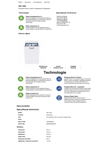 BEKO › Zmywanie › Do zabudowy › DIS 1520 DIS 1520 Zmywarka 45cm w pełni zintegrowana 5 programów Technologie Specyfikacja Techniczna › Wysokość: 82 cm › Szerokość: 45 cm › Głębokość: 55 cm › Typ: do zabudowy › Klasa energetyczna: A › Pojemność: 10 › Liczba programów: 5 Klasa energetyczna A: Klasa energetyczna A w produktach Beko to gwarancja dbałości o środowisko naturalne i oszczędność dla Twojego budżetu rodzinnego. Klasa zmywania A: Klasa zmywania A jest najlepszą klasą w swojej kategorii wg standardów europejskich. Główne zdjęcie INSTRUKCJA OBSŁUGI KARTA PRODUKTU UE POBIERZ ZDJĘCIE Technologie Klasa energetyczna A: Program Quick & Clean: Klasa zmywania A: Program Mini 30 - zmywarki: Klasa energetyczna A w produktach Beko to gwarancja dbałości o środowisko naturalne i oszczędność dla Twojego budżetu rodzinnego. Klasa zmywania A jest najlepszą klasą w swojej kategorii wg standardów europejskich. Klasa suszenia A: Dzięki nowoczesnemu systemowi suszenia zmywarki BEKO uzyskują najwyższą klasę suszenia A! Quick & Clean to unikalny program zmywarek BEKO. Jest to najszybszy, wyjątkowy program w swojej klasie A, zarówno do lekko jak i mocno zabrudzonych garnków oraz naczyń. Program ten przeznaczony jest do mycia lekko zabrudzonych naczyń oraz szkła. Mycie trwa 30 minut i odbywa się w temperaturze 35°C, oszczędzając czas i energię. System Water Safe : System Water Safe to ochrona przez wypływem wody i zalaniem pomieszczania. W razie wycieku wody, dopływ wody do zmywarki odcinany jest automatycznie. Opis produktu Specyfikacja techniczna Model: DIS 1520 Produkt: Zmywarka Typ: Do zabudowy 45 cm w pełni zintegrowana Kolor: - Stock Code: 7683388345 EAN Code: 8690842683381 Wymiary Wysokość: 82 cm Szerokość: 44,8 cm Głębokość: 54,8 cm Waga netto: 30,5 kg Wysokość bez blatu: 82 cm Głębokość z otwartymi drzwiami: 115 cm Regulacja wysokości: 10 cm Specyfikacja Pojemność (ilość kompletów): 10 Liczba programów: 5 Program Auto: Nie Temperatury zmywania: 35/50/60/70 ALLin1: Nie Połowa załadunku: Nie Funkcja Express: Nie Extra suszenie: Nie Aktywny system suszenia: Nie Wyświetlacz: Diodowy Opóźnienie startu: Nie godz. Wskaźnik czasu pozostałego do końca programu: Nie Kontrolka przebiegu programu: Nie Blokada przed dziećmi: Nie Uszczelka antybakteryjna: Nie Filtr: Metalowy Wskaźnik braku soli: Tak Wskaźnik braku nabłyszczacza: Tak Sygnał dźwiękowy informujący o zakończeniu pracy: WaterStop Zabezpieczenie przed zalaniem: Tak System zmiękczający wodę: 3 Ilość poziomów spryskiwania naczyń: Nie Silnik bezszczotkowy: Parametry Klasa efektywności energetycznej: A Zużycie energii: 0,94 kWh Roczne zużycie energii: 268 kWh Klasa efektywności zmywania: A Klasa efektywności suszenia: A Zużycie wody: 13 l Roczne zużycie wody: 3640 Minimalny czas trwania programu: 30 min Poziom hałasu Nie IEC 704: 49 dB(A) Możliwość podłączenia do ciepłej wody: 60 ºC Wyposażenie Stojak na butelkę: Nie Tacka dla dziecięcych sztućców pod górnym koszem: Nie Składane podpórki na talerze w dolnym koszu: Tak Podpórka na wysokie kieliszki w górnym koszu: Nie Półka na długie sztućce: Nie Regulacja wysokości górnego kosza: Tak Liczba półeczek w górnym koszu: 4 Możliwość regulacji półeczek w górnym koszu: Nie Trzeci kosz: Nie Programy Program 1: Zmywanie wstępne Program 2: Mini 30 Program 3: Quick&Clean 60°C Program 4: Eco 50°C Program 5: Intensywny 70°C Program 6: Program 7: Program 8: Program 9: Program 10: Informacje produktowe zawarte na stronie internetowej mają charakter poglądowy i mogą odbiegać od rzeczywistości | Informacje o plikach cookies projekt i realizacja 4 All Multimedia