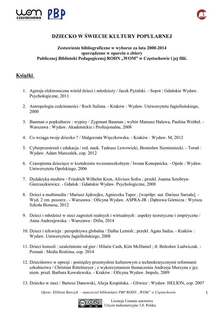 DZIECKO W ŚWIECIE KULTURY POPULARNEJ Zestawienie bibliograficzne w wyborze za lata 2000-2014 sporządzone w oparciu o zbiory Publicznej Biblioteki Pedagogicznej RODN „WOM” w Częstochowie i jej filii. Książki 1. Agresja elektroniczna wśród dzieci i młodzieży / Jacek Pyżalski. - Sopot : Gdańskie Wydaw. Psychologiczne, 2011 2. Antropologia codzienności / Roch Sulima. - Kraków : Wydaw. Uniwersytetu Jagiellońskiego, 2000 3. Bauman o popkulturze : wypisy / Zygmunt Bauman ; wybór Mateusz Halawa, Paulina Wróbel. Warszawa : Wydaw. Akademickie i Profesjonalne, 2008 4. Co wciąga twoje dziecko ? / Małgorzata Więczkowska. - Kraków : Wydaw. M, 2012 5. Cyberprzestrzeń i edukacja / red. nauk. Tadeusz Lewowicki, Bronisław Siemieniecki. - Toruń : Wydaw. Adam Marszałek, cop. 2012 6. Czasopisma dziecięce w kształceniu wczesnoszkolnym / Iwona Konopnicka. - Opole : Wydaw. Uniwersytetu Opolskiego, 2006 7. Dydaktyka mediów / Friedrich Wilhelm Kron, Alivisos Sofos ; przekł. Joanna SztobrynGiercuszkiewicz. - Gdańsk : Gdańskie Wydaw. Psychologiczne, 2008 8. Dzieci a multimedia / Mariusz Jędrzejko, Agnieszka Taper ; [współpr. aut. Dariusz Sarzała]. Wyd. 2 zm. poszerz.. - Warszawa : Oficyna Wydaw. ASPRA-JR ; Dąbrowa Górnicza : Wyższa Szkoła Biznesu, 2012 9. Dzieci i młodzież w sieci zagrożeń realnych i wirtualnych : aspekty teoretyczne i empiryczne / Anna Andrzejewska. - Warszawa : Difin, 2014 10. Dzieci i telewizja : perspektywa globalna / Dafna Lemish ; przekł. Agata Sadza. - Kraków : Wydaw. Uniwersytetu Jagiellońskiego, 2008 11. Dzieci konsoli : uzależnienie od gier / Hilarie Cash, Kim McDaniel ; tł. Bolesław Ludwiczak. Poznań : Media Rodzina, cop. 2014 12. Dzieciństwo w opresji : pomiędzy przemysłem kulturowym a technokratycznymi reformami szkolnictwa / Christian Rittelmeyer ; z wykorzystaniem tłumaczenia Andrzeja Murzyna z jęz. niem. przeł. Barbara Kowalewska. - Kraków : Oficyna Wydaw. Impuls, 2009 13. Dziecko w sieci / Bartosz Danowski, Alicja Krupińska. - Gliwice : Wydaw. HELION, cop. 2007 Oprac. Elżbieta Barczyk – nauczyciel bibliotekarz PBP RODN „WOM” w Częstochowie Licencja Uznanie autorstwa Użycie niekomercyjne 3.0. Polska 1 14. Dziecko w świecie mediów i konsumpcji / red. Małgorzata Bogunia-Borowska. - Kraków : Wydaw. Uniwersytetu Jagiellońskiego, cop. 2006 15. Dziecko w świecie obrazów / Serge Tisseron ; pytania zadaje Brigitte Canuel ; przeł. Elżbieta Burakowska. - Warszawa : Instytut Wydaw. Pax, 2006 16. Dziecko w świecie wiedzy, informacji i komunikacji / Stanisław Juszczyk, Irena Polewczyk. Toruń : Wydaw. Adam Marszałek, 2007 17. Edukacja i kultura popularna / Witold Jakubowski. - Kraków : Oficyna Wydaw. Impuls, 2001 18. Edukacja medialna / Janusz Gajda, Stanisław Juszczyk, Bronisław Siemieniecki, Kazimierz Wenta. - Toruń : Wydaw. Adam Marszałek, 2006 19. Edukacja medialna : nowa generacja pytań i obszarów badawczych / [red. nauk. Marek Sokołowski]. - Olsztyn : Oficyna Wydaw. Kastalia, 2004 20. Edukacja medialna : scenariusze zajęć / Ewa Grzesiak, Renata Janicka-Szyszko, Magdalena Steblecka. - Gdańsk : Gdańskie Wydaw. Psychologiczne, 2005 21. Edukacja medialna w kształceniu wczesnoszkolnym : praca zbiorowa / red. Zuzanna Zbróg. Kielce : Wydaw. Pedagogiczne ZNP, cop. 2008 22. Edukacja medialna w społeczeństwie informacyjnym / red. Stanisław Juszczyk. - Toruń : Wydaw. Adam Marszałek, 2002 23. Edukacja w świecie kultury popularnej / Witold Jakubowski. - Wyd. 2. - Kraków : Oficyna Wydaw. Impuls, 2011 24. Edukacyjne konteksty kultury popularnej / red. Witold Jakubowski, Edyta Zierkiewicz. - Kraków : Oficyna Wydaw. Impuls, 2002 25. Fast food dla mózgu czyli Telewizja i okolice / Piotr Tomasz Nowakowski. - Tychy : Maternus Media, cop. 2002 26. Film, telewizja i komputery w edukacji humanistycznej : o audiowizualnych tekstach kultury / Bogumiła Fiołek-Lubczyńska. - Kraków : Oficyna Wydaw. Impuls, 2004 27. Gry komputerowe, Internet i telewizja : co robić, gdy nasze dzieci są nimi zafascynowane? / Nessia Laniado, Gianfilippo Pietra ; przekł. Jacek Partyka. - Kraków : Wydaw. eSPe, 2006 28. Internet a dzieci : uzależnienia i inne niebezpieczeństwa / Parry Aftab ; przeł. Barbara Nicewicz. Warszawa : Prószyński i S-ka, 2003 29. Internet jako nowe dobro wspólne / Justyna Hofmokl. - Warszawa : Wydaw. Akademickie i Profesjonalne, cop. 2009 30. Internet w bibliotece dla dzieci i młodzieży : od teorii do praktyki : poradnik : praca zbiorowa / red. Grażyna Lewandowicz-Nosal ; [Stowarzyszenie Bibliotekarzy Polskich]. - Warszawa : Wydaw. Stowarzyszenia Bibliotekarzy Polskich, 2009 Oprac. Elżbieta Barczyk – nauczyciel bibliotekarz PBP RODN „WOM” w Częstochowie Licencja Uznanie autorstwa Użycie niekomercyjne 3.0. Polska 2 31. Język i walory edukacyjne czasopism katolickich dla dzieci / Edyta Skoczylas-Krotla ; Akademia im. Jana Długosza w Częstochowie. - Częstochowa : Wydaw. im. Stanisława Podobińskiego Akademii im. Jana Długosza, 2010 32. Komunikowanie (się) w mediach elektronicznych : język, edukacja, semiotyka : monografia / red. nauk. Mirosław Filiciak, Grzegorz Ptaszek. - Warszawa : Wydaw. Akademickie i Profesjonalne, cop. 2009 33. Komunikowanie społeczne i media : perspektywa politologiczna / Mateusz Nieć. - Warszawa : Wolters Kluwer Polska, 2010 34. Kultura masowa : krytyka i obrona / Antonina Kłoskowska. - Wyd.4, 1 dodruk. - Warszawa : Wydaw. Naukowe PWN, 2006 35. Kultura, tożsamość i edukacja : migotanie znaczeń / Zbyszko Melosik, Tomasz Szkudlarek. Wyd. 2 popr.. - Kraków : Oficyna Wydaw. Impuls, 2009 36. Media w edukacji / Janusz Gajda ; Wyższa Szkoła Pedagogiczna ZNP. - Wyd. 8. - Kraków : Oficyna Wydaw. Impuls, 2010 37. Media w nauczaniu / Józef Bednarek. - Warszawa : Wydaw. MIKOM, 2002 38. Media w wychowaniu, dydaktyce oraz zarządzaniu informacją edukacyjną szkoły / Tomasz Huk. Kraków : Oficyna Wydaw. Impuls, 2011 39. Media, wartości, wychowanie / Marek E