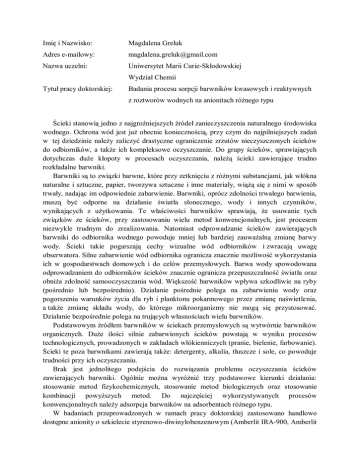 Imię i Nazwisko: Magdalena Greluk Adres e-mailowy: [email protected] Nazwa uczelni: Uniwersytet Marii Curie-Skłodowskiej Wydział Chemii Tytuł pracy doktorskiej: Badania procesu sorpcji barwników kwasowych i reaktywnych z roztworów wodnych na anionitach różnego typu Ścieki stanowią jedno z najgroźniejszych źródeł zanieczyszczenia naturalnego środowiska wodnego. Ochrona wód jest już obecnie koniecznością, przy czym do najpilniejszych zadań w tej dziedzinie należy zaliczyć drastyczne ograniczenie zrzutów nieczyszczonych ścieków do odbiorników, a także ich kompleksowe oczyszczanie. Do grupy ścieków, sprawiających dotychczas duże kłopoty w procesach oczyszczania, należą ścieki zawierające trudno rozkładalne barwniki. Barwniki są to związki barwne, które przy zetknięciu z różnymi substancjami, jak włókna naturalne i sztuczne, papier, tworzywa sztuczne i inne materiały, wiążą się z nimi w sposób trwały, nadając im odpowiednie zabarwienie. Barwniki, oprócz zdolności trwałego barwienia, muszą być odporne na działanie światła słonecznego, wody i innych czynników, wynikających z użytkowania. Te właściwości barwników sprawiają, że usuwanie tych związków ze ścieków, przy zastosowaniu wielu metod konwencjonalnych, jest procesem niezwykle trudnym do zrealizowania. Natomiast odprowadzanie ścieków zawierających barwniki do odbiornika wodnego powoduje mniej lub bardziej zauważalną zmianę barwy wody. Ścieki takie pogarszają cechy wizualne wód odbiorników i zwracają uwagę obserwatora. Silne zabarwienie wód odbiornika ogranicza znacznie możliwość wykorzystania ich w gospodarstwach domowych i do celów przemysłowych. Barwa wody spowodowana odprowadzaniem do odbiorników ścieków znacznie ogranicza przepuszczalność światła oraz obniża zdolność samooczyszczania wód. Większość barwników wpływa szkodliwie na ryby (pośrednio lub bezpośrednio). Działanie pośrednie polega na zabarwieniu wody oraz pogorszeniu warunków życia dla ryb i planktonu pokarmowego przez zmianę naświetlenia, a także zmianę składu wody, do którego mikroorganizmy nie mogą się przystosować. Działanie bezpośrednie polega na trujących własnościach wielu barwników. Podstawowym źródłem barwników w ściekach przemysłowych są wytwórnie barwników organicznych. Duże ilości silnie zabarwionych ścieków powstają w wyniku procesów technologicznych, prowadzonych w zakładach włókienniczych (pranie, bielenie, farbowanie). Ścieki te poza barwnikami zawierają także: detergenty, alkalia, tłuszcze i sole, co powoduje trudności przy ich oczyszczaniu. Brak jest jednolitego podejścia do rozwiązania problemu oczyszczania ścieków zawierających barwniki. Ogólnie można wyróżnić trzy podstawowe kierunki działania: stosowanie metod fizykochemicznych, stosowanie metod biologicznych oraz stosowanie kombinacji powyższych metod. Do najczęściej wykorzystywanych procesów konwencjonalnych należy adsorpcja barwników na adsorbentach różnego typu. W badaniach przeprowadzonych w ramach pracy doktorskiej zastosowano handlowo dostępne anionity o szkielecie styrenowo-diwinylobenzenowym (Amberlit IRA-900, Amberlit IRA-910, Amberlyst A-21) oraz akrylowym (Amberlit IRA-67, Amberlit IRA-458, Amberlit IRA-958) w procesie sorpcji stosowanych powszechnie w przemyśle włókienniczym: barwników kwasowych (oranż kwasowy 7, oranż kwasowy 10, czerwień kwasowa 88) oraz barwników reaktywnych (czerń reaktywna 5, czerwień reaktywna 2, czerwień reaktywna 120). Badania prowadzono metodą statyczną z układów modelowych, badając wpływ istotnych czynników na proces sorpcji barwników. Zbadano kolejno: wpływ czasu kontaktu faz roztwór-jonit, wpływ początkowego stężenia barwnika, wpływ pH, wpływ temperatur, wpływ dodatku surfaktanta oraz wpływ soli. Rola tych czynników na proces sorpcji nie może być pominięta, ponieważ rzeczywiste ścieki włókiennicze charakteryzują się zmienną ilością barwnika, obecnością substancji pomocniczych (sole, surfaktanty) oraz zmiennym pH i temperaturą. Dlatego uwzględnienie ich wpływu we wstępnych badaniach laboratoryjnych było zagadnieniem niezwykle istotnym i pozwoliło na dokonanie klasyfikacji zastosowanych anionitów pod względem ich przydatności w oczyszczaniu ścieków włókienniczych i wybór anionitów o najlepszych właściwościach sorpcyjnych, dla których zostaną przeprowadzone badania bardziej szczegółowe. Jako aspekt praktyczny pracy wybrane wymieniacze anionowe zostaną zastosowane w procesie usuwania barwników z rzeczywistych ścieków włókienniczych. Wyniki prowadzonych przeze mnie w trakcie wykonywania doktoratu badań mogą znaleźć praktyczne zastosowanie w ochronie środowiska, a dokładniej mówiąc w ochronie wód powierzchniowych przed ściekami zawierającymi barwniki. Zgromadzone dane eksperymentalne, jak i wyznaczone parametry teoretyczne, mogą być w przyszłości wykorzystane w procesie projektowania odpowiednich przemysłowych instalacji stosowanych w procesie oczyszczania ścieków zawierających te, trudno biodegradowalne i w znacznym stopniu pogarszające barwę wód, związki. Warto nadmienić, że oczyszczanie ścieków jest konieczne nie tylko ze względu na zanieczyszczenie środowiska, lecz także na możliwość obniżenia kosztów eksploatacyjnych (oszczędność surowców, wody). Pewna ilość barwników obecnych w ściekach na terenie Lubelszczyzny, jak i całego kraju, trafia tam wraz z popłuczynami powstającymi w wyniku prania odzieży w pralniach, jak i gospodarstwach domowych. Duże ilości silnie zabarwionych ścieków powstają w zakładach przemysłu włókienniczego mieszczących się w Polsce, zwłaszcza na terenie Łodzi i jej okolic. Problem zanieczyszczenia wód barwnikami nie jest bowiem problemem o charakterze regionalnym czy krajowym, ale ogólnoświatowym.