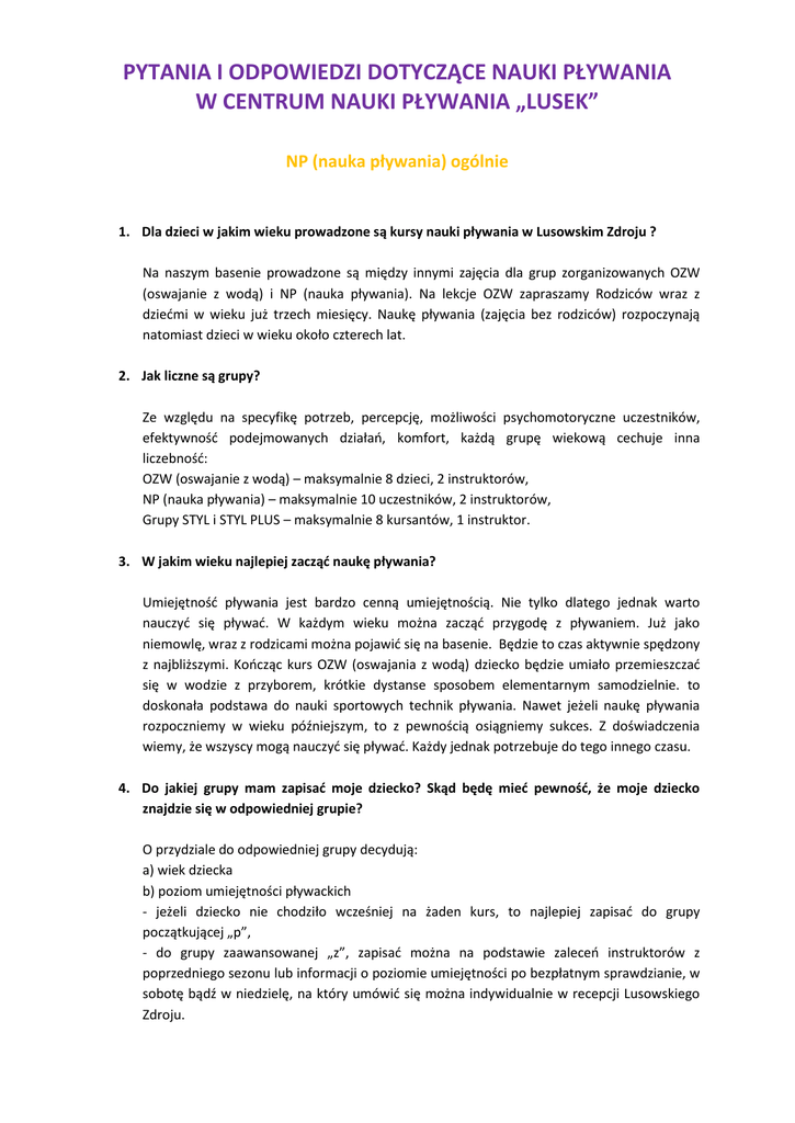 PYTANIA I ODPOWIEDZI DOTYCZĄCE NAUKI PŁYWANIA W CENTRUM NAUKI PŁYWANIA „LUSEK” NP (nauka pływania) ogólnie 1. Dla dzieci w jakim wieku prowadzone są kursy nauki pływania w Lusowskim Zdroju ? Na naszym basenie prowadzone są między innymi zajęcia dla grup zorganizowanych OZW (oswajanie z wodą) i NP (nauka pływania). Na lekcje OZW zapraszamy Rodziców wraz z dziećmi w wieku już trzech miesięcy. Naukę pływania (zajęcia bez rodziców) rozpoczynają natomiast dzieci w wieku około czterech lat. 2. Jak liczne są grupy? Ze względu na specyfikę potrzeb, percepcję, możliwości psychomotoryczne uczestników, efektywność podejmowanych działań, komfort, każdą grupę wiekową cechuje inna liczebność: OZW (oswajanie z wodą) – maksymalnie 8 dzieci, 2 instruktorów, NP (nauka pływania) – maksymalnie 10 uczestników, 2 instruktorów, Grupy STYL i STYL PLUS – maksymalnie 8 kursantów, 1 instruktor. 3. W jakim wieku najlepiej zacząć naukę pływania? Umiejętność pływania jest bardzo cenną umiejętnością. Nie tylko dlatego jednak warto nauczyć się pływać. W każdym wieku można zacząć przygodę z pływaniem. Już jako niemowlę, wraz z rodzicami można pojawić się na basenie. Będzie to czas aktywnie spędzony z najbliższymi. Kończąc kurs OZW (oswajania z wodą) dziecko będzie umiało przemieszczać się w wodzie z przyborem, krótkie dystanse sposobem elementarnym samodzielnie. to doskonała podstawa do nauki sportowych technik pływania. Nawet jeżeli naukę pływania rozpoczniemy w wieku późniejszym, to z pewnością osiągniemy sukces. Z doświadczenia wiemy, że wszyscy mogą nauczyć się pływać. Każdy jednak potrzebuje do tego innego czasu. 4. Do jakiej grupy mam zapisać moje dziecko? Skąd będę mieć pewność, że moje dziecko znajdzie się w odpowiedniej grupie? O przydziale do odpowiedniej grupy decydują: a) wiek dziecka b) poziom umiejętności pływackich - jeżeli dziecko nie chodziło wcześniej na żaden kurs, to najlepiej zapisać do grupy początkującej „p”, - do grupy zaawansowanej „z”, zapisać można na podstawie zaleceń instruktorów z poprzedniego sezonu lub informacji o poziomie umiejętności po bezpłatnym sprawdzianie, w sobotę bądź w niedzielę, na który umówić się można indywidualnie w recepcji Lusowskiego Zdroju. 5. Jeżeli moje dziecko w ogóle nie umie pływać, jak szybko zdobędzie tę umiejętność? Każdy potrzebuje innego czasu, żeby nauczyć się pływać. To sprawa indywidualna. Ważny jest wiek, systematyczność. Bez względu na to, na początku kursu dążymy jednak do tego aby dziecko po skoku (wpadnięciu) do wody, bez paniki, sposobem elementarnym potrafiło dopłynąć do brzegu (około 1 – 2 miesięcy). Pływać przy pomocy naprzemianstronnej pracy nóg na grzbiecie i na piersiach, krótkich dystansów dziecko będzie umiało po około połowie sezonu. Ostateczne „szlifowanie” stylów odbędzie się na kursie grup STYL i STYL PLUS. Oczywiście szybciej (przynajmniej dwa razy szybciej) dzieci uczą się pływać podczas lekcji indywidualnych. 6. Czy moje dziecko będzie czuć się bezpiecznie w basenie, czy będzie „miało grunt”? Ukształtowanie dna basenu w Lusowskim Zdroju sprzyja komfortowi nauczania pływania. Nawet bardzo młodzi (około 4 letni) uczestnicy zajęć dotykają dna w części płytkiej (głębokość 90cm). Liczebność grupy oraz dwóch instruktorów podczas zajęć pozwala na indywidualne zajęcie się tymi, którym mimo wszystko do dna zabrakło kilku centymetrów. 7. Ilu instruktorów pracuje z dziećmi podczas zajęć nauki pływania? W grupach OZW (oswajanie z woda) i NP (nauki pływania), w zajęciach uczestniczy dwóch instruktorów: prowadzący i asystujący. Zajęcia w grupach STYL i STYL PLUS, ze względu na poziom umiejętności uczestników, prowadzi natomiast jeden instruktor. 8. Czy podczas zajęć instruktor jest w wodzie razem z dziećmi? Zajęcia w grupach OZW (oswajania z wodą ) oraz NP (nauki pływania) prowadzone są z obecnością instruktorów w wodzie. Podyktowane jest to względami bezpieczeństwa i większymi możliwościami pomocy przy ćwiczeniach. Umiejętności uczestników pozwalają w grupach STYL i STYL PLUS instruktorowi prowadzić lekcje z brzegu basenu. Metodyka 9. Czy nauka pływania odbywa się według programu metodycznego? Kto nad tym czuwa? Oczywiście, w lusowskim Zdroju prowadzimy zajęcia według dedykowanych każdej z grup programów. Instruktorzy mają doświadczenie w pracy z dziećmi i systematycznie uczestniczą w szkoleniach. Nad jakością ich pracy i efektami nieustannie czuwa koordynator metodyczny. 10. Co to jest grupa STYL oraz STYL PLUS ? Nowo powstałe grupy STYL i STYL PLUS przeznaczone są dla dzieci, które na zaawansowanym poziomie opanowały umiejętność pływania dwoma lub trzema sportowymi technikami pływackimi. Zajęcia mają na celu doskonalenie ich, tak żeby uczestnicy pływali bardzo dobrze „technicznie” (stylowo) oraz naukę startów, nawrotów, skoku startowego. Przebieg zajęć monitorowany jest w sposób szczególny przez koordynatora metodycznego, raporty osiągnięć natomiast przekazywane dwa razy w sezonie. Każdy uczestnik ma także indywidualnie określony cel, który powinien osiągnąć podczas zajęć. 11. Na czym polega indywidualizacja programu nauczania w grupach STYL i STYL PLUS? Maksymalna liczebność grup STYL i STYL PLUS to 8 dzieci. Sprzyja to osobistemu podejściu do każdego. Ponadto każdy uczestnik ma także indywidualnie określony cel, który powinien osiągnąć podczas zajęć, raporty osiągnięć przekazywane dwa razy w sezonie. OZW (oswajanie z wodą) 12. Na czym polegają zajęcia oswajania z wodą? Zajęcia OZW (oswajania z wodą) polegają na zastosowaniu takiego zestawu ćwiczeń, które stymulują rozwój ruchowy dziecka przez zabawę w wodzie. Pozytywnie wpływają również na rozwój społeczny, wzmacniają więzi emocjonalne 