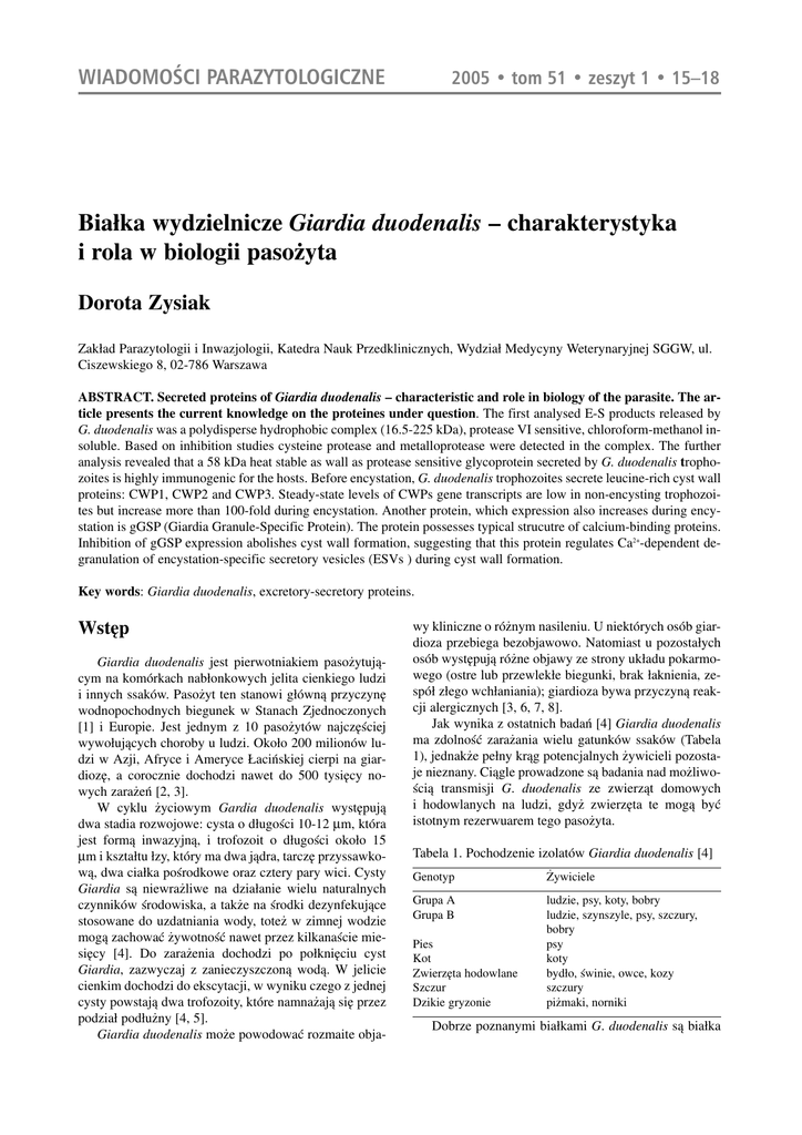 WIADOMOŒCI PARAZYTOLOGICZNE 2005 • tom 51 • zeszyt 1 • 15–18 Białka wydzielnicze Giardia duodenalis – charakterystyka i rola w biologii pasożyta Dorota Zysiak Zakład Parazytologii i Inwazjologii, Katedra Nauk Przedklinicznych, Wydział Medycyny Weterynaryjnej SGGW, ul. Ciszewskiego 8, 02−786 Warszawa ABSTRACT. Secreted proteins of Giardia duodenalis – characteristic and role in biology of the parasite. The ar− ticle presents the current knowledge on the proteines under question. The first analysed E−S products released by G. duodenalis was a polydisperse hydrophobic complex (16.5−225 kDa), protease VI sensitive, chloroform−methanol in− soluble. Based on inhibition studies cysteine protease and metalloprotease were detected in the complex. The further analysis revealed that a 58 kDa heat stable as wall as protease sensitive glycoprotein secreted by G. duodenalis tropho− zoites is highly immunogenic for the hosts. Before encystation, G. duodenalis trophozoites secrete leucine−rich cyst wall proteins: CWP1, CWP2 and CWP3. Steady−state levels of CWPs gene transcripts are low in non−encysting trophozoi− tes but increase more than 100−fold during encystation. Another protein, which expression also increases during ency− station is gGSP (Giardia Granule−Specific Protein). The protein possesses typical strucutre of calcium−binding proteins. Inhibition of gGSP expression abolishes cyst wall formation, suggesting that this protein regulates Ca2+−dependent de− granulation of encystation−specific secretory vesicles (ESVs ) during cyst wall formation. Key words: Giardia duodenalis, excretory−secretory proteins. Wstęp Giardia duodenalis jest pierwotniakiem pasożytują− cym na komórkach nabłonkowych jelita cienkiego ludzi i innych ssaków. Pasożyt ten stanowi główną przyczynę wodnopochodnych biegunek w Stanach Zjednoczonych [1] i Europie. Jest jednym z 10 pasożytów najczęściej wywołujących choroby u ludzi. Około 200 milionów lu− dzi w Azji, Afryce i Ameryce Łacińskiej cierpi na giar− diozę, a corocznie dochodzi nawet do 500 tysięcy no− wych zarażeń [2, 3]. W cyklu życiowym Gardia duodenalis występują dwa stadia rozwojowe: cysta o długości 10−12 µm, która jest formą inwazyjną, i trofozoit o długości około 15 µm i kształtu łzy, który ma dwa jądra, tarczę przyssawko− wą, dwa ciałka pośrodkowe oraz cztery pary wici. Cysty Giardia są niewrażliwe na działanie wielu naturalnych czynników środowiska, a także na środki dezynfekujące stosowane do uzdatniania wody, toteż w zimnej wodzie mogą zachować żywotność nawet przez kilkanaście mie− sięcy [4]. Do zarażenia dochodzi po połknięciu cyst Giardia, zazwyczaj z zanieczyszczoną wodą. W jelicie cienkim dochodzi do ekscytacji, w wyniku czego z jednej cysty powstają dwa trofozoity, które namnażają się przez podział podłużny [4, 5]. Giardia duodenalis może powodować rozmaite obja− wy kliniczne o różnym nasileniu. U niektórych osób giar− dioza przebiega bezobjawowo. Natomiast u pozostałych osób występują różne objawy ze strony układu pokarmo− wego (ostre lub przewlekłe biegunki, brak łaknienia, ze− spół złego wchłaniania); giardioza bywa przyczyną reak− cji alergicznych [3, 6, 7, 8]. Jak wynika z ostatnich badań [4] Giardia duodenalis ma zdolność zarażania wielu gatunków ssaków (Tabela 1), jednakże pełny krąg potencjalnych żywicieli pozosta− je nieznany. Ciągle prowadzone są badania nad możliwo− ścią transmisji G. duodenalis ze zwierząt domowych i hodowlanych na ludzi, gdyż zwierzęta te mogą być istotnym rezerwuarem tego pasożyta. Tabela 1. Pochodzenie izolatów Giardia duodenalis [4] Genotyp Żywiciele Grupa A Grupa B ludzie, psy, koty, bobry ludzie, szynszyle, psy, szczury, bobry psy koty bydło, świnie, owce, kozy szczury piżmaki, norniki Pies Kot Zwierzęta hodowlane Szczur Dzikie gryzonie Dobrze poznanymi białkami G. duodenalis są białka 16 antygenowe takie jak giardina, białka cytoszkieletu, biał− ka szoku cieplnego oraz niektóre białka bogate w cystei− nę [3, 9, 10]. Poznana jest też grupa lektyn błonowych, które odgrywają istotną rolę w rozpoznawaniu komórek nabłonkowych jelita i przyleganiu do nich. Trofozoity G. duodenalis wytwarzają VSPs (variant surface proteins). Funkcja tych białek nie jest jeszcze do końca scharakte− ryzowana, ale przypuszcza się, że odgrywają istotną rolę w interakcjach pasożyt−żywiciel [3, 11]. Część VSPs ule− ga sekrecji, jednak ich sekrecyjna funkcja w regulacji in− fekcji nie została jeszcze określona [1, 12]. Chęć poznania interakcji pasożyt−żywiciel oraz me− chanizmów i przebiegu procesu encystacji skłoniła nau− kowców do bardziej intensywnych badań białek wydziel− niczych mogących mieć istotne znaczenie w analizie te− go procesu oraz w interakcji pomiędzy żywicielem a pa− sożytem. Białka ekskrecyjno−sekrecyjne Identyfikacja i charakterystyka produktów ekskrecyj− no−sekrecyjnych (ES) może doprowadzić do zrozumienia biologii pasożyta, a także interakcji pasożyt−żywiciel. Pionierami badań nad tymi białkami byli w przypadku G. duodenalis Nash i wsp. [1]. Badane przez nich produkty ES zbierane były z podłoża TYI−S−33, w którym uprze− dnio hodowany był pasożyt. Określili oni główną grupę tych produktów, których masa zawiera się w przedziale od 94 do 225 kDa, oraz pojawiające się niekiedy produk− ty z zakresu od 16,5 kDa do 94 kDa. Autorzy wykazali obecność aminokwasów oraz węglowodanów i tłuszczów, jednak próby potwierdzenia obecności grup cukrowych nie powiodły się. Stwierdzono również hydrofobowy cha− rakter badanej grupy białek. Wszystkie badania sugerują, że białka te w przeważającej części mogą być lipoprotei− nami. Przeprowadzono również testy porównujące dwa izolaty Giardia WB i P−1. Użyto pr