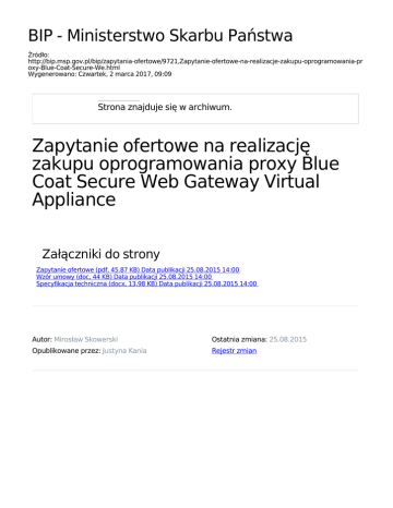 BIP - Ministerstwo Skarbu Państwa Źródło: http://bip.msp.gov.pl/bip/zapytania-ofertowe/9721,Zapytanie-ofertowe-na-realizacje-zakupu-oprogramowania-pr oxy-Blue-Coat-Secure-We.html Wygenerowano: Czwartek, 2 marca 2017, 09:09 Strona znajduje się w archiwum. Zapytanie ofertowe na realizację zakupu oprogramowania proxy Blue Coat Secure Web Gateway Virtual Appliance Załączniki do strony Zapytanie ofertowe (pdf, 45.87 KB) Data publikacji 25.08.2015 14:00 Wzór umowy (doc, 44 KB) Data publikacji 25.08.2015 14:00 Specyfikacja techniczna (docx, 13.98 KB) Data publikacji 25.08.2015 14:00 Autor: Mirosław Skowerski Ostatnia zmiana: 25.08.2015 Opublikowane przez: Justyna Kania Rejestr zmian