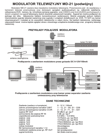 MODULATOR TELEWIZYJNY MD-21 (podwójny) Modulator MD-21 zawiera dwa niezale¿ne modulatory telewizyjne. Przeznaczony jest do wspó³pracy z kamerami telewizji przemys³owej oraz domowym sprzêtem audiowizualnym np. odbiorniki satelitarne, odtwarzacze DVD, kamery, itp. Umo¿liwia zamianê sygna³ów wizji (VIDEO) oraz fonii (AUDIO) pochodz¹cych z dwóch urz¹dzeñ na sygna³ telewizyjny dwóch dowolnie ustawionych kana³ów . Sygna³ ten mo¿na pod³¹czyæ do jednego lub kilku telewizorów kablem koncentrycznym (antenowym). Mo¿na przesy³aæ jednym kablem równoczeœnie sygna³y telewizji naziemnej oraz sygna³y z urz¹dzeñ dodatkowych np. DVD, TV SAT czy kamer obserwacyjnych i rozes³aæ je do wszystkich telewizorów w ca³ym domu. Na ka¿dym telewizorze, wybieraj¹c odpowiedni kana³ mo¿na bêdzie ogl¹daæ obraz z dowolnego urz¹dzenia dodatkowego oraz programy telewizji naziemnej. PRZYK£ADY PO£¥CZEÑ MODULATORA zasilacz sieciowy tuner TV SAT telewizor odtwarzacz DVD antena zewnêtrzna Pod³¹czenie z zasilaniem modulatora przez gniazdo DC 9-12V/150mA zasilacz sieciowy telewizor kamery obserwacyjne antenowy separator zasilania 12V VIDEO 12V VIDEO Pod³¹czenie z zasilaniem modulatora oraz kamer przez separator zasilania umieszczony przy telewizorze DANE TECHNICZNE Zasilanie (zasilacz w komplecie) 9 - 12 V / 150mA zakres przestrajania kana³ów OIRT zakres przestrajania kana³ów CCIR 1 - 12, 21 - 69, S1 - S38 2 - 12, 21 -71, S1 - S41 wyjœcie RF OUT wzmocnienie dla wejœcia RF IN czêstotliwoœæ podnoœnej fonii wejœcie wizji wyjœcie wizji wejœcie fonii wyjœcie fonii rodzaj modulacji filtr harmonicznych kana³ów 1-12 mo¿liwoœæ zasilania przez gn. RF OUT sygna³ kontrolny 82 dBuV, gn. typ F 0 dB, gn. typ F 5,5 MHz / 6,5 MHz 1V/75ohm, gn. typ RCA 1V/75ohm, gn. typ RCA 775mV/600ohm, gn. typ RCA 775mV/600ohm, gn. typ RCA dwuwstêgowa nie posiada tak (prze³¹czane) tak (bia³o-czarne pasy) OBS£UGA MODULATORA PRZE£¥CZANIE KANA£ÓW Po pod³¹czeniu zasilania na wyœwietlaczu pojawia siê numer kana³u telewizyjnego dla toru A. Prze³¹czanie pomiêdzy torami A i B nastêpuje poprzez krótkie naciœniêcie przycisku <A albo B>, wyœwietlacz pokazuje numer kana³u danego toru. Zmiana numeru kana³u wymaga d³u¿szego przytrzymania (ok. 2 sek.) przycisku <A albo B> w zale¿noœci od tego który tor chcemy przestroiæ. Gdy wyœwietlacz zacznie pulsowaæ, przyciskami <A oraz B> mo¿emy przestrajaæ kana³y w górê lub w dó³. Po up³ywie oko³o 5 sek. od ustawienia kana³u pulsownie wyœwietlacza ustaje. Mo¿emy wówczas prze³¹czyæ siê na drugi tor i wykonaæ jego strojenie. ZMIANA SYSTEMU KANA£ÓW TELEWIZYJNYCH Modulator mo¿e pracowaæ w rastrze kana³ów telewizyjnych zgodnych z systemem OIRT (Polska), albo CCIR. W celu wybrania systemu nale¿y trzymaj¹c wciœniête przyciski <A oraz B> w³¹czyæ zasilanie. Wyœwietlacz poka¿e aktualny system "oi" (OIRT) albo "cc" (CCIR). Pos³uguj¹c siê przyciskami < > nale¿y wybraæ system, a nastêpnie wy³¹czyæ zasilanie modulatora. ZMIANA CZÊSTOTLIWOŒCI NOŒNEJ FONII Trzymaj¹c wciœniêty przycisk B> w³¹czyæ zasilanie modulatora. Wyœwietlacz poka¿e wówczas czêstotliwoœæ noœn¹ fonii. Mo¿na wybraæ 5,5 MHz lub 6,5 MHz. Nastêpnie wy³¹czyæ zasilanie modulatora. SYGNA£ TESTU Trzymaj¹c wciœniêty przycisk <A w³¹czyæ zasilanie modulatora. Wyœwietlacz przez chwilê wyœwietli znak ////. W trybie tym modulator pokazuje na ekranie telewizora bia³o-czarne pasy pionowe oraz sygna³ akustyczny 1kHz. Podczas sygna³u testu mo¿na przestrajaæ kana³y. Wyjœcie z sygna³u testu nastêpuje przez wy³¹czenie zasilania. OSZCZÊDNOŒÆ ENERGII Dotyczy tylko normalnego trybu pracy. Je¿eli przez czas ok. 1 min. nie naciskamy ¿adnego przycisku to modulator przechodzi w stan obni¿onego poboru mocy, wyœwietlacz jest wówczas wygaszony. Wyjœcie z tego trybu nastêpuje przez naciœniêcie dowolnego przycisku. ZASILANIE PRZEZ GNIAZDO RF OUT Zasilanie modulatora przez gniazdo RF OUT z zastosowaniem antenowego separatora zasilania wymaga prze³¹czenia jumpera wewn¹trz obudowy zgodnie z umieszczonym tam rysunkiem. Gniazdo DC9-12V mo¿na w tej sytuacji wykorzystaæ jako Ÿród³o napiêcia do zasilania kamer pod³¹czonych do modulatora. KARTA GWARANCYJNA Nr seryjny / data produkcji ........................................................ Data sprzeda¿y ........................................................ Podpis i pieczêæ sprzedawcy ........................................................ SAT-SERWIS s.c. Z.P.H.U. 91-403 £ÓD•, ul. Tamka 16 www.satserwis.pl WARUNKI GWARANCJI 1. Producent zobowi¹zuje siê do bezp³atnego usuwania wad i uszkodzeñ ujawnionych w okresie gwarancji tj. 12 miesiêcy od daty zakupu jednak nie d³u¿ej ni¿ 24 miesi¹ce od daty produkcji 2. Okres oczekiwania na naprawê nie mo¿e byæ ni¿ 14 dni roboczych od daty dostarczenia urz¹dzenia do naprawy 3 Warunkiem przyjêcia sprzêtu do naprawy jest dostarczenie przez klienta: - czytelnie i poprawnie wype³nionej karty gwarancyjnej - reklamowanego wyrobu - szczegó³owego opisu przyczyny oddania do naprawy 4. Gwarancja nie obejmuje: -uszkodzeñ powsta³ych z przyczyn zewnêtrznych, takich jak: zjawiska atmosferyczne, zanieczyszczenia, uszkodzenia mechaniczne, termiczne lub chemiczne, niew³aœciwe zasilanie oraz instalacjê i eksploatacjê niezgodn¹ z oryginaln¹ instrukcj¹ obs³ugi urz¹dzenia. - wyrobu w którym dokonano przeróbek, zmian konstrukcyjnych lub napraw przez osoby nieupowa¿nione oraz gdy nalepka gwarancyjna jest uszkodzona. 5. Niniejsza karta gwarancyjna stanowi jedyn¹ podstawê do realizacji uprawnieñ gwarancyjnych. Akceptujê warunki gwarancji ........................................ podpis klienta Tabela czêstotliwoœci kana³ów telewizyjnych dla modulatorów MD-21, MD-5 oraz MD-5 stereo w systemie CCIR kana³ CH:02 CH:03 CH:04 CH:05 CH:06 CH:07 CH:08 CH:09 CH:10 CH:11 CH:12 CH:21 CH:22 CH:23 CH:24 CH:25 CH:2