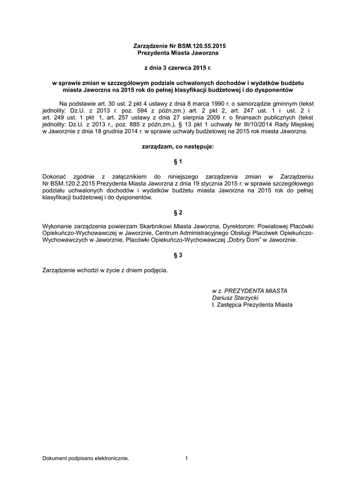 Zarządzenie Nr BSM.120.55.2015 Prezydenta Miasta Jaworzna z dnia 3 czerwca 2015 r. w sprawie zmian w szczegółowym podziale uchwalonych dochodów i wydatków budżetu miasta Jaworzna na 2015 rok do pełnej klasyfikacji budżetowej i do dysponentów Na podstawie art. 30 ust. 2 pkt 4 ustawy z dnia 8 marca 1990 r. o samorządzie gminnym (tekst jednolity: Dz.U. z 2013 r. poz. 594 z późn.zm.) art. 2 pkt 2, art. 247 ust. 1 i ust. 2 i art. 249 ust. 1 pkt 1, art. 257 ustawy z dnia 27 sierpnia 2009 r. o finansach publicznych (tekst jednolity: Dz.U. z 2013 r., poz. 885 z późn.zm.), § 13 pkt 1 uchwały Nr III/10/2014 Rady Miejskiej w Jaworznie z dnia 18 grudnia 2014 r. w sprawie uchwały budżetowej na 2015 rok miasta Jaworzna. zarządzam, co następuje: §1 Dokonać zgodnie z załącznikiem do niniejszego zarządzenia zmian w Zarządzeniu Nr BSM.120.2.2015 Prezydenta Miasta Jaworzna z dnia 19 stycznia 2015 r. w sprawie szczegółowego podziału uchwalonych dochodów i wydatków budżetu miasta Jaworzna na 2015 rok do pełnej klasyfikacji budżetowej i do dysponentów. §2 Wykonanie zarządzenia powierzam Skarbnikowi Miasta Jaworzna, Dyrektorom: Powiatowej Placówki Opiekuńczo-Wychowawczej w Jaworznie, Centrum Administracyjnego Obsługi Placówek OpiekuńczoWychowawczych w Jaworznie, Placówki Opiekuńczo-Wychowawczej „Dobry Dom” w Jaworznie. §3 Zarządzenie wchodzi w życie z dniem podjęcia. w z. PREZYDENTA MIASTA Dariusz Starzycki I. Zastępca Prezydenta Miasta PREZYDENT MIASTA JAWORZNA Paweł Silbert Dokument podpisano elektronicznie. 1 Załącznik do Zarządzenia Nr BSM.120.55.2015 Prezydenta Miasta Jaworzna z dnia 3 czerwca 2015 r. Zmiany w szczegółowym podziale uchwalonych dochodów i wydatków budżetu miasta Jaworzna na 2015 rok do pełnej klasyfikacji budżetowej i do dysponentów I. W układzie wykonawczym budżetu miasta Jaworzna na 2015 r. dokonać zmian w planie dochodów polegających na zmianie dysponenta realizującego zaplanowane dochody w poniższy sposób: 1. w dziale 852 – Pomoc społeczna wyłączyć realizację dochodów w rozdz. 85201 – Placówki opiekuńczo-wychowawcze w kwocie 650 zł § 0920 – Pozostałe odsetki w kwocie 650 zł od dotychczasowego dysponenta tj. Powiatowej Placówki OpiekuńczoWychowawczej w Jaworznie. ująć realizację dochodów w rozdz. 85201 – Placówki opiekuńczo-wychowawcze w kwocie 650 zł § 0920 – Pozostałe odsetki w kwocie 650 zł u nowego dysponenta tj. w Centrum Administracyjnym Obsługi Placówek Opiekuńczo-Wychowawczych w Jaworznie. 2. w dziale 852 – Pomoc społeczna wyłączyć realizację dochodów w rozdz. 85201 – Placówki opiekuńczo-wychowawcze w kwocie 650 zł § 0920 – Pozostałe odsetki w kwocie 350 zł § 0960 – Otrzymane spadki, zapisy i darowizny w postaci pieniężnej w kwocie 300 zł od dotychczasowego dysponenta tj. Powiatowej Placówki OpiekuńczoWychowawczej w Jaworznie. ująć realizację dochodów w rozdz. 85201 – Placówki opiekuńczo-wychowawcze w kwocie 650 zł § 0920 – Pozostałe odsetki w kwocie 350 zł § 0960 – Otrzymane spadki, zapisy i darowizny w postaci pieniężnej w kwocie 300 zł u nowego dysponenta tj. Placówki Opiekuńczo-Wychowawczej „Dobry Dom” w Jaworznie. II. W układzie wykonawczym budżetu miasta Jaworzna na 2015 r. dokonać zmian w planie wydatków polegających na zmianie dysponenta realizującego zaplanowane wydatki w poniższy sposób: 1) w dziale 851 – Ochrona zdrowia wyłączyć realizację wydatków w rozdz. 85156 – Składki na ubezpieczenie zdrowotne oraz świadczenia dla osób nieobjętych obowiązkiem ubezpieczenia zdrowotnego w kwocie 4.587 zł § 4130 – Składki na ubezpieczenie zdrowotne w kwocie 4.587 zł od dotychczasowego dysponenta tj. Powiatowej Placówki OpiekuńczoWychowawczej w Jaworznie. Dokument podpisano elektronicznie. 2 ująć realizację wydatków w rozdz. 85156 – Składki na ubezpieczenie zdrowotne oraz świadczenia dla osób nieobjętych obowiązkiem ubezpieczenia zdrowotnego w kwocie 4.587 zł § 4130 – Składki na ubezpieczenie zdrowotne w kwocie 4.587 zł u nowego dysponenta tj. Placówki Opiekuńczo-Wychowawczej „Dobry Dom” w Jaworznie. 2) w dziale 852 – Pomoc społeczna wyłączyć realizację wydatków w rozdz. 85201 – Placówki opiekuńczo-wychowawcze w kwocie § 3110 – Świadczenia społeczne w kwocie 173.782 zł 1.000 zł § 4010 – Wynagrodzenia osobowe pracowników w kwocie § 4110 – Składki na ubezpieczenia społeczne w kwocie § 4120 – Składki na Fundusz Pracy w kwocie 102.660 zł 14.000 zł 1.032 zł § 4210 – Zakup materiałów i wyposażenia w kwocie 12.000 zł § 4220 – Zakup środków żywności w kwocie 15.000 zł § 4230 – Zakup leków, wyrobów medycznych i produktów biobójczych w kwocie 2.000 zł § 4240 – Zakup pomocy naukowych, dydaktycznych i książek w kwocie 2.000 zł § 4260 – Zakup energii w kwocie 16.400 zł § 4280 – Zakup usług zdrowotnych w kwocie 300 zł § 4300 – Zakup usług pozostałych w kwocie 5.000 zł § 4360 – Opłaty z tytułu zakupu usług telekomunikacyjnych w kwocie 920 zł § 4410 – Podróże służbowe krajowe w kwocie 450 zł § 4430 – Różne opłaty i składki w kwocie 360 zł § 4520 – Opłaty na rzecz budżetów jednostek samorządu terytorialnego w kwocie 660 zł od dotychczasowego dysponenta tj. Powiatowej Placówki OpiekuńczoWychowawczej w Jaworznie. ująć realizację wydatków w rozdz. 85201 – Placówki opiekuńczo-wychowawcze w kwocie § 3110 – Świadczenia społeczne w kwocie 173.782 zł 1.000 zł § 4010 – Wynagrodzenia osobowe pracowników w kwocie § 4110 – Składki na ubezpieczenia społeczne w kwocie § 4120 – Składki na Fundusz Pracy w kwocie 102.660 zł 14.000 zł 1.032 zł § 4210 – Zakup materiałów i wyposażenia w kwocie 12.000 zł § 4220 – Zakup środków żywności w kwocie 15.000 zł § 4230 – Zakup leków, wyrobów medycznych i produktów biobójczych w kwocie 2.000 zł § 4240 