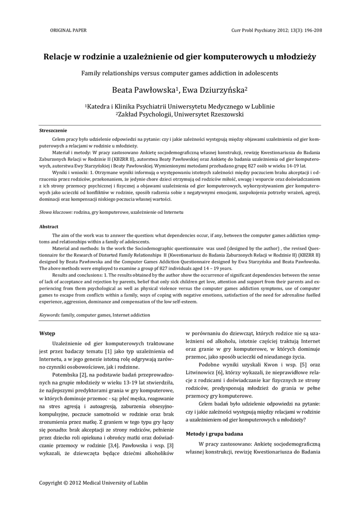 ORIGINAL PAPER Curr Probl Psychiatry 2012; 13(3): 196-208 Relacje w rodzinie a uzależnienie od gier komputerowych u młodzieży Family relationships versus computer games addiction in adolescents Beata Pawłowska1, Ewa Dziurzyńska2 1Katedra i Klinika Psychiatrii Uniwersytetu Medycznego w Lublinie 2Zakład Psychologii, Uniwersytet Rzeszowski Streszczenie Celem pracy było udzielenie odpowiedzi na pytanie: czy i jakie zależności występują między objawami uzależnienia od gier komputerowych a relacjami w rodzinie u młodzieży. Materiał i metody: W pracy zastosowano Ankietę socjodemograficzną własnej konstrukcji, rewizję Kwestionariusza do Badania Zaburzonych Relacji w Rodzinie II (KBZRR II), autorstwa Beaty Pawłowskiej oraz Ankietę do badania uzależnienia od gier komputerowych, autorstwa Ewy Starzyńskiej i Beaty Pawłowskiej. Wymienionymi metodami przebadano grupę 827 osób w wieku 14-19 lat. Wyniki i wnioski: 1. Otrzymane wyniki informują o występowaniu istotnych zależności między poczuciem braku akceptacji i odrzucenia przez rodziców, przekonaniem, że jedynie chore dzieci otrzymują od rodziców miłość, uwagę i wsparcie oraz doświadczaniem z ich strony przemocy psychicznej i fizycznej a objawami uzależnienia od gier komputerowych, wykorzystywaniem gier komputerowych jako ucieczki od konfliktów w rodzinie, sposób radzenia sobie z negatywnymi emocjami, zaspokojenia potrzeby wrażeń, agresji, dominacji oraz kompensacji niskiego poczucia własnej wartości. Słowa kluczowe: rodzina, gry komputerowe, uzależnienie od Internetu Abstract The aim of the work was to answer the question: what dependencies occur, if any, between the computer games addiction symptoms and relationships within a family of adolescents. Material and methods: In the work the Sociodemographic questionnaire was used (designed by the author) , the revised Questionnaire for the Research of Distorted Family Relationships II (Kwestionariusz do Badania Zaburzonych Relacji w Rodzinie II) (KBZRR II) designed by Beata Pawłowska and the Computer Games Addiction Questionnaire designed by Ewa Starzyńska and Beata Pawłowska. The above methods were employed to examine a group pf 827 individuals aged 14 – 19 years. Results and conclusions: 1. The results obtained by the author show the occurrence of significant dependencies between the sense of lack of acceptance and rejection by parents, belief that only sick children get love, attention and support from their parents and experiencing from them psychological as well as physical violence versus the computer games addiction symptoms, use of computer games to escape from conflicts within a family, ways of coping with negative emotions, satisfaction of the need for adrenaline fuelled experience, aggression, dominance and compensation of the low self-esteem. Keywords: family, computer games, Internet addiction Wstęp Uzależnienie od gier komputerowych traktowane jest przez badaczy tematu [1] jako typ uzależnienia od Internetu, a w jego genezie istotną rolę odgrywają zarówno czynniki osobowościowe, jak i rodzinne. Potembska [2], na podstawie badań przeprowadzonych na grupie młodzieży w wieku 13-19 lat stwierdziła, że najlepszymi predyktorami grania w gry komputerowe, w których dominuje przemoc - są: płeć męska, reagowanie na stres agresją i autoagresją, zaburzenia obsesyjnokompulsyjne, poczucie samotności w rodzinie oraz brak zrozumienia przez matkę. Z graniem w tego typu gry łączy się ponadto: brak akceptacji ze strony rodziców, pełnienie przez dziecko roli opiekuna i obrońcy matki oraz doświadczanie przemocy w rodzinie [3,4]. Pawłowska i wsp. [3] wykazali, że dziewczęta będące dziećmi alkoholików Copyright © 2012 Medical University of Lublin w porównaniu do dziewcząt, których rodzice nie są uzależnieni od alkoholu, istotnie częściej traktują Internet oraz granie w gry komputerowe, w których dominuje przemoc, jako sposób ucieczki od nieudanego życia. Podobne wyniki uzyskali Kwon i wsp. [5] oraz Litwinowicz [6], którzy wykazali, że nieprawidłowe relacje z rodzicami i doświadczanie kar fizycznych ze strony rodziców, predysponują młodzież do grania w pełne przemocy gry komputerowe. Celem badań było udzielenie odpowiedzi na pytanie: czy i jakie zależności występują między relacjami w rodzinie a uzależnieniem od gier komputerowych u młodzieży? Metody i grupa badana W pracy zastosowano: Ankietę socjodemograficzną własnej konstrukcji, rewizję Kwestionariusza do Badania Relacje w rodzinie a uzależnienie od gier komputerowych u młodzieży 197 Rys.1. Krzywa osypiska Wykres wartości własnych 24 22 20 18 16 14 12 10 8 6 4 2 0 0 1 2 3 4 5 6 7 8 9 10 11 12 13 14 15 16 17 18 19 20 21 Numer wartości własnej Wartości własne głównych składowych: 20,30; 6,33; 3,80; 2,56; 2,29; 2,00; 1,77 Zaburzonych Relacji w Rodzinie II (KBZRR II), autorstwa Beaty Pawłowskiej oraz Ankietę do badania uzależnienia od gier komputerowych, autorstwa Ewy Starzyńskiej i Beaty Pawłowskiej. A/. Rewizja Kwestionariusza do Badania Zaburzonych Relacji w Rodzinie II (KBZRR II) (Załącznik 1). Pierwotnie Kwestionariusz KBZRR II składał się z 93 itemów, na które badani udzielali odpowiedzi: „nigdy”, „rzadko”, „czasem”, „często”, „zawsze”, za które otrzymywali odpowiednio: 0, 1, 2, 3 lub 4 punkty. Obliczono średnie wartości dla każdego itemu oraz wyniki maksymalne i minimalne. Następnie dokonano przesiewu pytań i odrzucono itemy o słabej wariancji oraz dużej skośności. Dalsze analizy zmierzały do ustalenia wymiarów zaburzonych relacji między rodzicami i dziećmi. W tym celu zastosowano analizę głównych składowych z rotacją ortagonalną Varimax. Za optymalne uznano rozwiązanie 7-czynnikowe z uwagi na: kształt krzywej osypiska (rys.1), wartości własne głównych składowych oraz interpretowalność czynników. Odrzucono itemy o najniższych ładunkach czynnikowych oraz o n