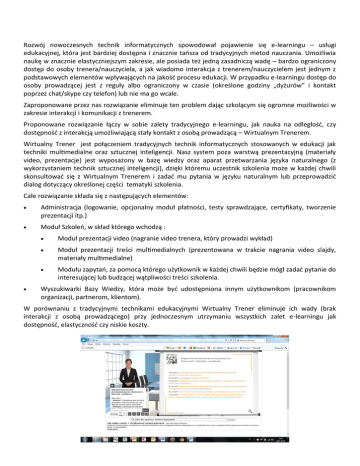 idea Rozwój nowoczesnych technik informatycznych spowodował pojawienie się e-learningu – usługi edukacyjnej, która jest bardziej dostępna i znacznie tańsza od tradycyjnych metod nauczania. Umożliwia naukę w znacznie elastyczniejszym zakresie, ale posiada też jedną zasadniczą wadę – bardzo ograniczony dostęp do osoby trenera/nauczyciela, a jak wiadomo interakcja z trenerem/nauczycielem jest jednym z podstawowych elementów wpływających na jakość procesu edukacji. W przypadku e-learningu dostęp do osoby prowadzącej jest z reguły albo ograniczony w czasie (określone godziny „dyżurów” i kontakt poprzez chat/skype czy telefon) lub nie ma go wcale. Zaproponowane przez nas rozwiązanie eliminuje ten problem dając szkolącym się ogromne możliwości w zakresie interakcji i komunikacji z trenerem. Proponowane rozwiązanie łączy w sobie zalety tradycyjnego e-learningu, jak nauka na odległość, czy dostępność z interakcją umożliwiającą stały kontakt z osobą prowadzącą – Wirtualnym Trenerem. Wirtualny Trener jest połączeniem tradycyjnych technik informatycznych stosowanych w edukacji jak techniki multimedialne oraz sztucznej inteligencji. Nasz system poza warstwą prezentacyjną (materiały video, prezentacje) jest wyposażony w bazę wiedzy oraz aparat przetwarzania języka naturalnego (z wykorzystaniem technik sztucznej inteligencji), dzięki któremu uczestnik szkolenia może w każdej chwili skonsultować się z Wirtualnym Trenerem i zadać mu pytania w języku naturalnym lub przeprowadzić dialog dotyczący określonej części tematyki szkolenia. Całe rozwiązanie składa się z następujących elementów: Administracja (logowanie, opcjonalny moduł płatności, testy sprawdzające, certyfikaty, tworzenie prezentacji itp.) Moduł Szkoleń, w skład którego wchodzą : Moduł prezentacji video (nagranie video trenera, który prowadzi wykład) Moduł prezentacji treści multimedialnych (prezentowana w trakcie nagrania video slajdy, materiały multimedialne) Modułu zapytań, za pomocą którego użytkownik w każdej chwili będzie mógł zadać pytanie do interesującej lub budzącej wątpliwości treści szkolenia. Wyszukiwarki Bazy Wiedzy, która może być udostępniona innym użytkownikom (pracownikom organizacji, partnerom, klientom). W porównaniu z tradycyjnymi technikami edukacyjnymi Wirtualny Trener eliminuje ich wady (brak interakcji z osobą prowadzącego) przy jednoczesnym utrzymaniu wszystkich zalet e-learningu jak dostępność, elastyczność czy niskie koszty. niski koszt uruchomienia i utrzymania, implementacja w 1 dzień roboczy, minimalne zaangażowanie pracowników działanie Wirtualny Awatar (postać video można skorzystać z gotowego nagrania lub nagrać „prawdziwego” trenera), prezentuje treść wykładu. Treść wykładu jest wypowiadana w formie głosowej (nagranie audio lub syntezator) oraz w formie tekstowej poniżej. Za pomocą klawiszy sterujących użytkownik może łatwo poruszać się po treści szkolenia, zatrzymywać je i wznawiać. Obok w oknie prezentowane są slajdy wykładu—mogą to być dowolne treści multimedialne— prezentacja Power Point, film, grafika, Flash. W każdej chwili uczestnik szkolenia może przerwać „Wykładowcy” i zadać pytanie do bazy wiedzy. Zastosowanie sztucznej inteligencji umożliwia dowolny sposób formułowania pytania. Mechanizm przetwarzania języka naturalnego „zrozumie” dowolną formę pytania. Na ekranie powyżej zaprezentowano pytanie użytkownika „Co zrobić aby ograniczyć działania niepożądane”, na które system odpowiada faktem „Jak sobie radzić z działaniami niepożądanymi”. niski koszt uruchomienia i utrzymania, implementacja w 1 dzień roboczy, minimalne zaangażowanie pracowników działanie Opcjonalnie użytkownik może połączyć się za pomocą live chata z twórcą szkolenia i skonsultować ważne dla niego kwestie. Po zakończeniu rozmowy zadane pytania oraz udzielone odpowiedzi mogą być automatycznie (lub po zatwierdzeniu przez administratora) przeindeksowane i umieszczone w bazie wiedzy WT. W ten sposób każda interakcja z „prawdziwym” wykładowcą będzie wzbogacała i poszerzała bazę wiedzy Wirtualnego Trenera. Za pomocą Panelu Administracyjnego można tworzyć nowe wykłady (prezentacje), budować listy uczestników, konfigurować pre-testy i post-testy oraz przygotowywać dokumenty certyfikacyjne. niski koszt uruchomienia i utrzymania, implementacja w 1 dzień roboczy, minimalne zaangażowanie pracowników