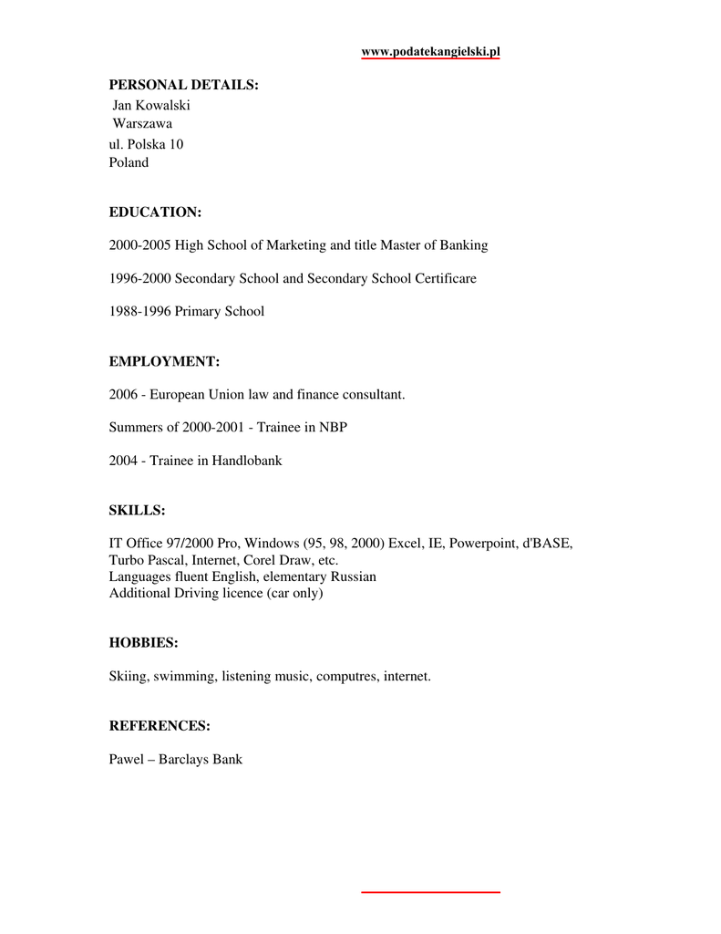 www.podatekangielski.pl PERSONAL DETAILS: Jan Kowalski Warszawa ul. Polska 10 Poland EDUCATION: 2000-2005 High School of Marketing and title Master of Banking 1996-2000 Secondary School and Secondary School Certificare 1988-1996 Primary School EMPLOYMENT: 2006 - European Union law and finance consultant. Summers of 2000-2001 - Trainee in NBP 2004 - Trainee in Handlobank SKILLS: IT Office 97/2000 Pro, Windows (95, 98, 2000) Excel, IE, Powerpoint, d'BASE, Turbo Pascal, Internet, Corel Draw, etc. Languages fluent English, elementary Russian Additional Driving licence (car only) HOBBIES: Skiing, swimming, listening music, computres, internet. REFERENCES: Pawel – Barclays Bank