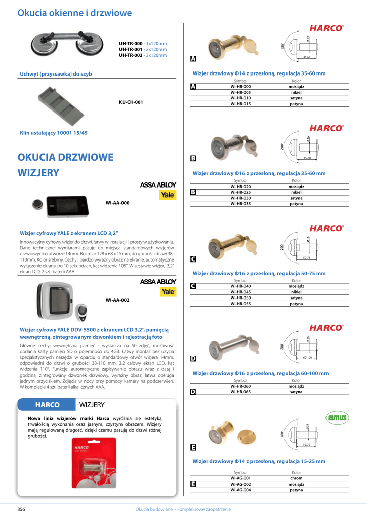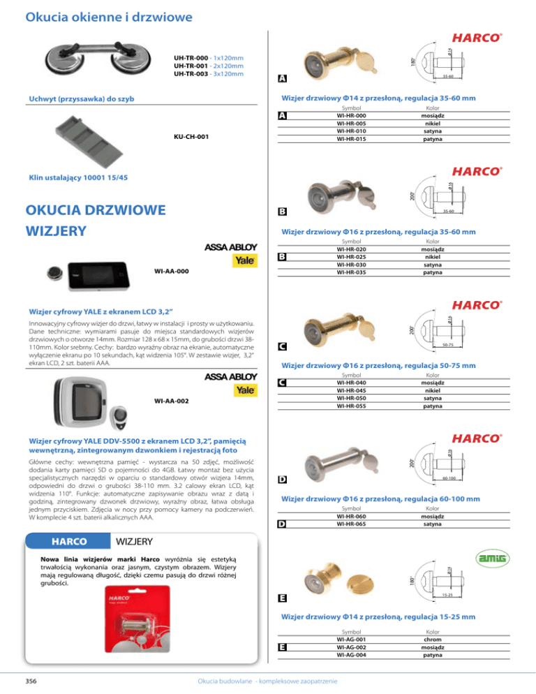 Okucia okienne i drzwiowe UH-TR-000 - 1x120mm UH-TR-001 - 2x120mm UH-TR-003 - 3x120mm 180 14 ® A 35-60 Wizjer drzwiowy Φ14 z przesłoną, regulacja 35-60 mm Uchwyt (przyssawka) do szyb A KU-CH-001 Symbol WI-HR-000 WI-HR-005 WI-HR-010 WI-HR-015 Kolor mosiądz nikiel satyna patyna ® 200 16 Klin ustalający 10001 15/45 OKUCIA DRZWIOWE WIZJERY B 35-60 Wizjer drzwiowy Φ16 z przesłoną, regulacja 35-60 mm B WI-AA-000 Symbol WI-HR-020 WI-HR-025 WI-HR-030 WI-HR-035 Kolor mosiądz nikiel satyna patyna ® 200 Innowacyjny cyfrowy wizjer do drzwi, łatwy w instalacji i prosty w użytkowaniu. Dane techniczne: wymiarami pasuje do miejsca standardowych wizjerów drzwiowych o otworze 14mm. Rozmiar 128 x 68 x 15mm, do grubości drzwi 38110mm. Kolor srebrny. Cechy: bardzo wyraźny obraz na ekranie, automatyczne wyłączenie ekranu po 10 sekundach, kąt widzenia 105°. W zestawie wizjer, 3,2“ ekran LCD, 2 szt. baterii AAA. 16 Wizjer cyfrowy YALE z ekranem LCD 3,2” C 50-75 Wizjer drzwiowy Φ16 z przesłoną, regulacja 50-75 mm C WI-AA-002 Symbol WI-HR-040 WI-HR-045 WI-HR-050 WI-HR-055 Kolor mosiądz nikiel satyna patyna ® HARCO 200 Główne cechy: wewnętrzna pamięć - wystarcza na 50 zdjęć, możliwość dodania karty pamięci SD o pojemności do 4GB. Łatwy montaż bez użycia specjalistycznych narzędzi w oparciu o standardowy otwór wizjera 14mm, odpowiedni do drzwi o grubości 38-110 mm. 3.2 calowy ekran LCD, kąt widzenia 110°. Funkcje: automatyczne zapisywanie obrazu wraz z datą i godziną, zintegrowany dzwonek drzwiowy, wyraźny obraz, łatwa obsługa jednym przyciskiem. Zdjęcia w nocy przy pomocy kamery na podczerwień. W komplecie 4 szt. baterii alkalicznych AAA. 16 Wizjer cyfrowy YALE DDV-5500 z ekranem LCD 3,2”, pamięcią wewnętrzną, zintegrowanym dzwonkiem i rejestracją foto D 60-100 Wizjer drzwiowy Φ16 z przesłoną, regulacja 60-100 mm D Symbol WI-HR-060 WI-HR-065 Kolor mosiądz satyna WIZJERY 180 14 Nowa linia wizjerów marki Harco wyróżnia się estetyką trwałością wykonania oraz jasnym, czystym obrazem. Wizjery mają regulowaną długość, dzięki czemu pasują do drzwi różnej grubości. E 15-25 Wizjer drzwiowy Φ14 z przesłoną, regulacja 15-25 mm E 356 Symbol WI-AG-001 WI-AG-002 WI-AG-004 Okucia budowlane - kompleksowe zaopatrzenie Kolor chrom mosiądz patyna 200 180 14 16 Okucia okienne i drzwiowe F 60-85 35-55 Wizjer drzwiowy Φ16 z przesłoną, regulacja 60-85 mm Wizjer drzwiowy Φ14 z przesłoną, regulacja 35-55 mm, patyna WI-SW-201 Kolor chrom satyna mosiądz 180 14 F Symbol WI-AG-003 WI-AG-006 180 14 35-55 Wizjer drzwiowy Φ14 z przesłoną, regulacja 35-55 mm, chrom G WI-SW-199 25-40 Wizjer drzwiowy Φ14 z przesłoną, regulacja 25-40 mm 16 Kolor mosiądz nikiel 180 G Symbol WI-HI-000 WI-HI-001 I 40-70 14 Wizjer drzwiowy Φ16 z przesłoną, regulacja 40-70 mm 180 I 35-50 Symbol WI-SW-202 WI-SW-203 WI-SW-204 Kolor mosiądz chrom patyna Wizjer drzwiowy Φ14 z przesłoną, regulacja 35-50 mm, mosiądz 180 27 WI-HI-002 14 J Wizjer drzwiowy Φ27 z przesłoną, regulacja 40-70 mm 180 H 35-50 J Wizjer drzwiowy Φ14 z przesłoną, regulacja 35-50 mm Kolor satyna chrom Symbol WI-SW-300 WI-SW-301 WI-SW-302 WI-SW-303 WI-SW-304 Kolor patyna mosiądz chrom satyna nikiel satyna chrom 180 27 H Symbol WI-KW-000 WI-KW-002 40-70 200 16 K 60-90 Wizjer drzwiowy Φ27 z przesłoną, regulacja 60-90 mm 35-50 Wizjer drzwiowy Φ16 z przesłoną, regulacja 35-50 mm, chrom K Symbol WI-SW-320 WI-SW-322 WI-SW-323 Kolor patyna mosiądz nikiel satyna 180 27 WI-KW-005 180 14 L 80-120 Wizjer drzwiowy Φ27 z przesłoną, regulacja 80-120 mm 35-55 Wizjer drzwiowy Φ14 z przesłoną, regulacja 35-55 mm, mosiądz L WI-SW-200 www.sparta.com.pl Symbol WI-SW-340 WI-SW-341 WI-SW-343 WI-SW-344 Kolor patyna mosiądz nikiel satyna chrom 357 Okucia okienne i drzwiowe ODBOJNIKI HARCO ® OD-HR-025 - satyna OD-HR-030 - patyna ODBOJNIKI Nowa linia odbojników marki Harco. Nowoczesne wzornictwo. Odbojnik SP113 Wymiar podstawy 25x25 mm, wysokość 35 mm. ® OD-HR-035 Odbojnik SP114, satyna Wymiar podstawy 20x20 mm, wysokość 30 mm. ® ® OD-HR-000 OD-HR-050 - satyna OD-HR-055 - patyna Odbojnik SP109, aluminiowy Odbojnik leżący Wymiar podstawy 030 mm, wysokość 36 mm. Wymiar podstawy 090 mm, wysokość 42 mm. ® ® OD-HR-005 OD-HR-100 Odbojnik SP110, aluminiowy Odbojnik drzwiowy magnetyczny HARCO 30, nikiel satyna Wymiar podstawy 030 mm, wysokość 38 mm. ® Wymiar podstawy 25mm x 48mm, odbój 48mm x 28mm. Bardzo eleganckie wykonanie, niewidoczne śruby montażowe. ® OD-HR-010 OD-HR-110 Odbojnik SP115, stal nierdzewna Wymiar podstawy 030 mm, wysokość 44 mm. Odbojnik ścienny HARCO, nikiel satyna ® ® OD-HR-015 OD-HR-040 - satyna OD-HR-045 - patyna Odbojnik SP116, stal nierdzewna Odbojnik przykręcany SP126 Wymiar podstawy 030 mm, wysokość 36 mm. Wymiar podstawy 044 mm, wysokość 26 mm. ® OD-HR-020 OD-SC-003 - satyna OD-SC-004 - patyna OD-SC-005 - mosiądz OD-SC-006 - chrom Odbojnik SP117, stal nierdzewna Odbojnik drzwiowy przykręcany półkula Wymiar podstawy 025 mm, wysokość 43 mm. Wymiar podstawy 045 mm, wysokość 23 mm. 358 Okucia budowlane - kompleksowe zaopatrzenie Okucia okienne i drzwiowe OD-DO-030 OD-SC-000 - patyna OD-SC-001 - satyna OD-SC-002 - mosiądz Odbojnik drzwiowy samoprzylepny półkula Odbojnik niski, stal nierdzewna Wymiar podstawy 045 mm, wysokość 23 mm. Wymiar podstawy 028 mm, wysokość 30 mm. OD-WA-203 - chrom OD-WA-204 - złoty OD-WA-205 - brązowy OD-WA-206 - biały Odbojnik drzwiowy samoprzylepny Wymiar podstawy 049 mm, wysokość 22 mm. OD-WA-100 - biały OD-WA-101 - brązowy OD-WA-102 - czarny OD-WA-103 - złoty OD-WA-104 - srebrny Odbojnik drzwiowy aluminiowy Wymiar podstawy 035 mm, wysokość 37 mm. OD-KR-010 - mosiądz OD-KR-011 - nikiel Odbojnik drzwiowy Wymiar podstawy 039 mm, wysokość 40 mm. OD-SW-000 - mosiądz OD-SW-001 - chrom/satyna OD-SW-002 - patyna Odbojnik drzwiowy Wymiar podstawy 034 mm, wysokość 38 mm. OD-DO-011 - brąz OD-DO-012 - ni