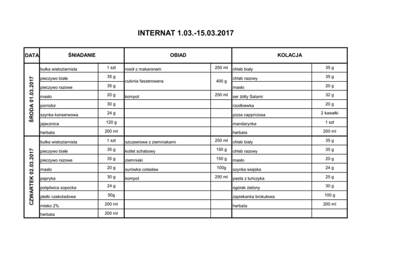 INTERNAT 1.03.-15.03.2017 ŚNIADANIE CZWARTEK 02.03.2017 ŚRODA 01.03.2017 DATA OBIAD bułka wieloziarnista 1 szt pieczywo białe 35 g pieczywo razowe 35 g masło 20 g pomidor KOLACJA rosół z makaronem 250 ml chleb biały 35 g cukinia faszerowana 400 g chleb razowy 35 g masło 20 g ser żółty Salami 32 g 30 g rzodkiewka 20 g szynka konserwowa 24 g pizza cappriciosa jajecznica 120 g mandarynka herbata 200 ml herbata kompot 250 ml 2 kawałki 1 szt 200 ml bułka wieloziarnista 1 szt szczawiowa z ziemniakami 250 ml chleb biały 35 g pieczywo białe 35 g kotlet schabowy 150 g chleb razowy 35 g pieczywo razowe 35 g ziemniaki 150 g masło 20 g masło 20 g surówka colesław 100g szynka wiejska 24 g papryka 30 g kompot pasta z tuńczyka 25 g polędwica sopocka 24 g ogórek zielony 30 g płatki czekoladowe 50g zapiekanka brokułowa 100 g herbata 200 ml mleko 2% 200 ml herbata 200 ml 250 ml ŚNIADANIE PIĄTEK 03.03.2017 DATA OBIAD KOLACJA bułka wieloziarnista 1 szt ogórkowa z ziemniakami 250 ml pieczywo białe 35 g łazanki z kapustą i grzybami 400 g pieczywo razowe 35 g kompt 250 ml masło 20 g pomidor 30 g szynka drobiowa 24 g twarożek ze szczyp. 25 g parówka 36 g herbata 200 ml ALERGENY: Zboża zawierające gluten (tj. pszenica, żyto, jęczmień, owies, orkisz oraz produkty pochodne), jaja i produkty pochodne, ryby i produkty pochodne, orzeszki ziemne, orzeszki arachidowe, i produkty pochodne, soję i produkty pochodne, mleko i produkty pochodne, orzechy tj. migdały, orzechy laskowe, włoskie, nerkowca, brazylijskie, pistacjowe, makadamia i produkty pochodne, seler i produkty pochodne, nasiona sezamu i produkty pochodne, łubin i produkty pochodne, dwutlenek siarki i siarczyny w stężeniach powyżej 10mg/kg lub 10mg/l w przeliczeniu na SO2 ŚNIADANIE WTOREK 7.03.2017 PONIEDZIAŁEK 06.03.2017 DATA OBIAD KOLACJA bułka wieloziarnista 1 szt pieczarkowa z makaronem 250 ml chleb biały 35 g pieczywo białe 35 g pałka panierowana 150 g chleb razowy 35 g pieczywo razowe 35 g ziemniaki 150 g masło 20 g masło 20 g surówka z białej kapusty bez majonezu 100 g ser żółty Gouda 32 g papryka 30 g kompot 250 ml pomidor 30 g szynka konserwowa 24 g dżem 50 g płatki kukurydziane 50 g naleśniki 150 g mleko 2% 200 ml jabłko 150 g herbata 200 ml herbata 200 ml bułka wieloziarnista 1 szt Krupnik z kaszy jęczmiennej 250 ml chleb biały 35 g pieczywo białe 35 g Kotlet mielony 150 g chleb razowy 35 g pieczywo razowe 35 g ryż biały z ziołami 150 g masło 20 g masło 20 g surówka z czerwonej kapusty z majonezem 100 g szynka drobiowa 24 g ogórek zielony 30 g kompot 20 ml serek topiony 25 g szynka wiejska 24 g papryka 20 g twaróg 20 g sałata lodowa 20 g zupa mleczna 200 ml kiełbasa talarki z cebulką 150 g herbata 200 ml jabłko 160 g herbata 200 ml ŚNIADANIE CZWARTEK 9.03.2017 ŚRODA 8.03.2017 DATA OBIAD KOLACJA bułka wieloziarnista 1 szt Brokułowa z makaronem 250 ml chleb biały 35 g pieczywo białe 35 g Łopatka duszona 150 g chleb razowy 35 g pieczywo razowe 35 g Kasza gryczana 150 g masło 20 g masło 20 g Buraczki z chrzanem 100g szynka wiejska 32 g pomidor 30 g kompot racychy z cukrem pudrem 150 g szynka konserwowa 24 g dżem 40 g serek topiony 25 g papryka 30 g jajecznica 120 g mandarynka 1 szt herbata 200 ml herbata 250 ml 200 ml bułka wieloziarnista 1 szt Pomidorowa z makaronem 250 ml chleb biały 35 g pieczywo białe 35 g Filet panierowany 150 g chleb razowy 35 g pieczywo razowe 35 g ziemniaki 150 g masło 20 g masło 20 g surówka colesław 100 g ser żółty Mlekdamer 32 g ogórek zielony 30 g kompot 250 ml pomidor 30 g poledwica sopocka 24 g kaszanka na ciepło 200 g pasta z tuńczyka 25 g jogurt owocowy 150 g parówka 70 g herbata 200 ml herbata 200 ml ŚNIADANIE PIĄTEK 10.03.2017 DATA OBIAD KOLACJA bułka wieloziarnista 1 szt Żurek z jajkiem 250 ml pieczywo białe 35 g Ryba panierowana 150 g pieczywo razowe 35 g ziemniaki 150 g masło 20 g Surówka z kiszonej kapusty 100 g papryka 30 g Kompot 250 ml szynka wiejska 24 g płatki czekoladowe 50 g mleko 2% 200 ml herbata 200 ml ALERGENY: Zboża zawierające gluten (tj. pszenica, żyto, jęczmień, owies, orkisz oraz produkty pochodne), jaja i produkty pochodne, ryby i produkty pochodne, orzeszki ziemne, orzeszki arachidowe, i produkty pochodne, soję i produkty pochodne, mleko i produkty pochodne, orzechy tj. migdały, orzechy laskowe, włoskie, nerkowca, brazylijskie, pistacjowe, makadamia i produkty pochodne, seler i produkty pochodne, nasiona sezamu i produkty pochodne, łubin i produkty pochodne, dwutlenek siarki i siarczyny w stężeniach powyżej 10mg/kg lub 10mg/l w przeliczeniu na SO2 ŚNIADANIE WTOREK 14.03.2017 PONIEDZIAŁEK 13.03.2017 DATA OBIAD KOLACJA bułka wieloziarnista 1 szt Jarzynowa z makaronem 250 ml chleb biały 35 g pieczywo białe 35 g Spaghetti z sosem bolognese 400 g chleb razowy 35 g pieczywo razowe 35 g kompot 250 ml masło 20 g masło 20 g szynka konserwowa 24 g 30 ogórek zielony 30 g polędwica sopocka 24 g serek topiony 20 g płatki czekoladowe 50 g zapiekanka ziemniaczana 150 g pomidor mleko 2% 200 ml jabłko 150 g herbata 200 ml herbata 200 ml bułka wieloziarnista 1 szt Grochowa 250 ml chleb biały 35 g pieczywo białe 35 g Udko pieczone 150 g chleb razowy 35 g pieczywo razowe 35 g Ziemniaki 150 g masło 20 g masło 20 g surówka z czerwonej kapsty z majonezem 100 g szynka wiejska 24 g rzodkiewka 30 g 20 ml serek topiony 25 g Ser żółty Gouda 32 g papryka 30 g jajecznica 120 g pizza domowa jabłko 150 g herbata herbata 200 ml 2 kawałki 160 g ŚNIADANIE ŚRODA 15.03.2017 DATA OBIAD KOLACJA bułka wieloziarnista 1 szt Krupik z ryżu 250 ml chleb biały 35 g pieczywo białe 35 g Karczek duszony w sosie 150 g chleb razowy 35 g pieczywo razowe 35 g Kasza jęczienna 150 g masło 20 g masło 20 g Surówka z białej kapusty z majonezem 100g Ser żółty Salami 32 g ogórek zielony 30 g naleśniki 150 g szynka konserwowa 24 g twarożek na słodko 40 g płatki kukurydziane 50 g papryka 30 g 1 sz