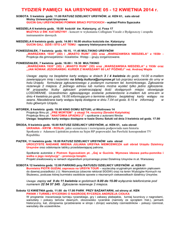 TYDZIEŃ PAMIĘCI NA URSYNOWIE 05 - 12 KWIETNIA 2014 r. SOBOTA 5 kwietnia godz. 11.00 RATUSZ DZIELNICY URSYNÓW, al. KEN 61, sala obrad Wolny Uniwersytet Ursynowa GUCIN GAJ URSYNOWSKI POMNIK BRACI POTOCKICH - wykład Piotra Sypczuka NIEDZIELA 6 kwietnia godz. 19.00 kościół św. Katarzyny, ul. Fosa 17 MUZYKA U ŚW. KATARZYNY - koncert w wykonaniu Collegium Vocale z Bydgoszczy i zespołu instrumentów dawnych NIEDZIELA 6 kwietnia godz. godz. 14.00 i 16.00 okolice kościoła św. Katarzyny GUCIN GAJ, DZIŚ I STO LAT TEMU - spacery historyczno-krajoznawcze PONIEDZIAŁEK, 7 kwietnia godz. 10.15, 11.45 MULTIKINO URSYNÓW „WARSZAWA 1935” (3D) i „MIASTO RUIN” (3D) oraz „WARSZAWSKA NIEDZIELA” z 1938r Projekcja dla gimnazjalistów i licealistów. Wstęp – grupy zorganizowane. PONIEDZIAŁEK, 7 kwietnia godz. 18.00 i 19.30 MULTIKINO „WARSZAWA 1935” (3D) i „MIASTO RUIN” (3D) oraz „WARSZAWSKA NIEDZIELA” z 1938r oraz „JAN NOWAK JEZIORAŃSKI. KURIER Z WARSZAWY 60 LAT PÓŹNIEJ” reż. Andrzej Wajda Uwaga: zapisy na bezpłatne karty wstępu w dniach 3 i 4 kwietnia do godz. 14.00 e-mailem zawierającym imię i nazwisko na [email protected] lub poprzez wrzucenie do urny w holu Urzędu formularza zgłoszeniowego z podanym numerem tel. komórkowego. Zgłoszenie rezerwuje 2 miejsca. Z jednego adresu lub numeru można wysłać tylko jedno zgłoszenie. W przypadku liczby zgłoszeń przekraczającej ilość dostępnych miejsc obowiązuje LOSOWANIE. Uczestnictwo zgłaszającego zostanie potwierdzone e-mailem lub sms-em w dniu 4 kwietnia po godz. 16.00 informującym o terminie odbioru bezpłatnej karty wstępu na seans. Nieodebrane karty wstępu będą dostępne w dniu 7.04 od godz. 8.15 w informacji w holu głównym Urzędu. WTOREK, 8 kwietnia godz. 19.00 KINO DOMU SZTUKI, ul Wiolinowa 14 Projekcja filmu pt. „PRE MORTEM” z okazji 74. rocznicy Zbrodni Katyńskiej Projekcja filmu pt. "ANATOMIA UPADKU 2" i spotkanie z autorami filmów Uwaga: bezpłatne karty wstępu dostępne w kasie Domu Sztuki od dnia 3 kwietnia od godz. 17.00 ŚRODA, 9 kwietnia godz. 18.00 RATUSZ DZIELNICY URSYNÓW, al. KEN 61, sala obrad UKRAINA - KRYM - ROSJA: jakie scenariusze i rozwiązania podpowiada nam historia Spotkanie z Adamem Lipińskim posłem na Sejm RP poprowadzi Jan Pawlicki korespondent TV Republika PIĄTEK, 11 kwietnia godz. 18.00 RATUSZ DZIELNICY URSYNÓW sala obrad UROCZYSTE NADANIE IMIENIA JULIANA URSYNA NIEMCEWICZA sali obrad Urzędu Dzielnicy Ursynów oraz odsłonięcie tablicy przedstawiającej patrona. Spotkanie autorskie z Piotrem Sypczukiem pt. „Gaj w Gucinie. Wymowa ideowa parku-pomnika i walka o jego restytucję” - promocja książki. Projekt zrealizowany w ramach stypendium przyznanego przez Dzielnicę Ursynów m.st. Warszawy SOBOTA 12 kwietnia godz. 12.00 PARKING przy RATUSZU DZIELNICY URSYNÓW al. KEN 61 Burmistrz PIOTR GUZIAŁ zaprasza na URSYN TOUR – wycieczkę oryginalnym angielskim piętrusem do dawnej posiadłości J.U. Niemcewicza (obecnie rektorat SGGW) oraz na teren Wyścigów Konnych na Służewcu, podczas której burmistrz osobiście opowie o nieznanych ciekawostkach dzielnicy Ursynów. Uwaga: zapisy od 9 do 11 kwietnia w godzinach 9.00 do 15.00 wyłącznie telefonicznie pod numerem 22 54 57 245. Zgłoszenie rezerwuje 2 miejsca. Sobota 12 KWIETNIA godz. 11.00 do 17.00 PARK PRZY BAŻANTARNI, od strony al. KEN PIKNIK I TURNIEJ RYCERSKI O NAGRODĘ RYCERZA ANDRZEJA CIOŁKA W programie: inscenizacja turnieju rycerskiego, gry i zabawy plebejskie, turniej łuczniczy z nagrodami, warsztaty i pokazy tańców dawnych, obozowisko rycerskie (namioty ze sprzętem hist.), jarmark historyczny, kat, zbrojownia (przebieranie w stroje i zbroje) warsztaty rzemieślników - pokazy rzemiosł, warsztaty dla uczestników.