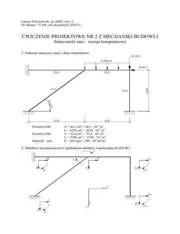 Łukasz Faściszewski, gr. KBI2, sem. 2, Nr albumu: 75 201; rok akademicki 2010/11. ĆWICZENIE PROJEKTOWE NR 2 Z MECHANIKI BUDOWLI Stateczność ram – wersja komputerowa 1. Schemat statyczny ramy i dane materiałowe Przekrój I240: Przekrój I260: Materiał – stal: A = 46,1 cm2 = 46,1 · 10-4 m2 Ix = 4250 cm4 = 4250 · 10-8 m4 A = 53,4 cm2 = 53,4 · 10-4 m2 Ix = 5740 cm4 = 5740 · 10-8 m4 E = 205 Gpa = 205 · 106 kN/m2 2. Składowe przemieszczeń w globalnym układzie współrzędnych (GUW) 3. Rozkład sił normalnych w prętach od zadanego obciąŜenia zewnętrznego Obliczenia wykonano za pomocą programo RM-Win v9.18: N1 = -9,652 kN, N3 = -79,571 kN, N2 = -72,006 kN, N4 = -63,068 kN. 4. Macierze sztywności i obciąŜeń węzłowych prętów w lokalnych układach współrzędnych (LUW) oraz globalnym (GUW) Współczynniki macierzy są obliczane dla danych w jednostkach zawierających [kN] i [m]. – pręt nr 1 – I240, utwierdzony z przegubem po prawej stronie: Macierz sztywności w LUW: | | | | | | 147592.01 0. 0. - 147592.01 0. 0. 0. 99.560773 637.5 0. - 99.560773 0. 0. 637.5 4081.9917 0. - 637.5 0. - 147592.01 0. 0. 147592.01 0. 0. 0. - 99.560773 - 637.5 0. 99.560773 0. 0. 0. 0. 0. 0. 0. | | | | | | Macierz sztywności geometrycznej w LUW: | | | | | | 0. 0. 0. 0. 0. 0. 0. - 1.808867 - 1.9304 0. 1.808867 0. 0. - 1.9304 - 12.360591 0. 1.9304 0. 0. 0. 0. 0. 0. 0. 0. 0. 0. 0. 1.808867 1.9304 0. - 1.808867 0. 0. 0. 0. 0. 0. 0. | | | | | | Wektor sił przywęzłowych od obciąŜenia: | , 0. 0. 0. | Układ wymaga transformacji, poniewaŜ LUW i GUW nie pokrywają się – obrót o kąt α = 321,340º, zgodnie z poniŜszym prawem: · · , · , · · Macierz transformacji pręta: | | | | | | 0.7808667 0.6246977 0. 0. 0. 0. - 0.6246977 0.7808667 0. 0. 0. 0. 0. 0. 1. 0. 0. 0. 0. 0. 0. 0.7808667 0.6246977 0. 90033.502 - 71947.646 398.24476 - 90033.502 71947.646 0. - 71947.646 57658.073 497.80253 71947.646 - 57658.073 0. 398.24476 497.80253 4081.9917 - 398.24476 - 497.80253 0. - 90033.502 71947.646 - 398.24476 90033.502 - 71947.646 0. Macierz sztywności geometrycznej w GUW: | | | | | | - 0.7059052 - 0.8823755 - 1.2059164 0.7059052 0.8823755 0. - 0.8823755 - 1.1029618 - 1.5073851 0.8823755 1.1029618 0. - 1.2059164 - 1.5073851 - 12.360591 1.2059164 1.5073851 0. 0. 0. | | | | | | 0. 71947.646 - 57658.073 - 497.80253 - 71947.646 57658.073 0. 0. 0. 0. 0. 0. 0. | | | | | | 0.8823755 1.1029618 1.5073851 - 0.8823755 - 1.1029618 0. 0. 0. 0. 0. 0. 0. | | | | | | , 0.7059052 0.8823755 1.2059164 - 0.7059052 - 0.8823755 0. Wektor sił przywęzłowych w GUW: | 0. 0. 0. 0. 0. 1. Macierz sztywności w GUW: | | | | | | 0. 0. 0. - 0.6246977 0.7808667 0. 0. 0. 0. | – pręt nr 2 – I260, obustronnie utwierdzony: Macierz sztywności w LUW: | | | | | | 218940. 0. 0. - 218940. 0. 0. 0. 1129.632 2824.08 0. - 1129.632 2824.08 0. 2824.08 9413.6 0. - 2824.08 4706.8 - 218940. 0. 0. 218940. 0. 0. 0. 0. 0. 0. 0. 0. 0. - 17.28144 - 7.2006 0. 17.28144 - 7.2006 0. 0. 0. 0. 0. 0. 0. 17.28144 7.2006 0. - 17.28144 7.2006 Wektor sił przywęzłowych od obciąŜenia: | 0. 0. - 7.2006 - 48.004 0. 7.2006 12.001 0. 0. 0. 0. 2824.08 4706.8 0. - 2824.08 9413.6 | | | | | | , Macierz sztywności geometrycznej w LUW: | | | | | | 0. - 1129.632 - 2824.08 0. 1129.632 - 2824.08 0. 0. 0. - 7.2006 12.001 0. 7.2006 - 48.004 | | | | | | | Układ nie wymaga transformacji, poniewaŜ LUW i GUW pokrywają się – obrót o kąt α = 0,000º, zgodnie z poniŜszym prawem: , , Macierz sztywności w GUW: | | | | | | 218940. 0. 0. - 218940. 0. 0. 0. 1129.632 2824.08 0. - 1129.632 2824.08 0. 2824.08 9413.6 0. - 2824.08 4706.8 - 218940. 0. 0. 218940. 0. 0. Macierz sztywności geometrycznej w GUW: | | | | | | 0. 0. 0. 0. 0. 0. 0. - 17.28144 - 7.2006 0. 17.28144 - 7.2006 0. - 7.2006 - 48.004 0. 7.2006 12.001 0. 0. 0. 0. 0. 0. 0. - 1129.632 - 2824.08 0. 1129.632 - 2824.08 0. 2824.08 4706.8 0. - 2824.08 9413.6 , 0. 17.28144 7.2006 0. - 17.28144 7.2006 0. - 7.2006 12.001 0. 7.2006 - 48.004 | | | | | | | | | | | | Wektor sił przywęzłowych w GUW: | 0. 0. 0. 0. 0. 0. | – pręt nr 3 – I260, obustronnie utwierdzony: Macierz sztywności w LUW: | | | | | | 273675. 0. 0. - 273675. 0. 0. 0. 2206.3125 4412.625 0. - 2206.3125 4412.625 0. 4412.625 11767. 0. - 4412.625 5883.5 - 273675. 0. 0. 273675. 0. 0. 0. 0. 0. 0. 0. 0. 0. - 23.8713 - 7.9571 0. 23.8713 - 7.9571 0. - 7.9571 - 42.437867 0. 7.9571 10.609467 0. 0. 0. 0. 0. 0. 0. 23.8713 7.9571 0. - 23.8713 7.9571 0. 0. 0. 0. | | | | | | 0. - 7.9571 10.609467 0. 7.9571 - 42.437867 | | | | | | Wektor sił przywęzłowych od obciąŜenia: | 0. 4412.625 5883.5 0. - 4412.625 11767. Macierz sztywności geometrycznej w LUW: | | | | | | 0. - 2206.3125 - 4412.625 0. 2206.3125 - 4412.625 0. 0. | Układ nie wymaga transformacji, poniewaŜ LUW i GUW pokrywają się – obrót o kąt α = 0,000º, zgodnie z poniŜszym prawem: , , Macierz sztywności w GUW: | | | | | | 273675. 0. 0. - 273675. 0. 0. 0. 2206.3125 4412.625 0. - 2206.3125 4412.625 0. 4412.625 11767. 0. - 4412.625 5883.5 - 273675. 0. 0. 273675. 0. 0. 0. - 2206.3125 - 4412.625 0. 2206.3125 - 4412.625 0. 4412.625 5883.5 0. - 4412.625 11767. | | | | | | , Macierz sztywności geometrycznej w GUW: | | | | | | 0. 0. 0. 0. 0. 0. 0. - 23.8713 - 7.9571 0. 23.8713 - 7.9571 0. - 7.9571 - 42.437867 0. 7.9571 10.609467 0. 0. 0. 0. 0. 0. 0. 23.8713 7.9571 0. - 23.8713 7.9571 0. 0. 0. | | | | | | Wektor sił przywęzłowych w GUW: | 0. - 7.9571 10.609467 0. 7.9571 - 42.437867 0. 0. 0. | – pręt nr 4 – I240, utwierdzony z przegubem po prawej stronie: Macierz sztywności w LUW: | | | | | | 236262.5 0. 0. - 236262.5 0. 0. 0. 1633.5938 3267.1875 0. - 1633.5938 3267.1875 0. 3267.1875 8712.5 0. - 3267.1875 4356.25 - 236262.5 0. 0. 236262.5 0. 0. 0. 0. 0. 0. 0. 0. 0. - 18.9204 - 6.3068 0. 18.9204 - 6.3068 0. - 6.3068 - 33.636267 0. 6.3068 8.4090667 0. 0. 0. 0. 0. 0. 0. 18.9204 6.3068 0. - 18.9204 6.3068 Wektor sił przywęzłowych od obciąŜenia: | 0. 0. 0. 0. 3267.1875 4356.25 0. 