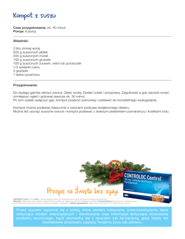 Kompot z suszu Czas przygotowania: ok. 40 minut Porcje: 6 porcji Składniki: 3 litry zimnej wody 200 g suszonych jabłek 200 g suszonych moreli 100 g suszonych gruszek 100 g suszonych żurawin, wiśni lub porzeczek 1/3 szklanki cukru 3 goździki 1 laska cynamonu Przygotowanie: Do dużego garnka włożyć owoce. Zalać wodą. Dodać cukier i przyprawy. Zagotować a gdy zacznie wrzeć zmniejszyć ogień i gotować jeszcze ok. 30 minut. Po tym czasie wyłączyć gaz, kompot przykryć pokrywką i odstawić do kompletnego wystygnięcia. Kompot można podawać klasycznie z owocami podczas świątecznego deseru. Można też usunąć suszone owoce i kompot podawać z świeżym plasterkiem pomarańczy i kostkami lodu. , Przepis na Swieta bez zgagi , CONTROLOC Control® 20 mg Skład: 1 tabletka dojelitowa zawiera 20 mg pantoprazolu (w postaci pantoprazolu sodowego półtorawodnego). Wskazania: Krótkotrwałe leczenie objawów choroby refluksowej przełyku (np. zgaga, zarzucanie treści żołądkowej) u dorosłych. Przeciwwskazania: Nadwrażliwość na substancję czynną lub na którąkolwiek substancję pomocniczą. Jednoczesne podawanie z atazanawirem. Podmiot odpowiedzialny: Takeda GmbH, Byk-Gulden-Str. 2, D-78467 Konstanz, Niemcy. Przed użyciem zapoznaj się z ulotką, która zawiera wskazania, przeciwwskazania, dane dotyczące działań niepożądanych i dawkowanie oraz informacje dotyczące stosowania produktu leczniczego, bądź skonsultuj się z lekarzem lub farmaceutą, gdyż każdy lek niewłaściwie stosowany zagraża Twojemu życiu lub zdrowiu.
