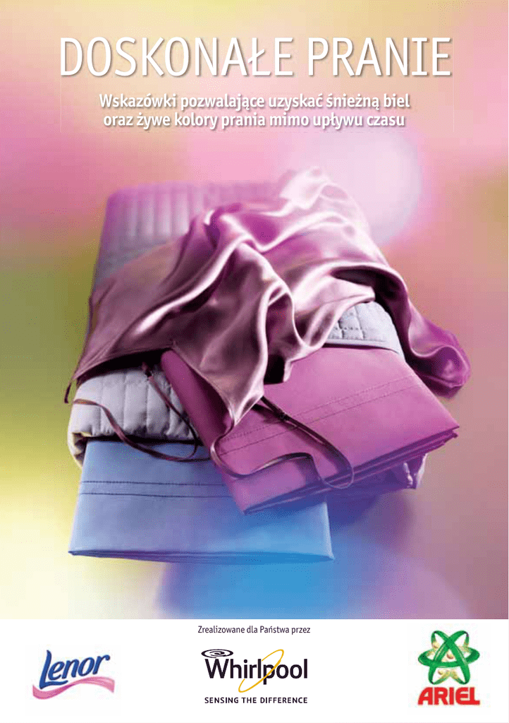 DOSKONAŁE PRANIE Wskazówki pozwalające uzyskać śnieżną biel oraz żywe kolory prania mimo upływu czasu Zrealizowane dla Państwa przez Szanowny Kliencie, Gratulujemy wyboru urządzenia marki Whirlpool! Jesteśmy pewni, że będzie ono Państwu doskonale służyć przez wiele lat. Równie ważny jest fakt, iż jego użytkowanie będzie przyjemnym doświadczeniem i uczyni Państwa życie nieco prostszym. Dzięki opracowanej przez firmę Whirlpool inteligentnej technologii 6-ty Zmysł Państwa nowa pralka potrafi rozpoznać ciężar załadunku i automatycznie dostosować optymalny cykl prania, oszczędzający zasoby oraz zapewniający wspaniałą opiekę Twoich tkanin. Oczywiście, posiadanie odpowiedniej pralki jest zaledwie pierwszym krokiem w kierunku doskonałego prania. W celu uzyskania optymalnych rezultatów warto wiedzieć, jak skutecznie sortować, przygotowywać i efektywnie zapełnić bęben pralki Twoim praniem oraz jak wybrać odpowiedni program itp. Również stosowanie właściwego detergentu i płynu zmiękczającego znacznie przyczynia się do doskonałych wyników prania. Do prania w pralce Whirlpool zalecamy stosowanie produktów Ariel i Lenor. Niniejszy skrócony przewodnik poprowadzi Państwa przez proces prania krok po kroku, dostarczając Państwu wiele przydatnych porad i wskazówek. Dzięki pralce Whirlpool, niniejszemu przewodnikowi oraz produktom Ariel i Lenor mogą się Państwo spodziewać doskonałych rezrezultatów prania za każdym razem. 2 SPIS TREŚCI 1. Przewodnik po symbolach występujących na tkaninach 4 2. Sortowanie prania 6 3. Wybór właściwych detergentów 8 4. Plamy i sposoby ich usuwania przed praniem 10 5. Zapełnianie bębna pralki 14 6. Wybór właściwego cyklu 15 7. Ekologia i pranie 16 8. Prawidłowe dozowanie 18 9. Zmiękczanie tkanin i suszenie prania 22 10. Konserwacja 24 11. Usuwanie najczęściej występujących usterek 26 3 1 PRZEWODNIK PO SYMBOLACH WYSTĘPUJĄCYCH NA TEKSTYLIACH Uzyskiwanie optymalnych rezultatów prania rozpoczyna się od właściwego rozpoznania i pielęgnacji tkanin. Przed przystąpieniem do prania dowolnej tkaniny najważniejszą rzeczą jest ustalenie, jakiego traktowania ona wymaga, poprzez zapoznanie się z symbolami umieszczonymi na metce. Poniżej zamieściliśmy skrócony przewodnik po najważniejszych symbolach. Należy pamiętać, iż liczba umieszczona wewnątrz symbolu wanny wskazuje maksymalną temperaturę, w której można bezpiecznie prać daną tkaninę. Linie pod symbolem wanny wskazują maksymalny zalecany cykl prania: brak linii w przypadku wysokiego cyklu (np. bawełna), jedna linia w przypadku średniego cyklu (np. tkaniny syntetyczne), dwie linie dla niskiego cyklu (np. wełna). Aby uniknąć uszkodzenia lub zbiegnięcia się tkaniny, nie należy nigdy przekraczać maksymalnej zalecanej temperatury lub cyklu prania. Pranie Prać w temp. 30°C Prać w temp. 30°C Prać w temp. 30°C Prać w temp. 40°C Prać w temp. 60°C (np. cykl prania tkanin bawełnianych) (np. cykl prania tkanin syntetycznych) (np. cykl prania tkanin wełnianych) 30 30 30 PRANIE WYBIELANIE (np. cykl prania tkanin (np. cykl prania bawełnianych) tkanin bawełnianych) 40 60 Prać ręcznie Nie prać Wybielanie dozwolone (chlor/tlen) / Wybielanie środkiem zawierającym wodę utlenionąą Nie stosować wybielacza Można suszyć w suszarce - Można suszyć w suszarce w niskiej temperaturze Można suszyć w suszarce w normalnej temperaturze Suszenie Suszyć na sznurze Suszyć rozłożone na płasko Suszyć poprzez odcieknięcie Profesjonalne czyszczenie Rozpuszczalniki do czyszczenia na bazie węglowodorów Nie suszyć w suszarce PORADY DOTYCZĄCE SUSZENIA Czyszczenie środkami na bazie PCE Nie prać chemicznie PRANIE CHEMICZNE PRASOWANIE 4 Prasowanie Prasować w Prasować w średniej Prasować w wysokiej niskiej temtemperaturze temperaturze peraturze 150°C 200°C 110°C Nie prasować Rozpoznawanie rodzajów tkanin Właściwe przygotowanie załadunku pralki ma kluczowe znaczenie dla udanego prania. Pierwszą kwestią, którą należy wziąć pod uwagę, jest rodzaj tkaniny każdej sztuki, którą chce się uprać. Istnieją dwie główne grupy: • Włókna naturalne pochodzenia roślinnego lub zwierzęcego (np. wełna, jedwab, len, bawełna). • Włókna sztuczne i syntetyczne, uzyskiwane bądź poprzez obróbkę włókien pochodzenia roślinnego, bądź stworzonych syntetycznie (np. wiskoza, nylon, poliester i akryl). PORADA W przypadku braku metki na tkaninie, należy zachować ostrożność i traktować tkaninę z należytą delikatnością! Patrz również punkt "Zapełnianie bębna pralki" na stronie 14. 5 2 SKUTECZNE SORTOWANIE PRANIA Wszyscy wiemy co sie stanie, gdy zostawimy na przykład czerwoną skarpetkę w białym praniu, bo każdemu z nas przydarzyło się to co najmniej raz. Wiele barwników nie zachowuje trwałości w przypadku prania w detergencie zawierającym wybielacz, więc rozsądnym rozwiązaniem jest sortowanie prania według koloru. Niektóre barwniki tracą kolor nawet w bardzo zimnej wodzie, więc bardzo ciemne lub bardzo jaskrawe rzeczy należy prać osobno, przynajmniej za pierwszym razem. Należy unikać mieszania białych i kolorowych tkanin w jednym praniu, nawet w przypadku ustawienia niskiej temperatury. PRZYKŁAD Uprane 10 razy w Proszku Ariel zawierającym wybielacz Uprane 10 razy w detergencie niezawierającym wybielacza W celu uzyskania śnieżnej bieli prania zaleca się stosowanie detergentu zawierającego wybielacz, takiego jak Proszki Ariel Uprane 10 razy w produktach Ariel Colour & Style niezawierającym wybielacza Uprane 10 razy w detergencie zawierającym wybielacz W celu zapewnienia lepszej pielęgnacji tkanin kolorowych zaleca się stosowanie detergentu niezawierającego wy wybielacza, takiego jak Kapsułki piorące Ariel i Płyny Ariel lub wariantów Proszków Ariel Colour & Style PORADA EKSPERTA RTA Niektóre enzymy białkowe zawarte w większości zwykłych detergent